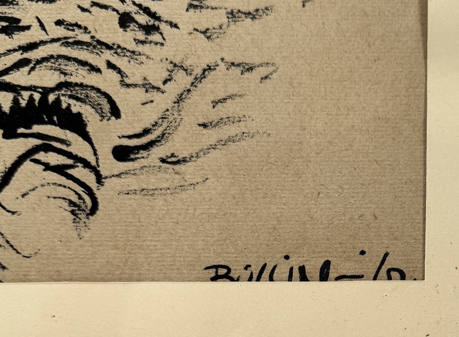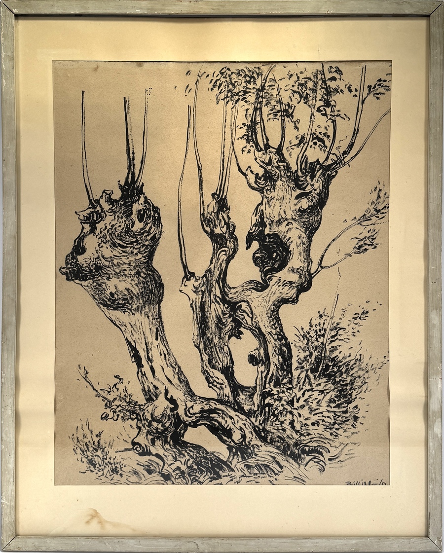 Tekening van J.H. Bolling (1918–1997), gedateerd midden 20e eeuw. Het werk is uitgevoerd in inkt op papier en toont een expressionistische weergave van knotwilgen, getiteld “Oude Wilg”. De krachtige en geaccentueerde inktlijnen kenmerken de tekening. De signatuur is rechtsonder te zien. Verso informatie. Deze tekening zelf beoordelen? Je bent welkom op onze kijkdagen op 29, 30 en 31 augustus! |
