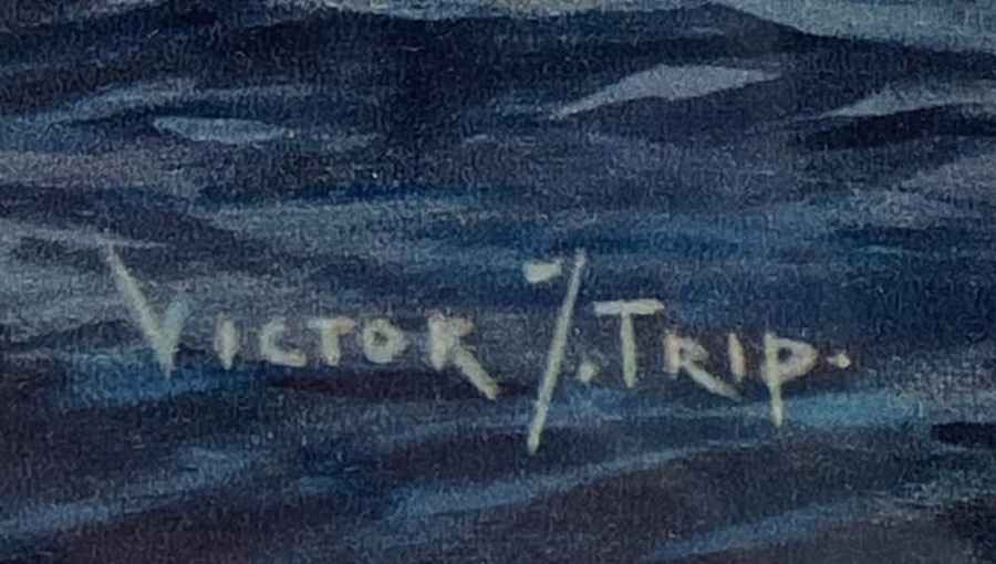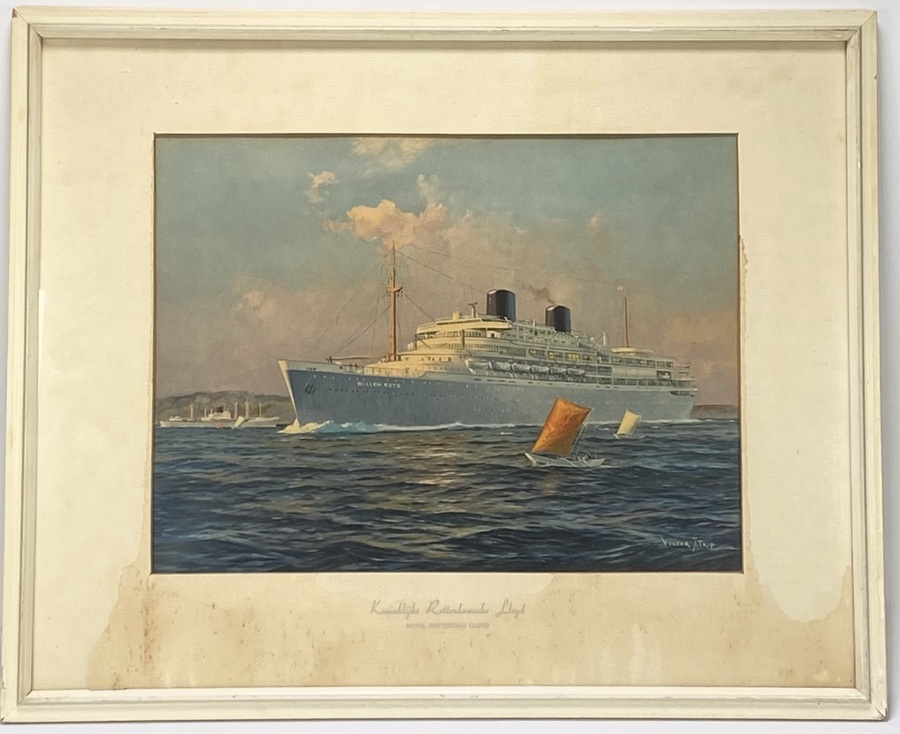 Een schilderij van Victor J. Trip (1913-1975), gedateerd midden 20e eeuw, olieverf op doek, voorstellende het stoomschip "WILLEM RUYS" van de Koninklijke Rotterdamsche Lloyd. Het maritieme werk toont het schip op open zee, omringd door golvend water en kleinere zeilboten. Rechtsonder gesigneerd "Victor J. Trip". Het is ingelijst met een bedrukte passe-partout. Klaar om te bieden? Registreer je nu en doe mee aan de veiling! |