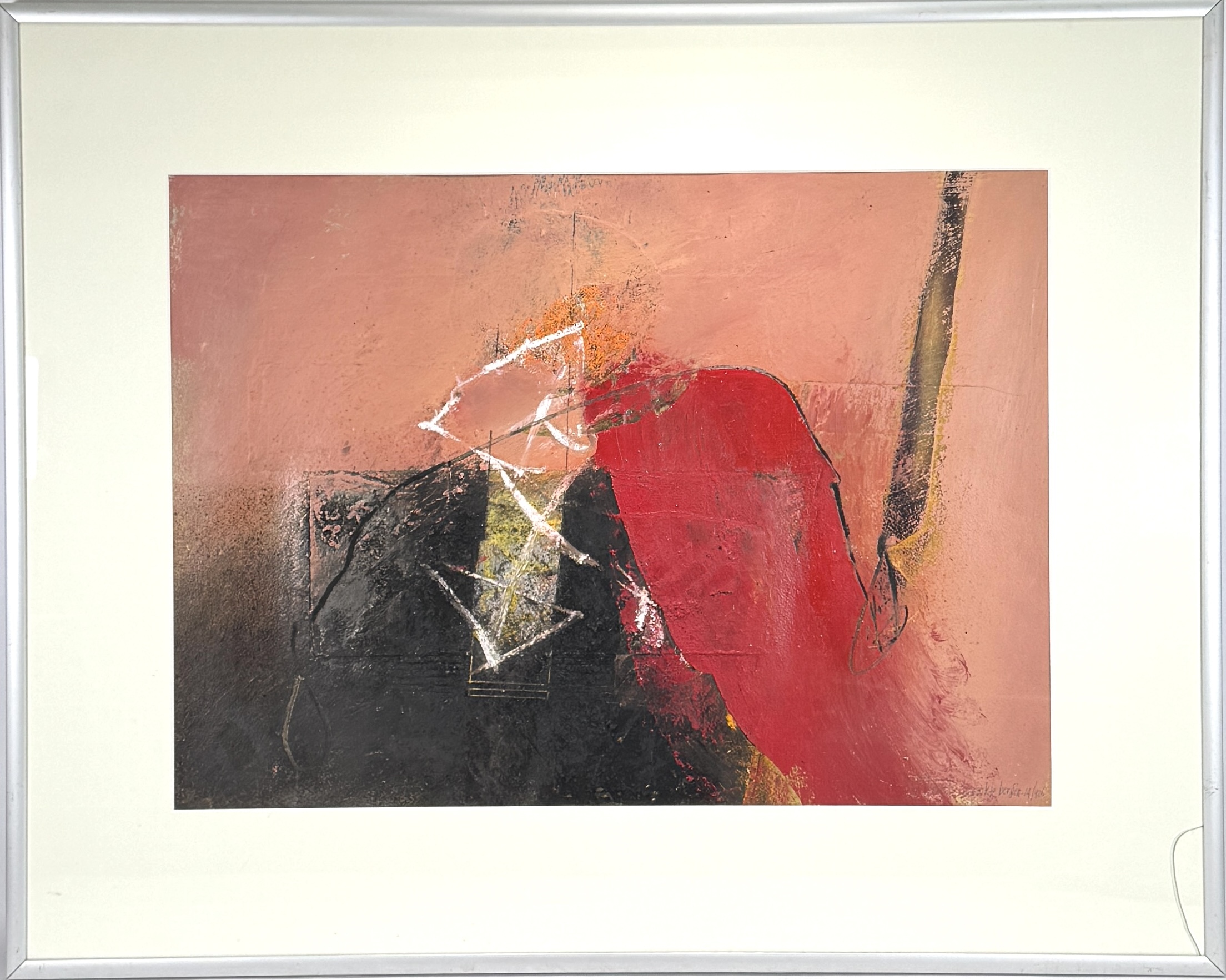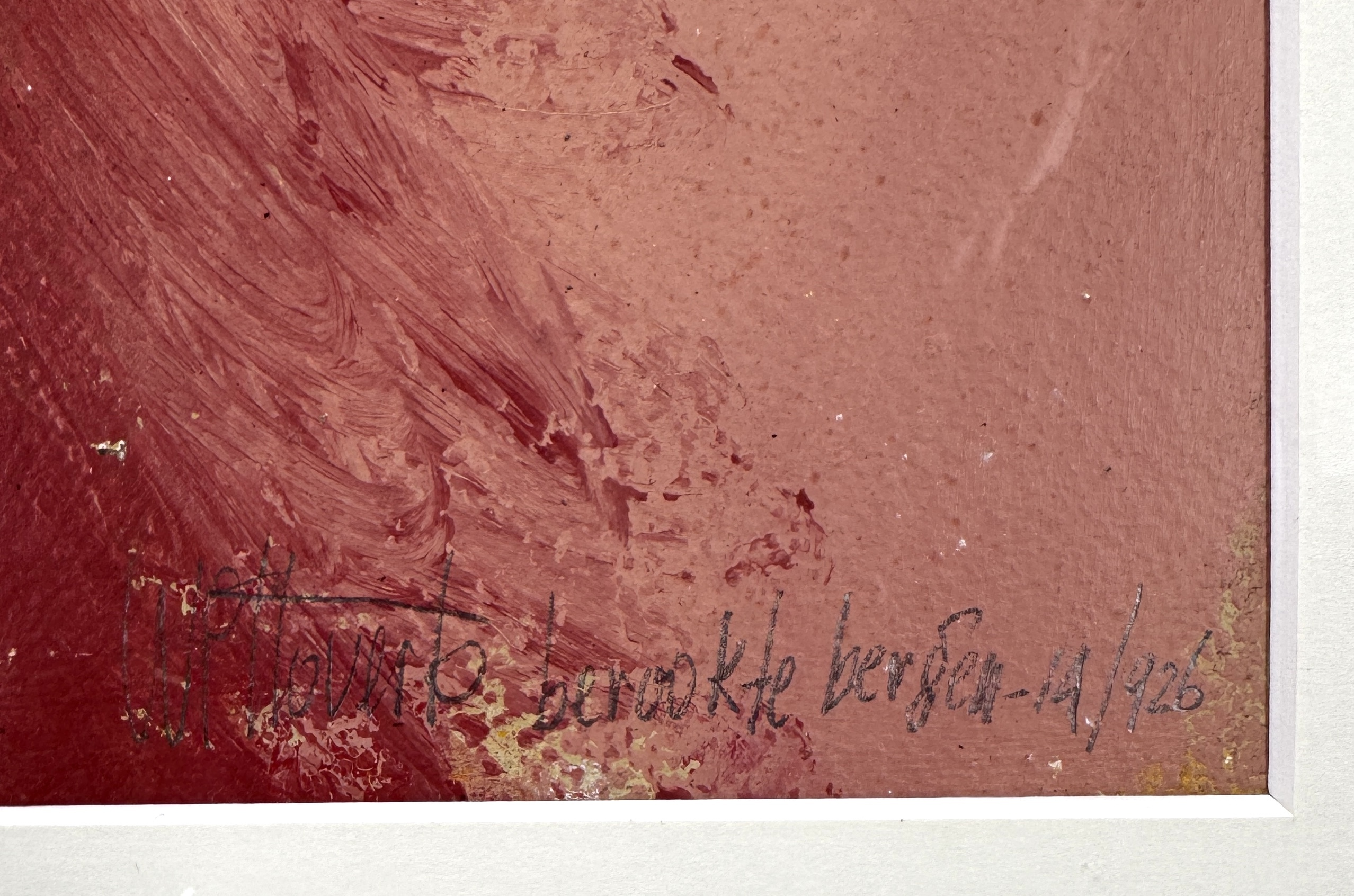 Gemengde techniek op papier, getiteld “Berookte Bergen”, uit eind 20e eeuw. Onduidelijk gesigneerd, rechtsonder voorzien van oplagenummer 14/926. Het werk toont een abstracte compositie met gelaagde kleurvlakken in rood, zwart en oker, gecombineerd met witte diagonale lijnen. Uitgevoerd met penseel, paletmes en krijt. Behoort tot de lyrisch abstracte richting binnen de moderne grafiek. Klaar om te bieden? Registreer je nu en doe mee aan de veiling! |