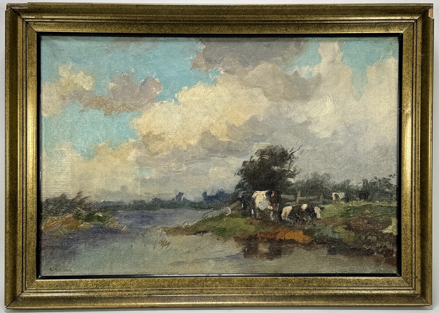 Schilderij van Ydema, uitgevoerd in olieverf op doek in een impressionistische stijl. Centraal staat een weids rivierlandschap met koeien aan de oever, onder een lucht vol dynamische wolkenpartijen. Linksonder gesigneerd, herkomst: Kunsthandel Nanno Meijer, Groningen. Datering: midden 20e eeuw. Klaar om te bieden? Registreer je nu en doe mee aan de veiling! |