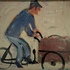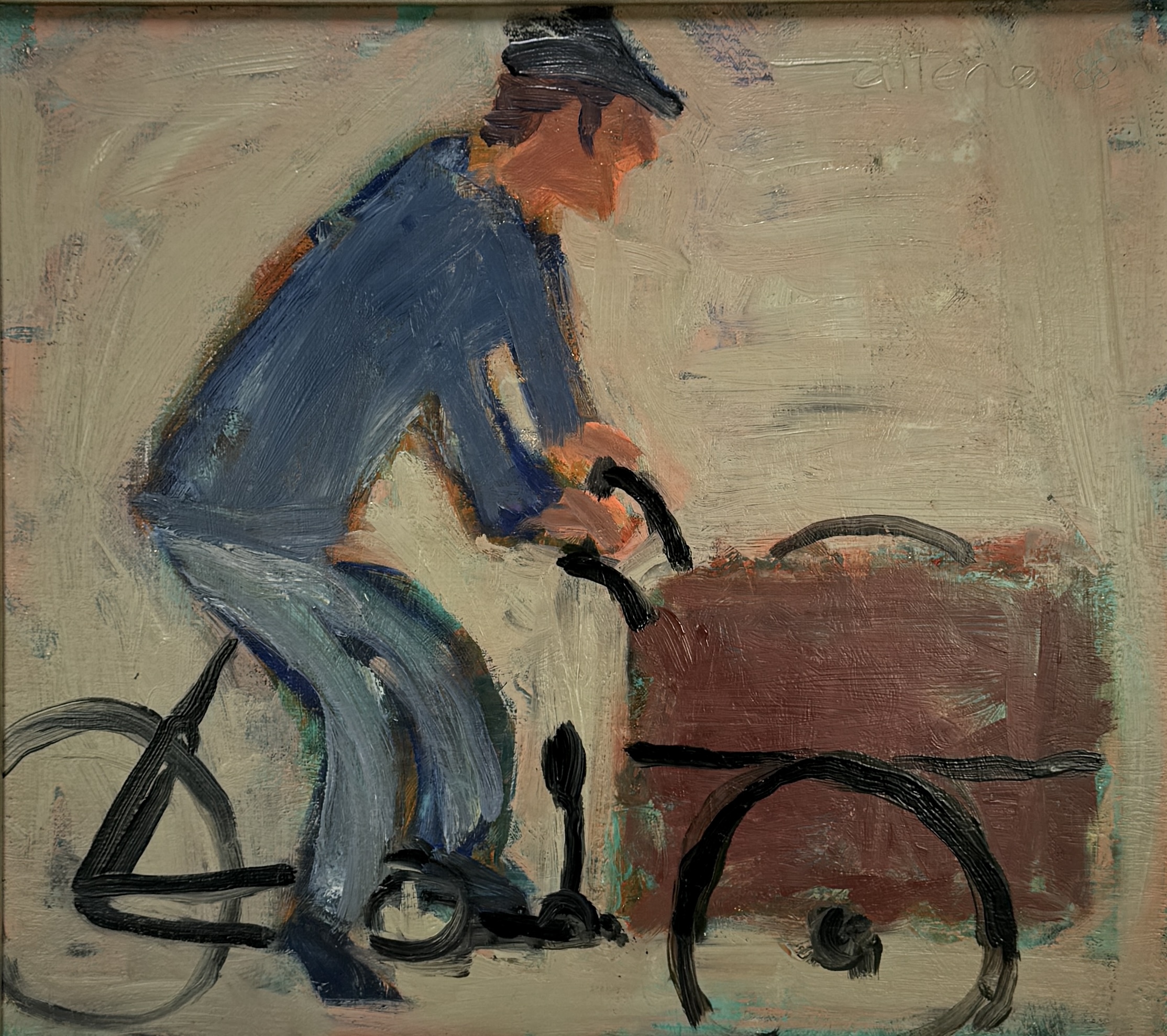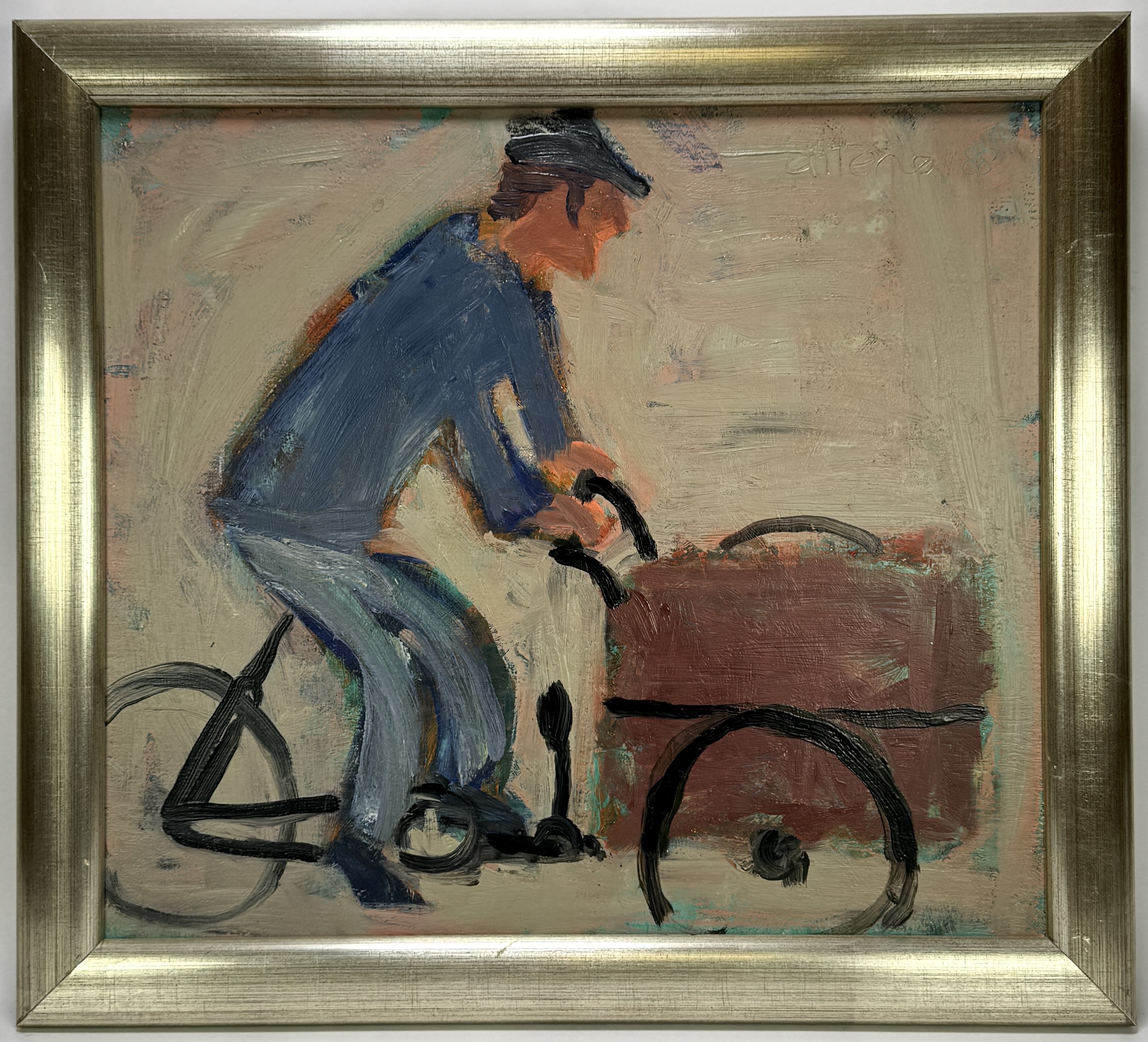Olieverfschilderij Altena, man op bakfiets, 1982