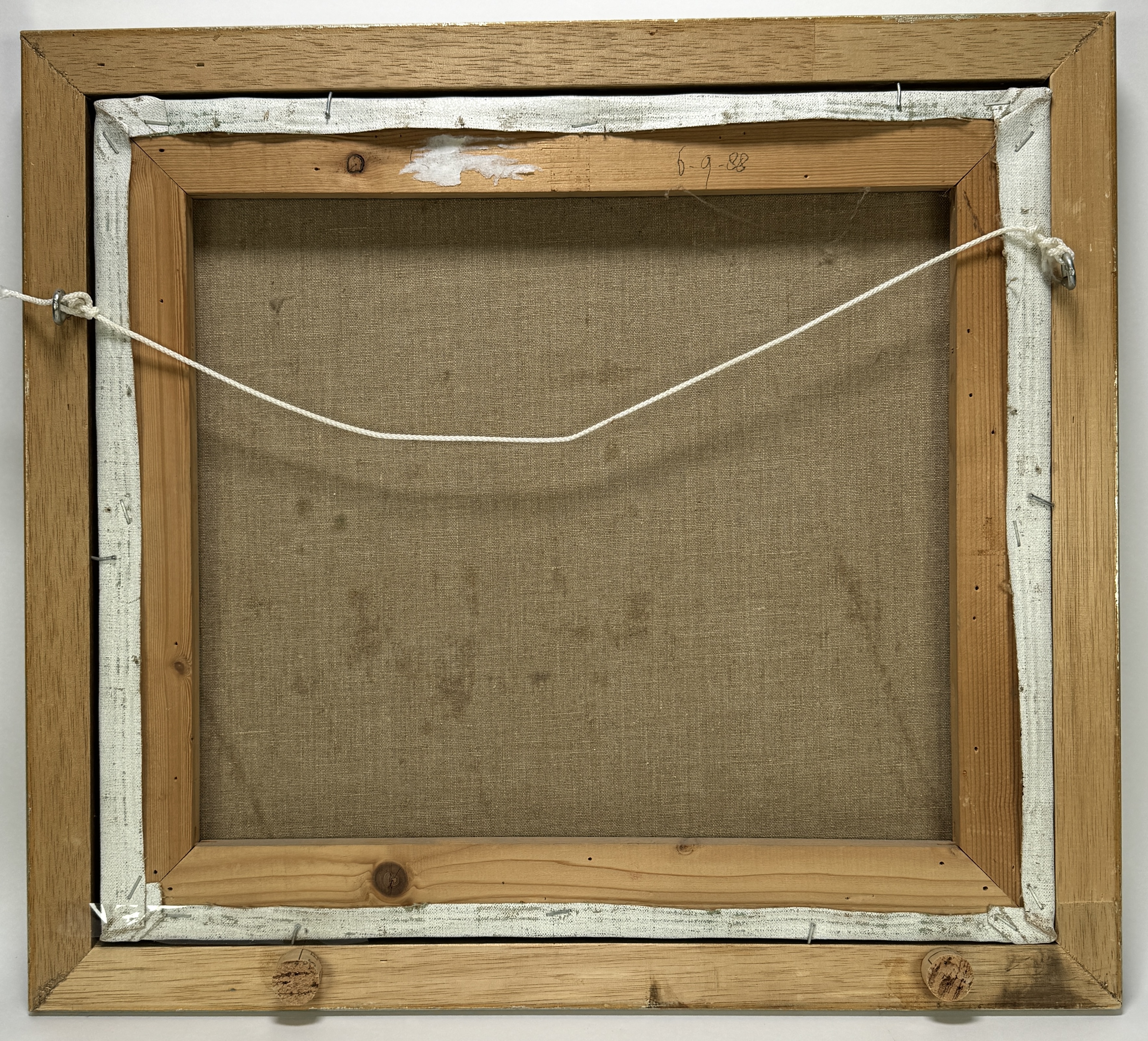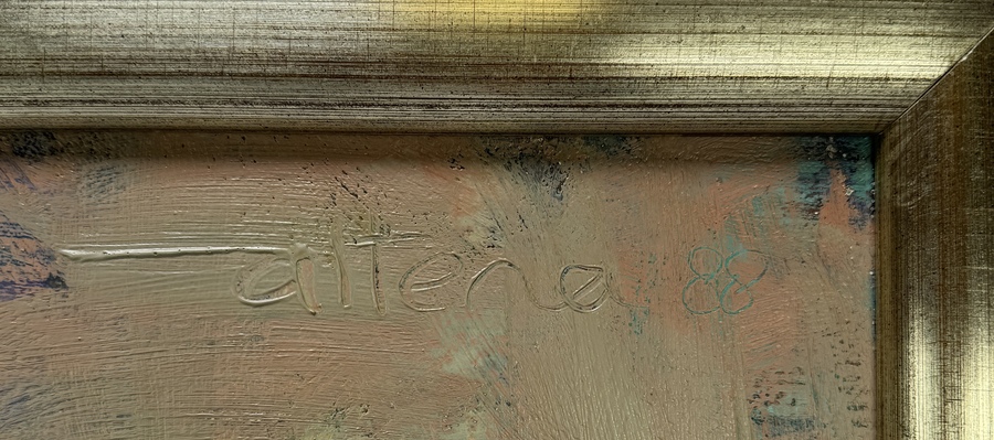 Schilderij van Altena, gedateerd 1982, is uitgevoerd in een Neo-Expressionistische stijl. Het werk, op doek, toont een gestileerde figuur op een bakfiets met een grote roodbruine bak. De techniek kenmerkt zich door een pasteuze verfapplicatie en zichtbare penseelstreken in heldere kleuren. De signatuur en datering zijn rechtsboven op het doek aangebracht. Kom langs tijdens de kijkdagen (29 t/m 31 augustus) en ontdek dit schilderij zelf! |