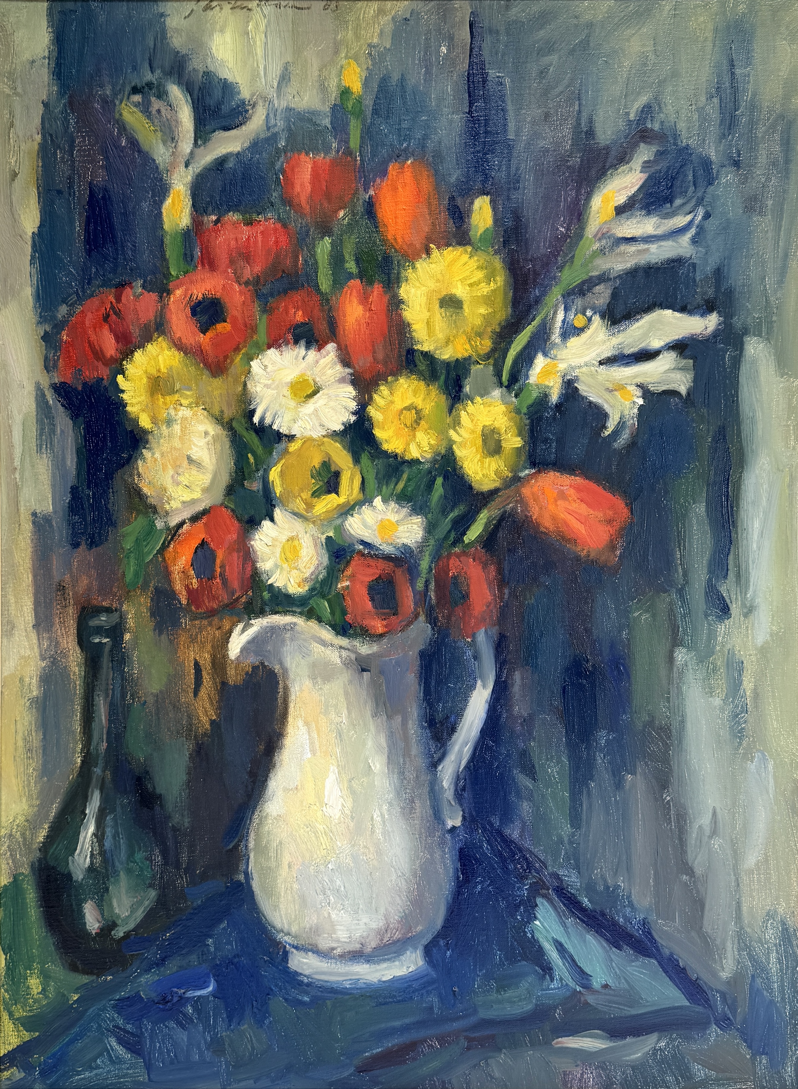 Schilderij van Jan ten Have (1903-1991) uit 1983, uitgevoerd in olieverf op doek, voorstellende een levendig bloemstilleven. Het werk toont rode, oranje, gele en witte bloemen in een witte kan en donkere fles, geschilderd met dikke, zichtbare penseelstreken tegen een donkere achtergrond. Linksboven gesigneerd "Jan ten Have" en gedateerd "83". Zeker zijn van deelname? Plaats vanaf 22 augustus een schriftelijk bod online! |