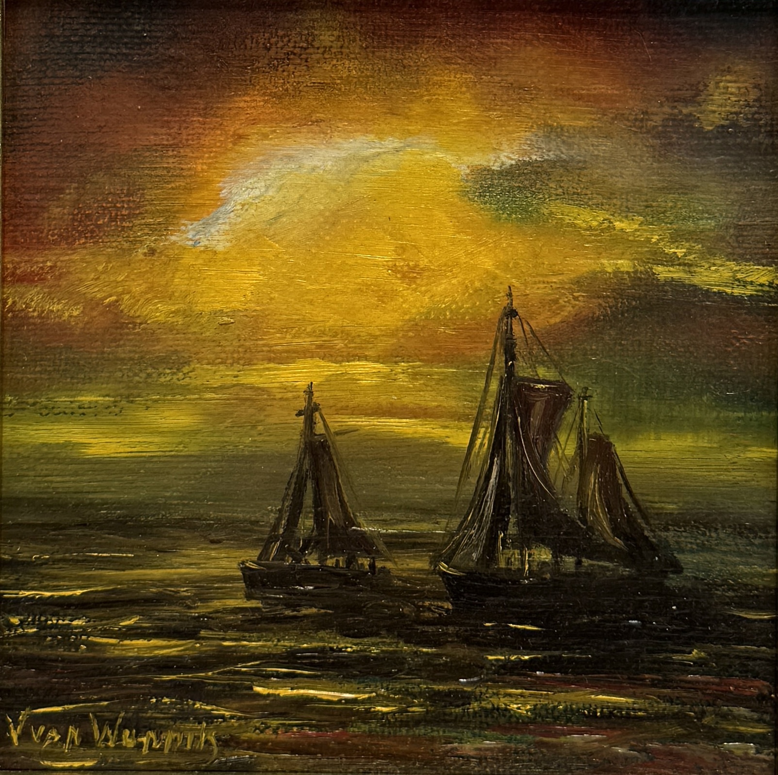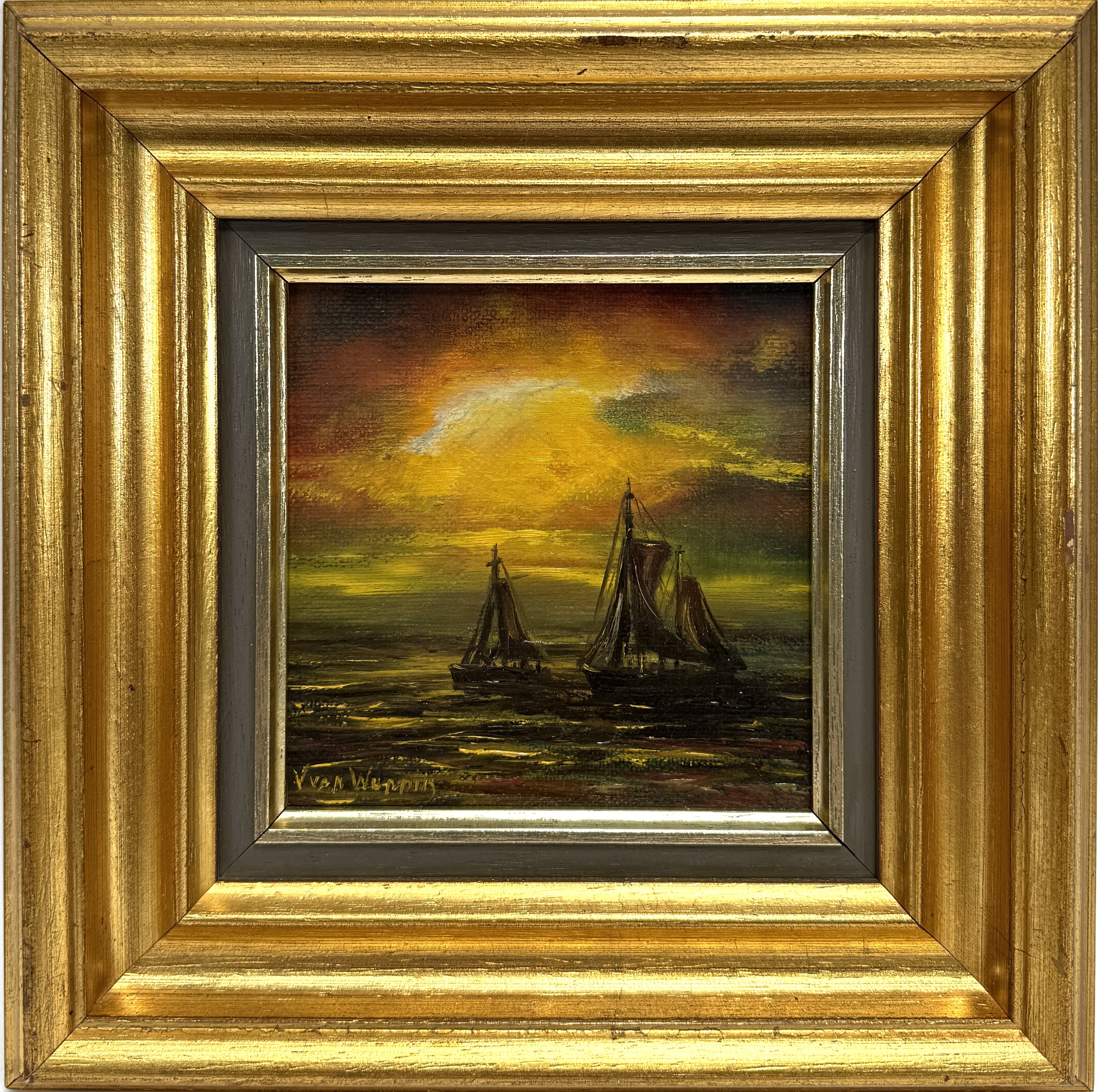 Olieverfschilderij, zeilschepen bij zonsondergang, midden 20e eeuw