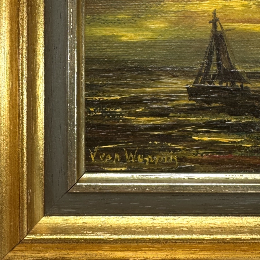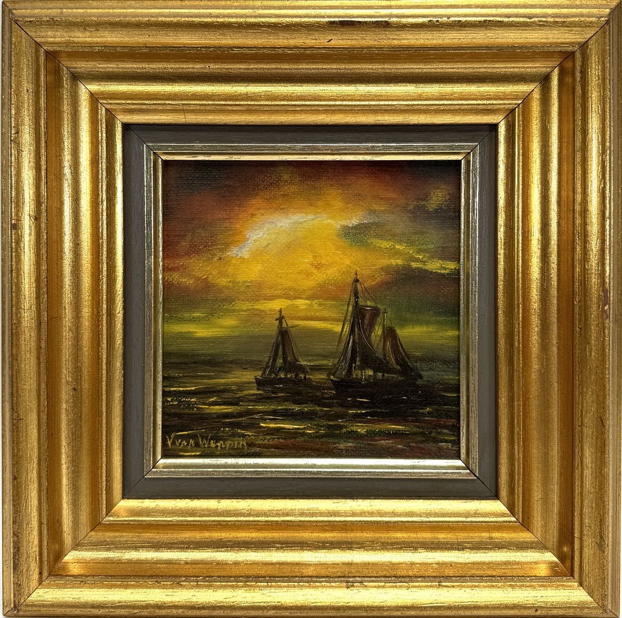 Dit schilderij uitgevoerd in olieverf op doek, dateert uit het midden van de 20e eeuw. Het werk toont twee zeilschepen op donker water tegen een goudgele en oranje lucht, wat een sfeervol maritiem landschap creëert. De signatuur is linksonder op het doek aangebracht. Wil je het werk in het echt bekijken? Kom naar de kijkdagen op 29, 30 en 31 augustus! |