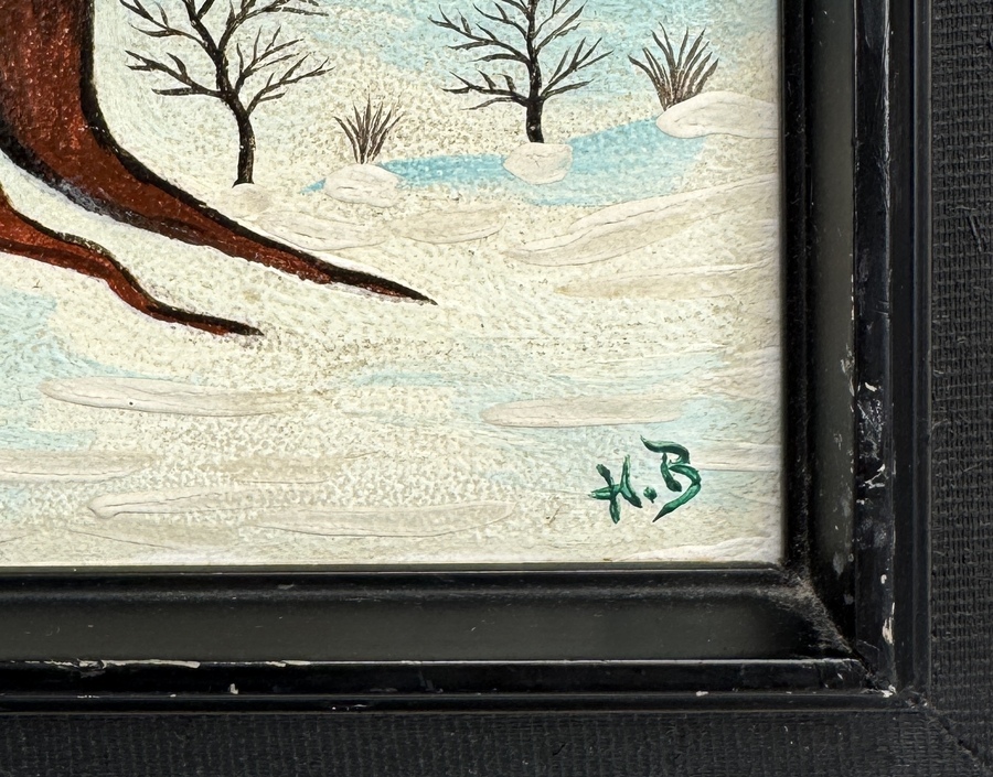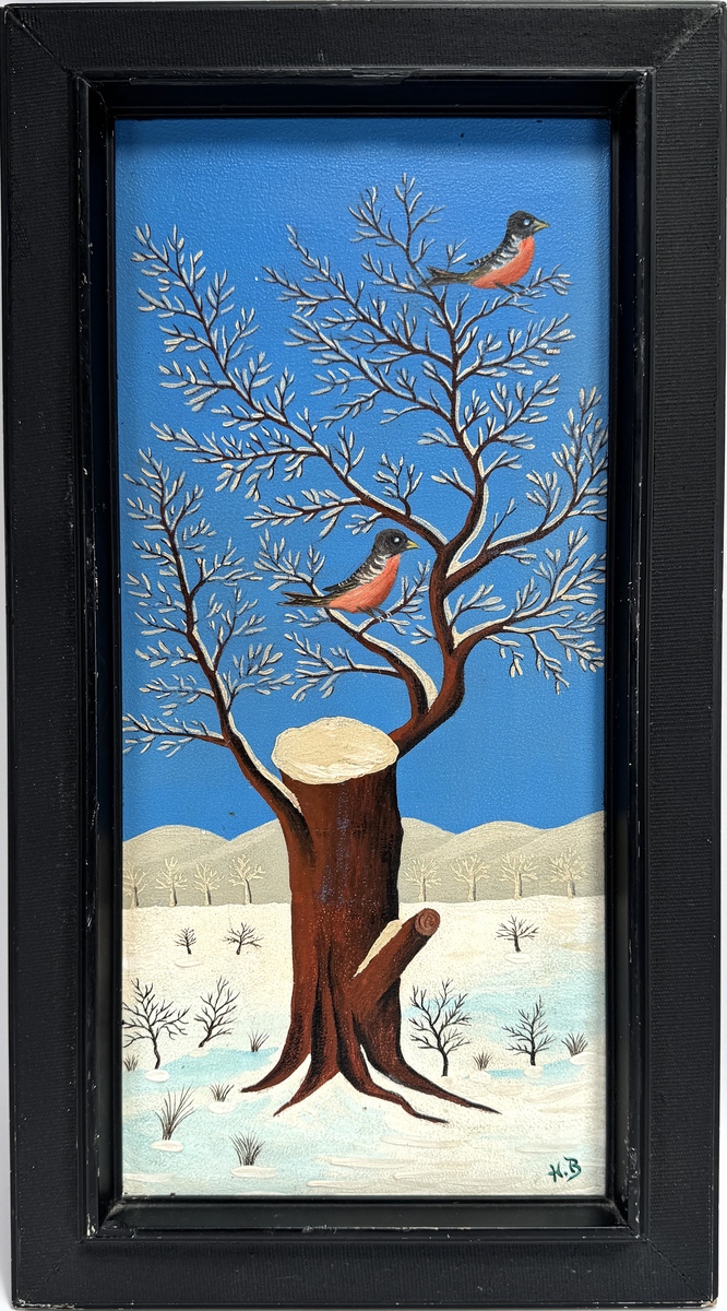 Schilderij in naïeve stijl, uitgevoerd in olieverf op paneel, getiteld "Vögel mit winterlandschaft". Gesigneerd rechtsonder met initialen “H.B.”., verso vermelding titel en gedateerd 1978. Gemonteerd in een zwarte houten lijst. Kenmerkend zijn de heldere kleuren, strakke contouren en vlakke compositie zonder perspectiefwerking, typerend voor naïeve schilderkunst. Kom langs tijdens de kijkdagen (29 t/m 31 augustus) en ontdek dit schilderij zelf! |