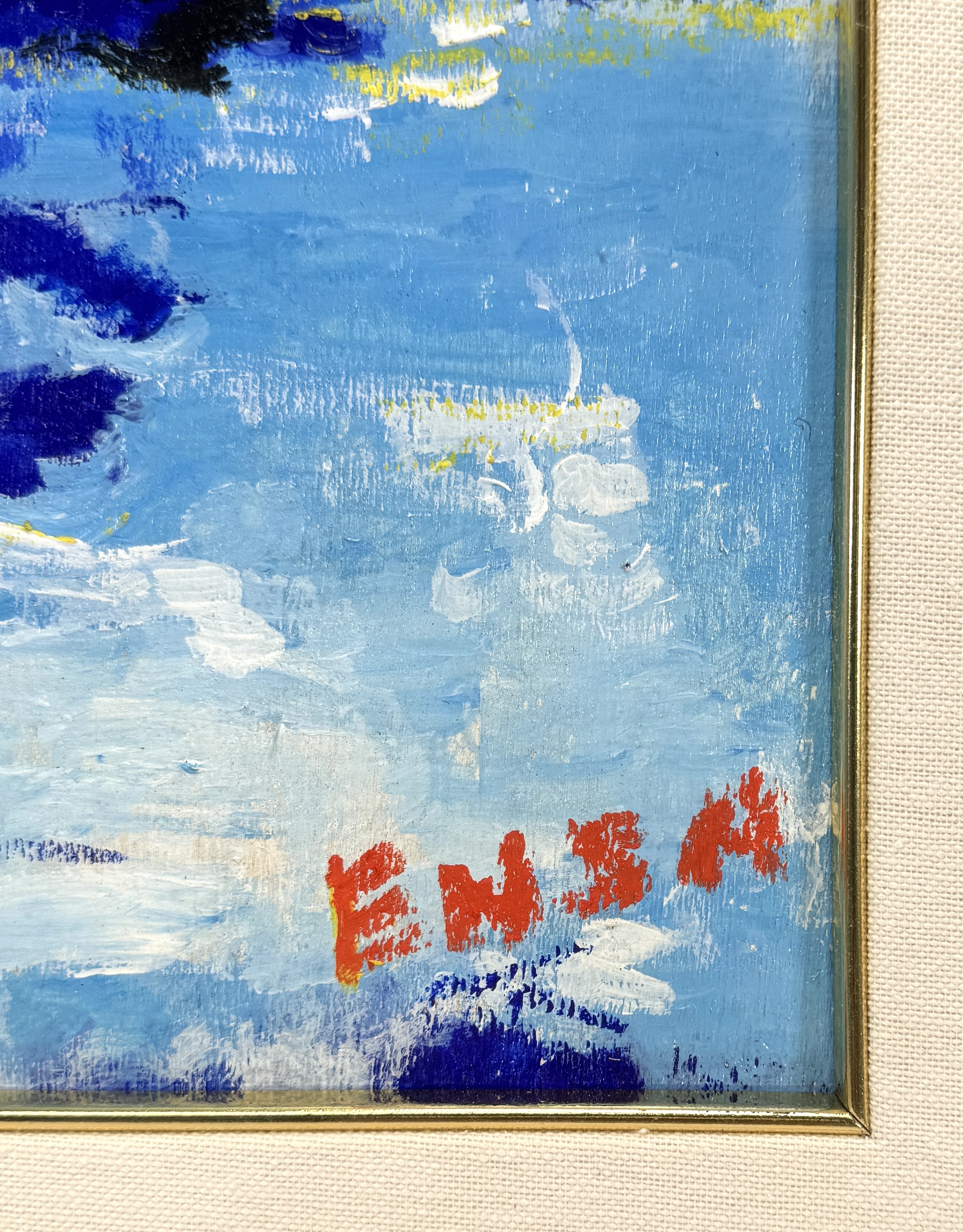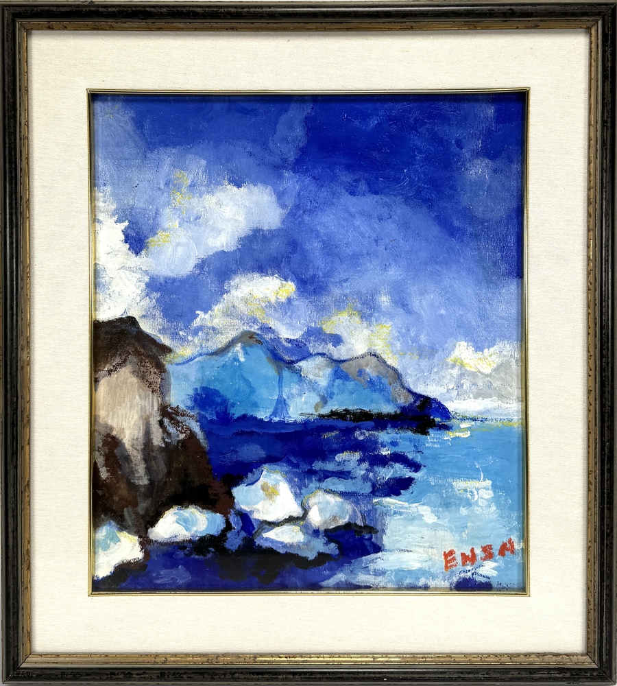 Een schilderij van de maker Ensa, gedateerd 25 augustus 1998, uitgevoerd in olieverf op doek. Het werk is in expressionistische stijl en toont een zeegezicht met bergen. de verf is dik aangebracht met zichtbare penseelstreken. Het schilderij is rechtsonder gesigneerd "ENSA". Verso informatie. Dit schilderij zelf beoordelen? Je bent welkom op onze kijkdagen op 29, 30 en 31 augustus! |
