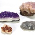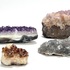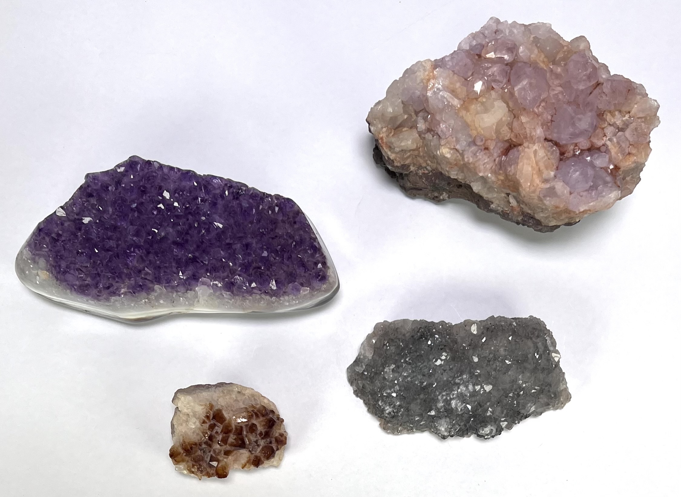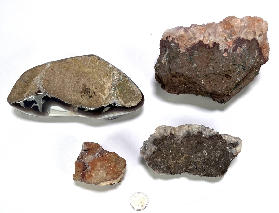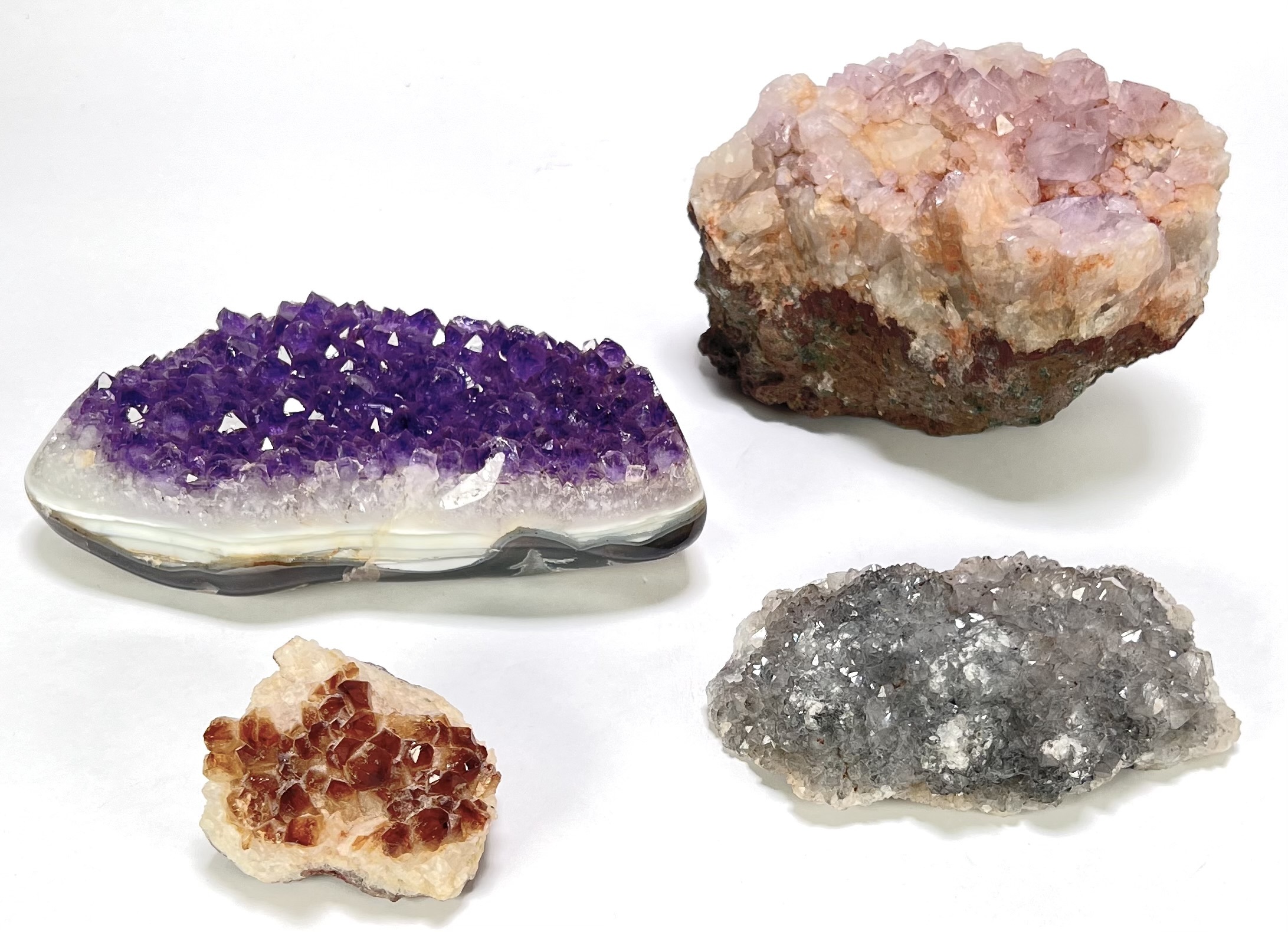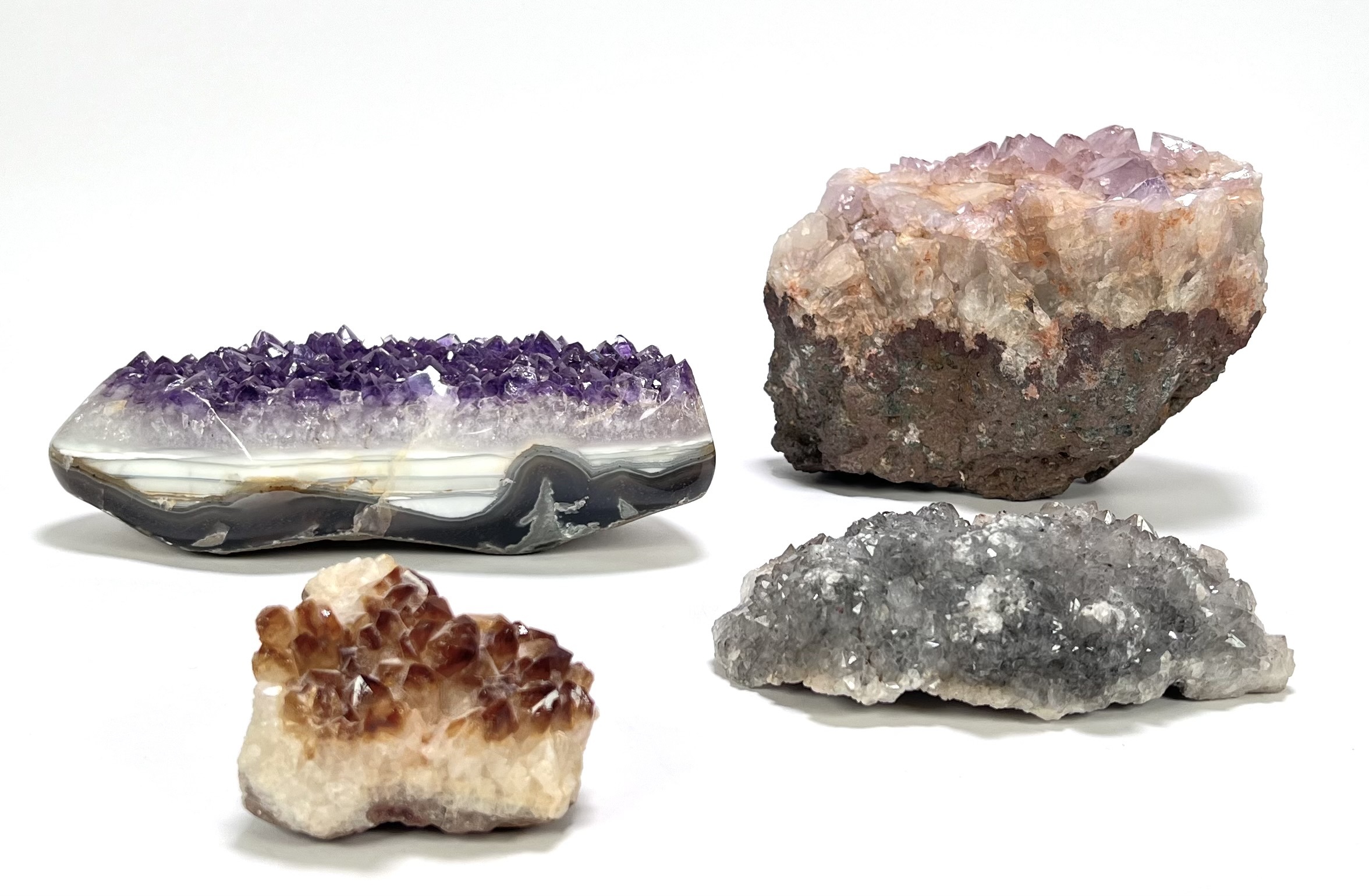 Set van vier mineralen bestaande uit diverse kwartsvarianten zoals amethist, citrien en chalcedoon, deels gepolijst en deels in ruwe vorm. De stukken tonen kristallijnen structuren met opvallende violette, roodbruine en grijze tinten. De techniek omvat breuk en polijsten van het gesteente. De mineralen zelf beoordelen? Je bent welkom op onze kijkdagen op 29, 30 en 31 augustus! |