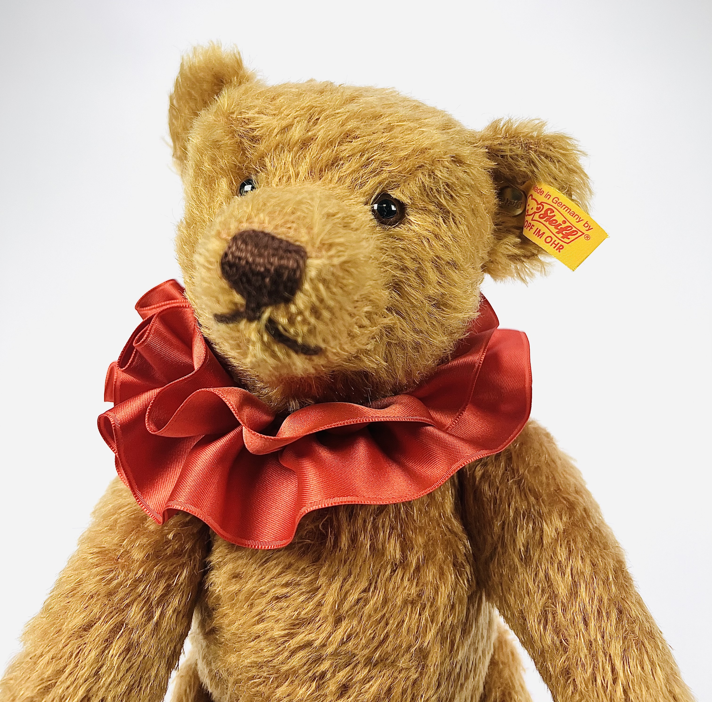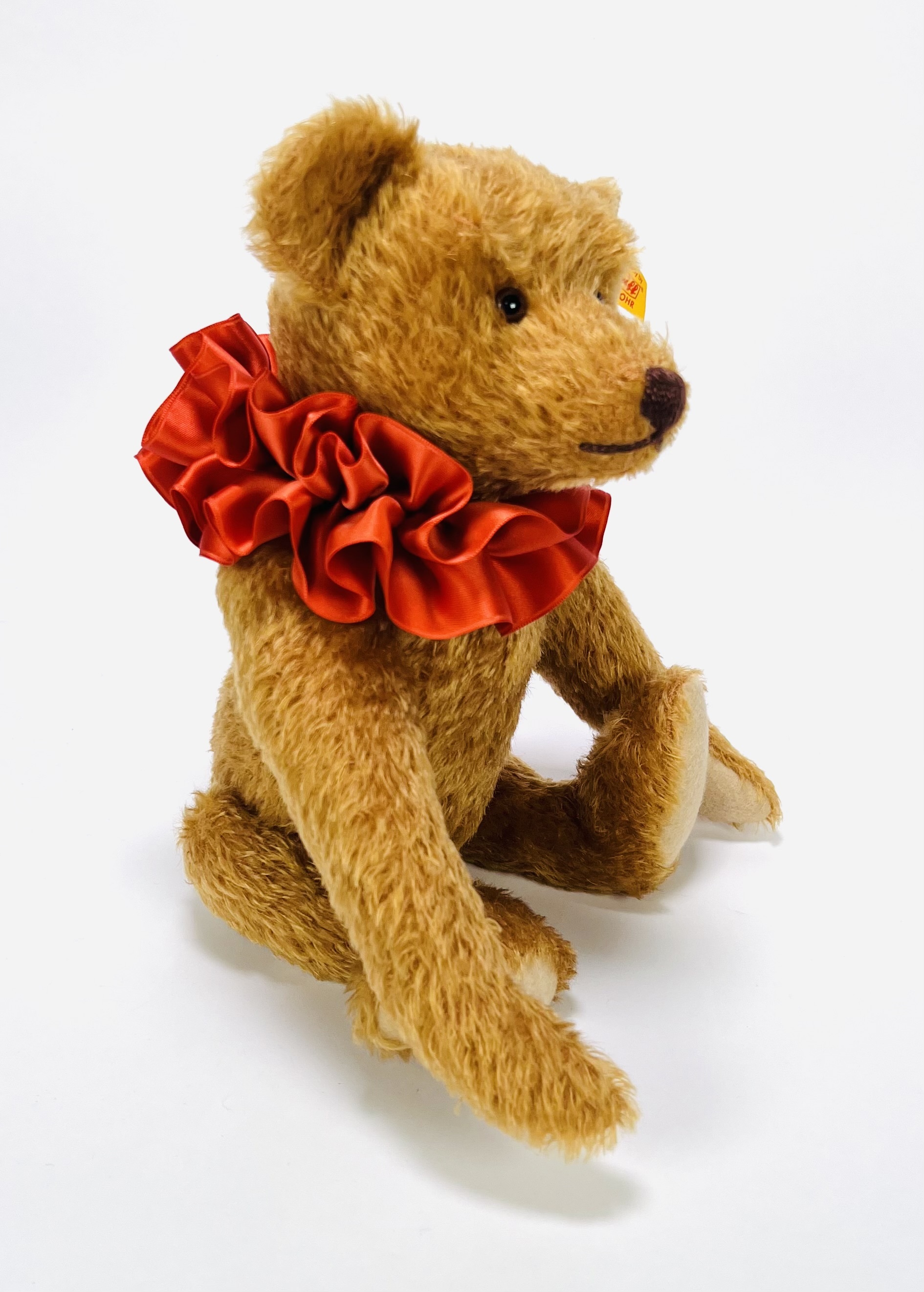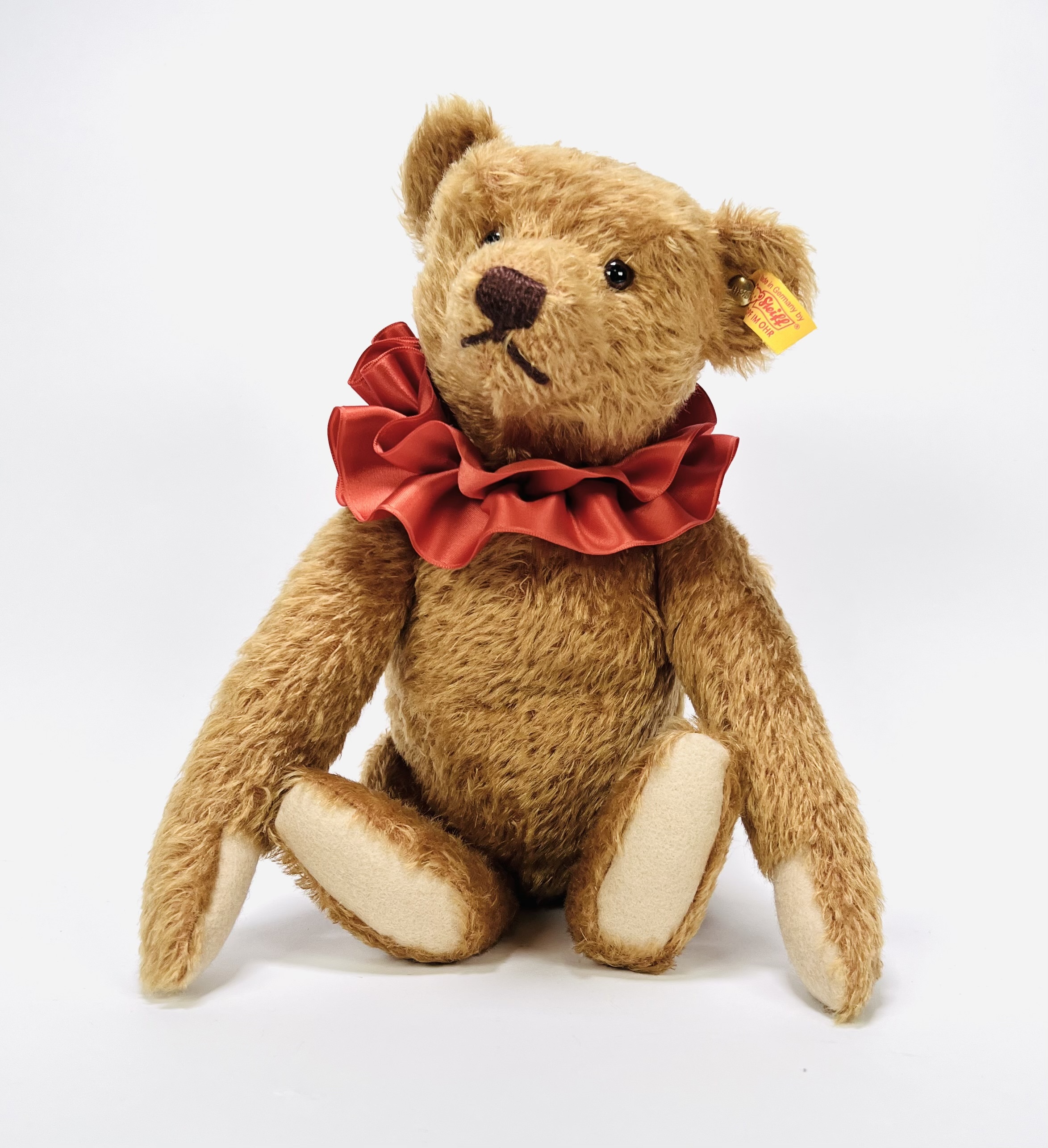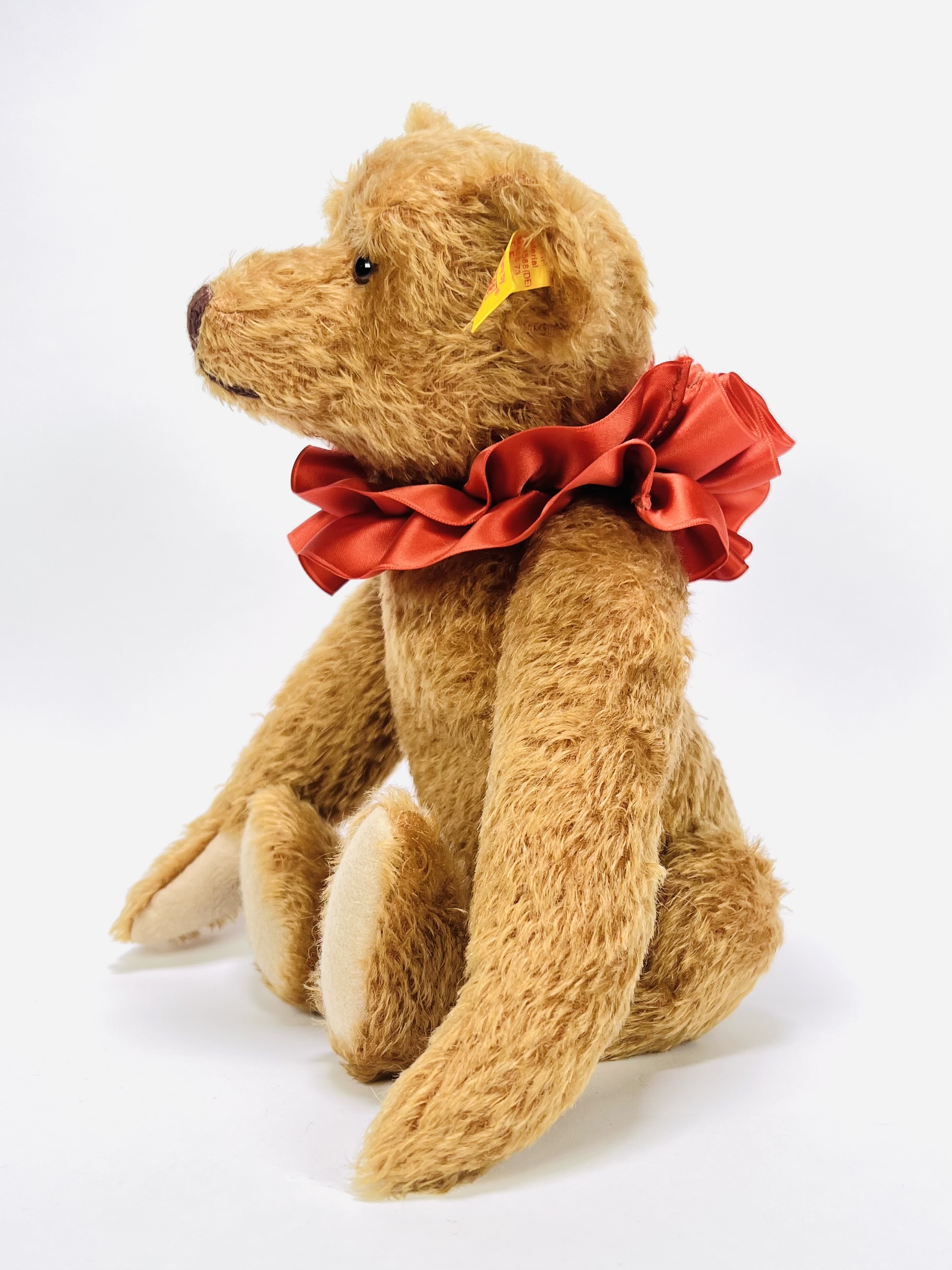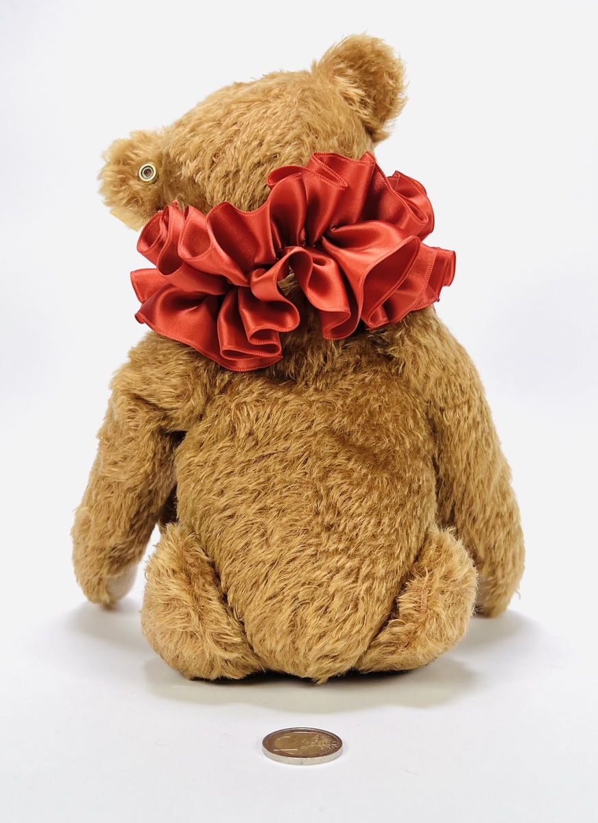 Teddybeer van de firma Steiff, daterend einde van de 20e eeuw, is geproduceerd in Duitsland door Margarete Steiff GmbH voor de verzamel- en speelgoedlijn.. De teddybeer heeft glazen ogen en draagt een rode, geplooide satijnen kraag. Een geel label in het linkeroor draagt de inscriptie "Made in Germany by Steiff Knopf im Ohr". Eerst de teddybeer zien voordat je biedt? Bezoek onze kijkdagen op 29, 30 en 31 augustus van 11:00 tot 17:00 uur! |