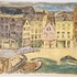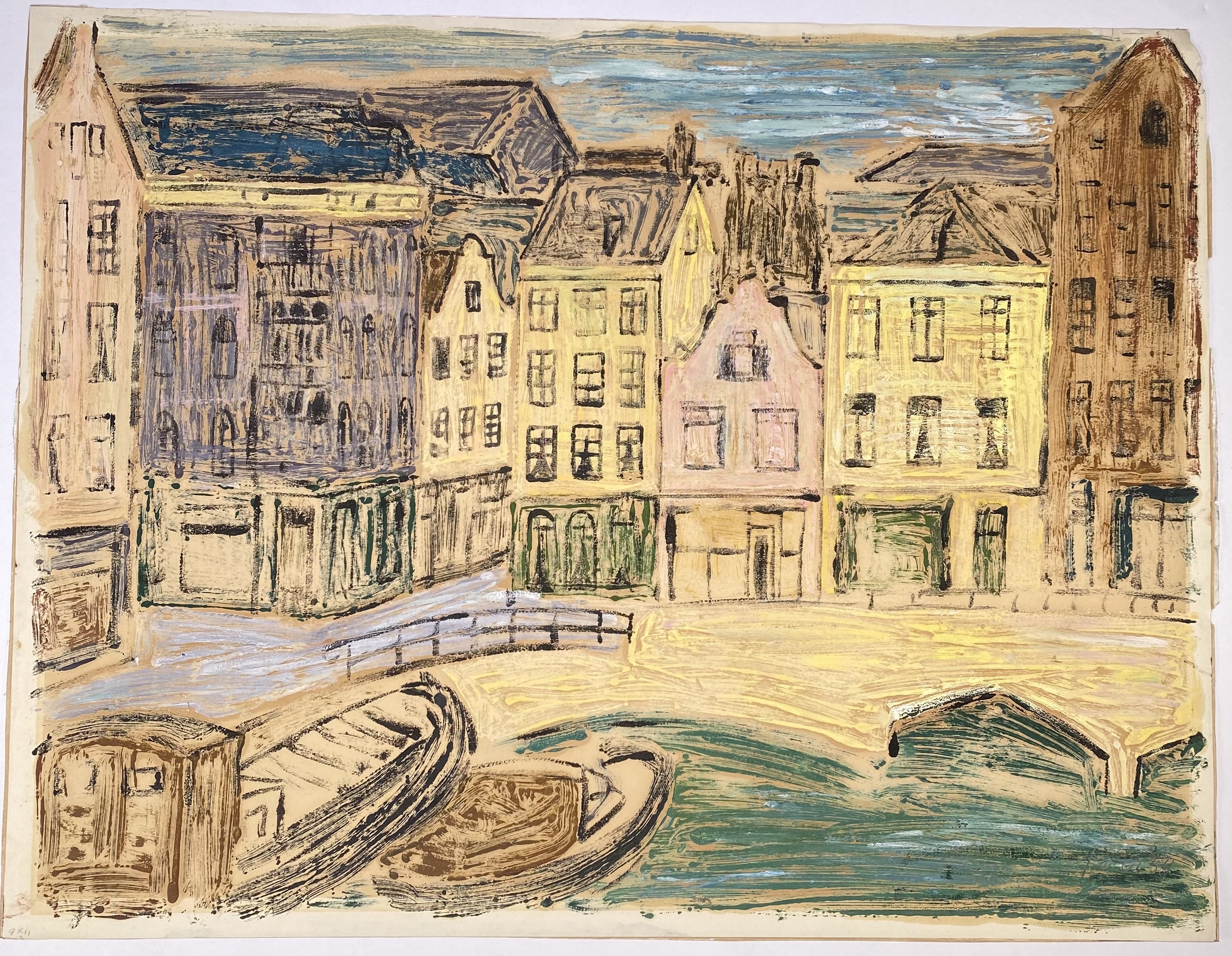 Kleurenhoutsnede, stadsgezicht met gracht, 1954