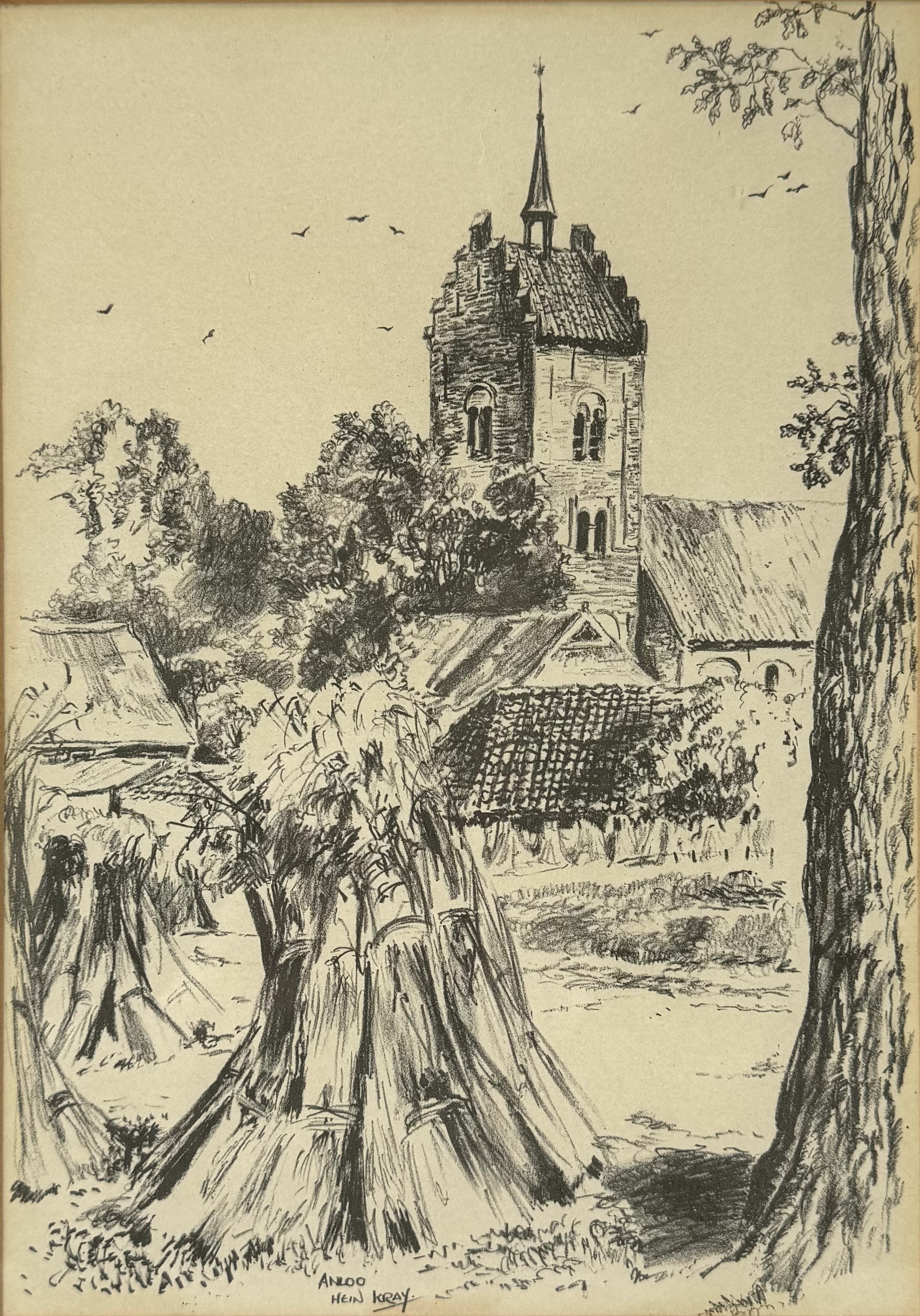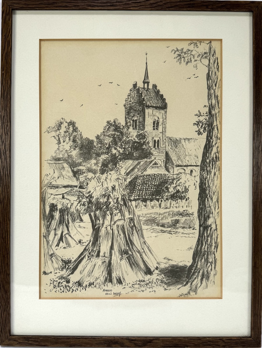 Zwart-witte tekening van de kerk en omgeving van Anloo, uitgevoerd door Hein Auke Kray (1901–1995) in realistische stijl, 2e helft 20ste eeuw. De voorstelling toont korenschoven op de voorgrond en de kerktoren centraal in beeld. Het werk is midden onder getiteld en gesigneerd met “Anloo Hein Kray” en ingelijst door Creative Frame Shop in Groningen. Kom langs tijdens de kijkdagen (29 t/m 31 augustus) en ontdek deze tekening zelf! |