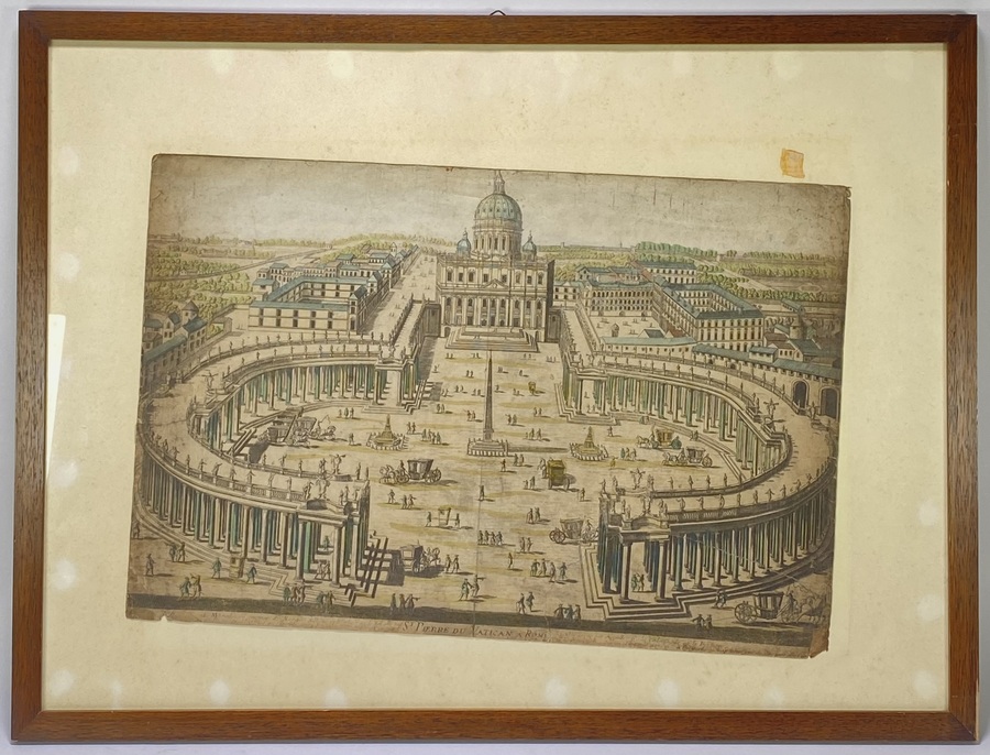 Kopergravure op papier, met de hand ingekleurd, omstreeks 18e eeuw, met een stadsgezicht van het Sint-Pietersplein en de Sint-Pietersbasiliek in Rome. De voorstelling toont de colonnades, de obelisk en diverse figuren en rijtuigen op het plein. Onderaan centraal in de marge staat de titel “St. Pierre du Vatican à Rome”. Deze kopergravure zelf beoordelen? Je bent welkom op onze kijkdagen op 29, 30 en 31 augustus! |