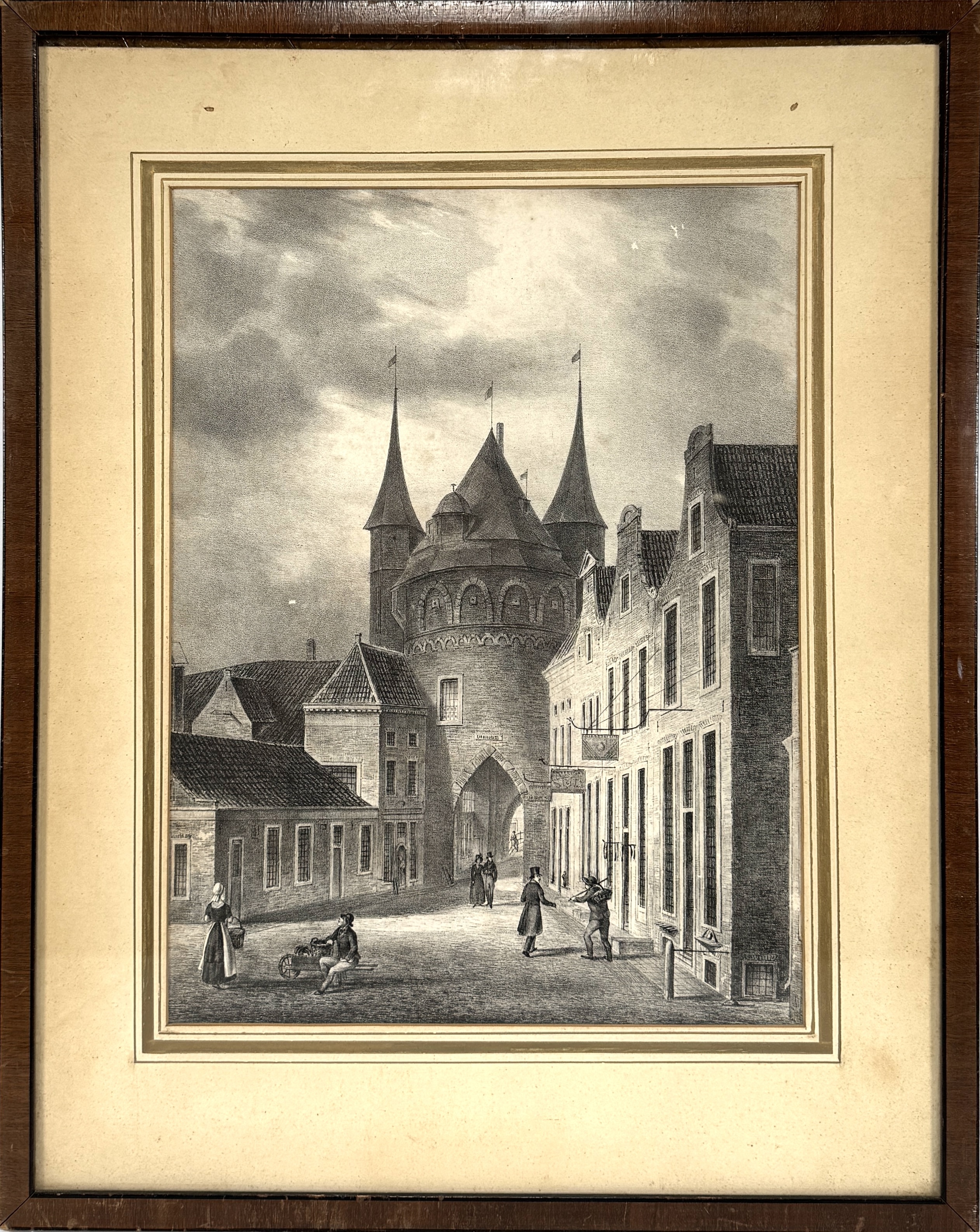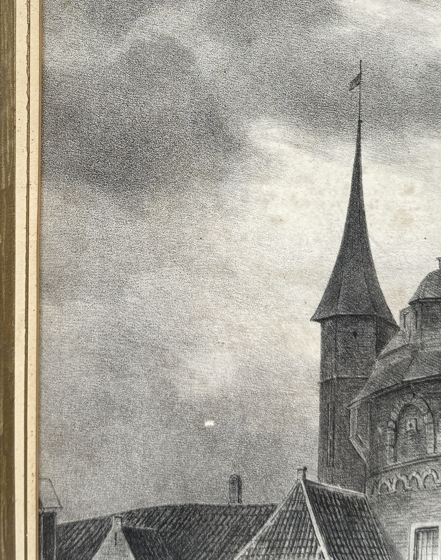Litho, gedateerd circa 1832, van de Binnen Apoort te Groningen. De prent toont een gedetailleerde weergave van de stadspoort met torens en omliggende gebouwen. Op de voorgrond zijn figuren op straat afgebeeld. De atmosfeer wordt bepaald door een bewolkte lucht. Uitgevoerd op papier in zwart-wit, met fijne arceringen. Toegeschreven aan Joannes Nicolaus Schoonbeek. Geïnteresseerd? Bezoek onze kijkdagen op 29, 30 of 31 augustus van 11:00 tot 17:00 uur! |