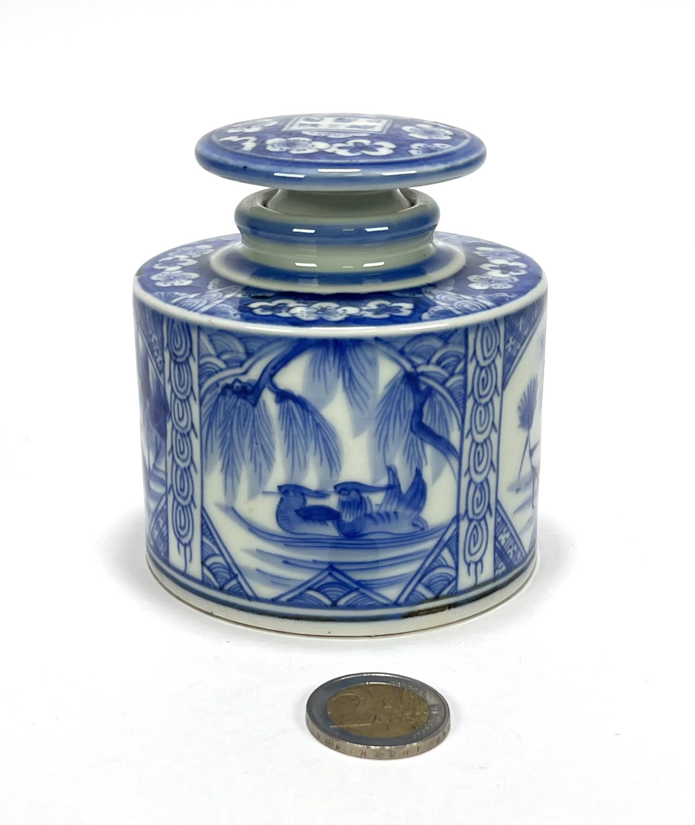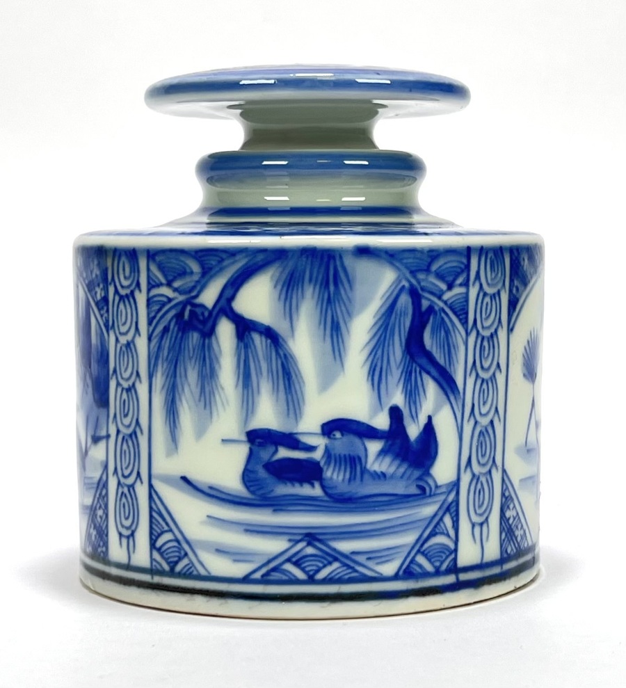 Porseleinen theebus in Arita stijl, gemerkt Fukagawa Seiji, Japan, omstreeks 1900. Beschilderd in blauw onderglazuur (sometsuke) met panelen van eenden en reigers in rivierlandschappen, omgeven door bloesemranden en geometrische patronen. Gemaakt van geglazuurd porselein met handgeschilderde decoratie in traditionele Japanse techniek. Kom langs tijdens de kijkdagen (29 t/m 31 augustus) en ontdek die theebus zelf! |