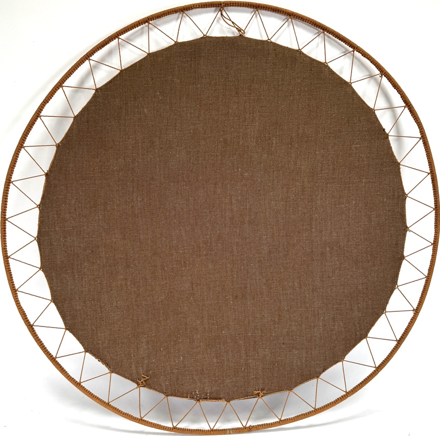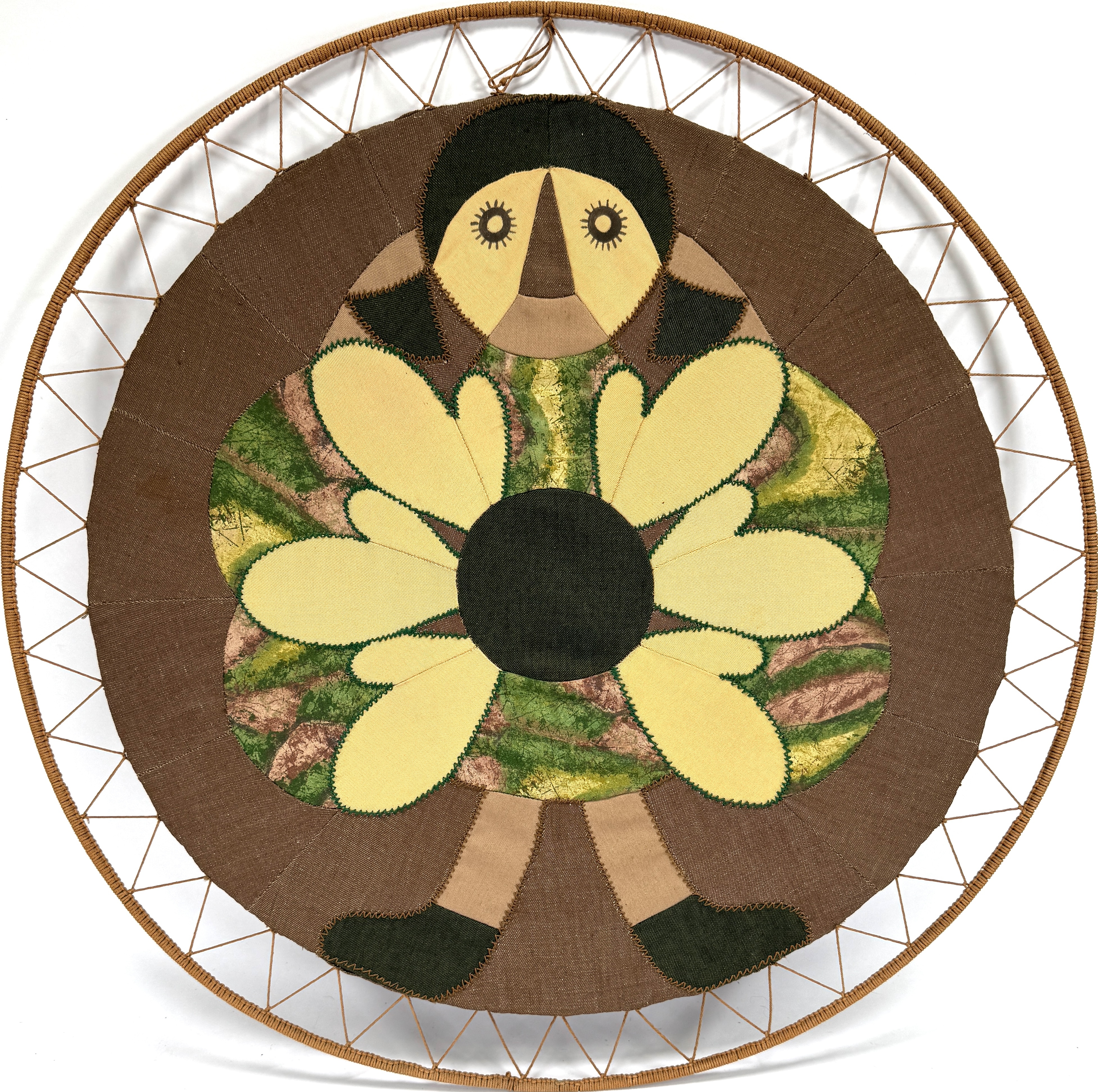 Rond wandobject uit omstreeks jaren 1970 in naïef-folkloristische stijl, uitgevoerd in gemengde textieltechnieken met appliqué en festonsteken op gespannen linnen. De voorstelling toont een gestileerd meisje met bloemvormige jurk. Het geheel is gespannen in een met touw omwonden metalen ringframe. Klaar om te bieden? Registreer je nu en doe mee aan de veiling! |