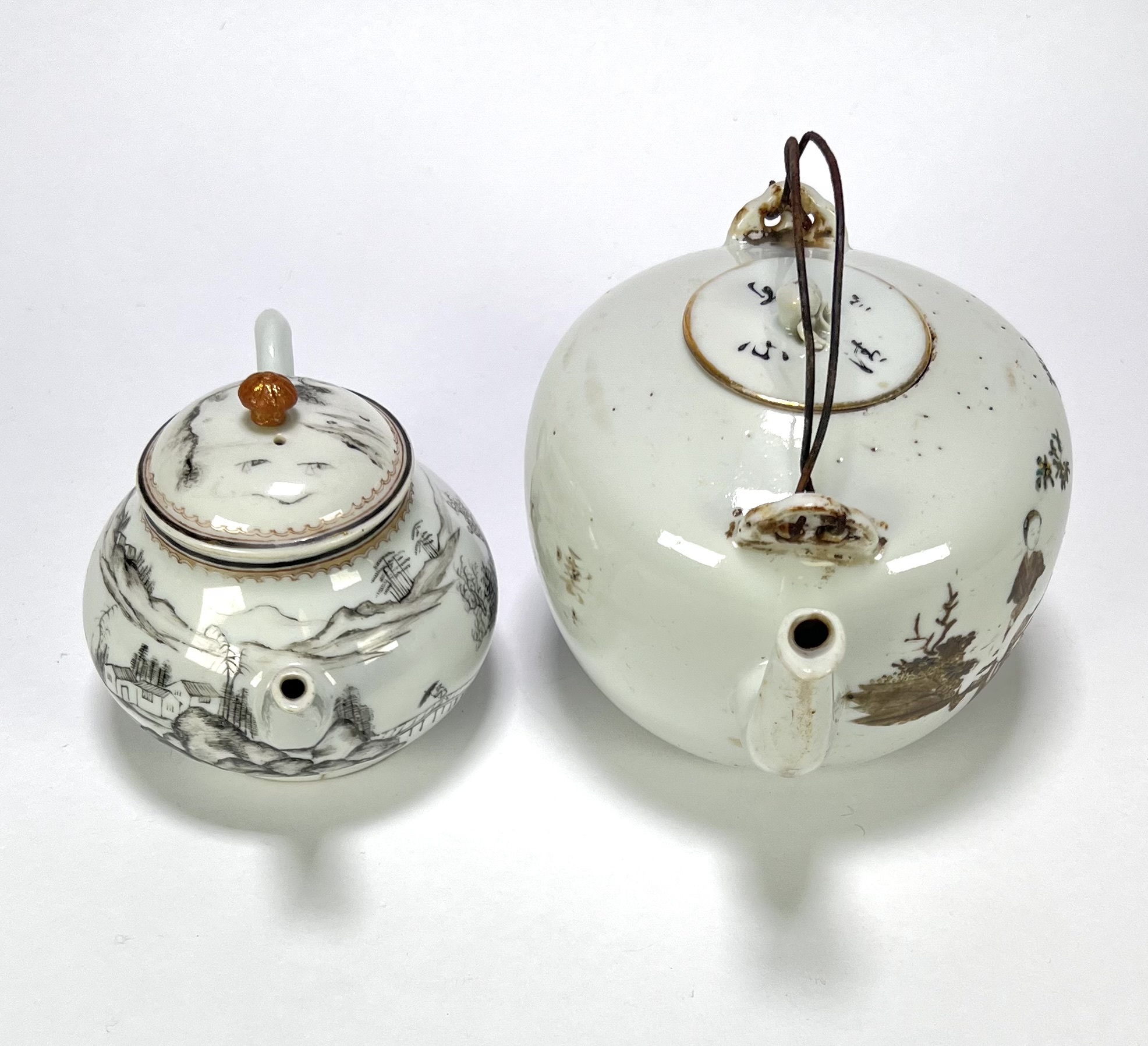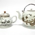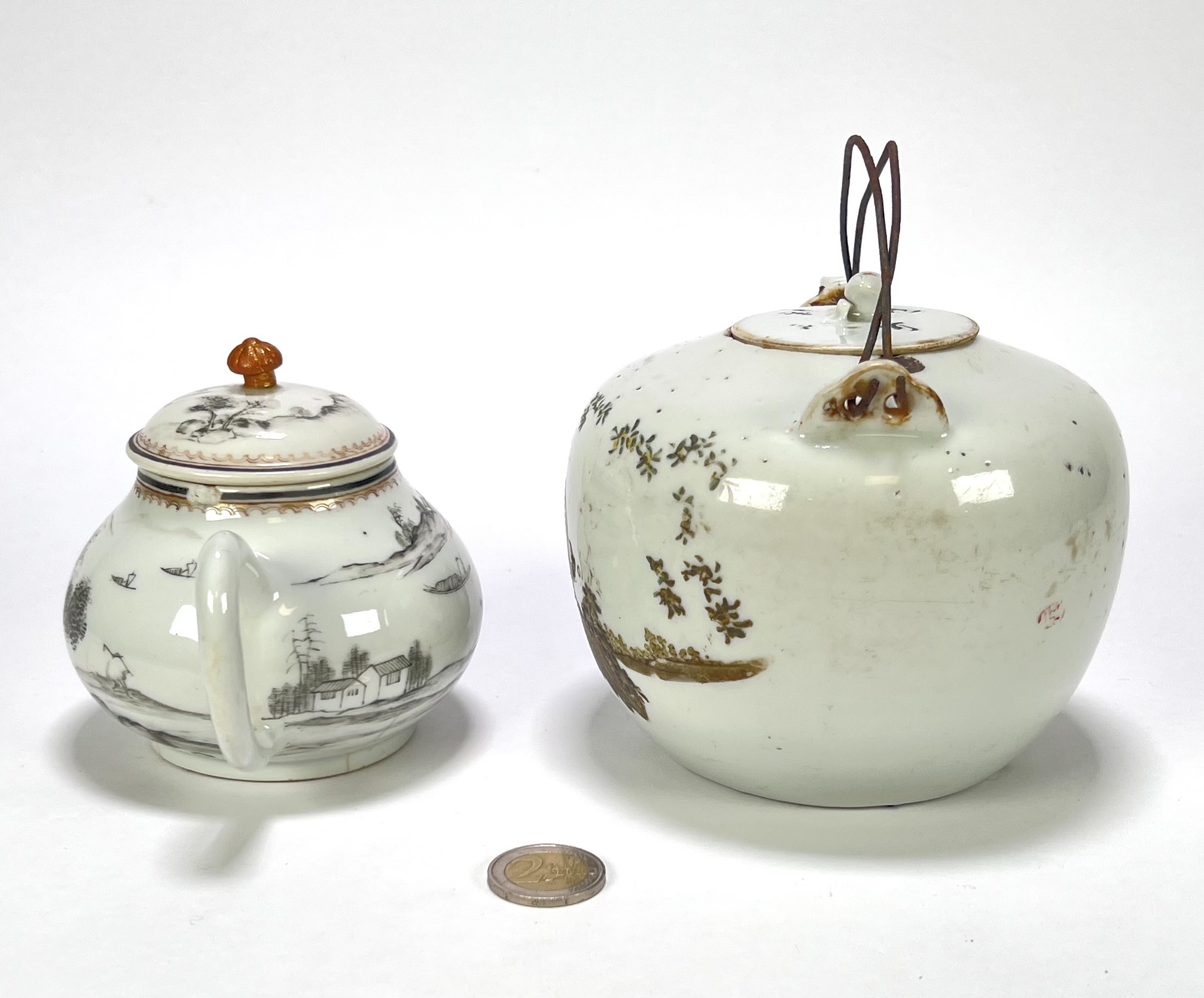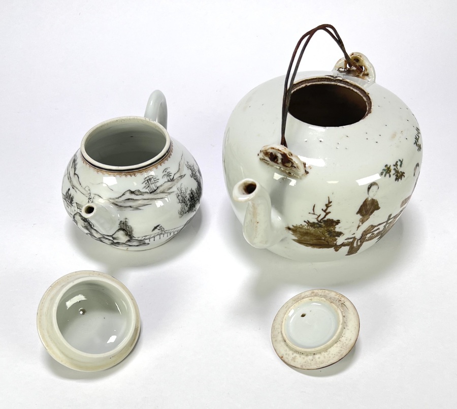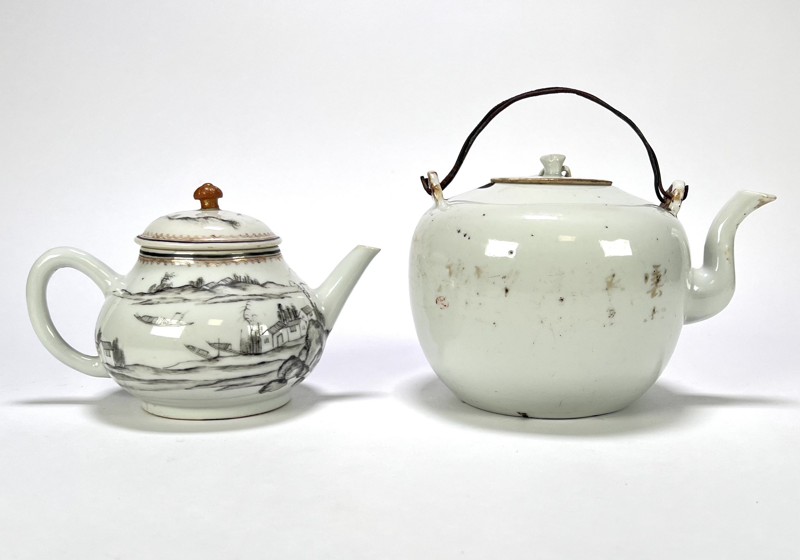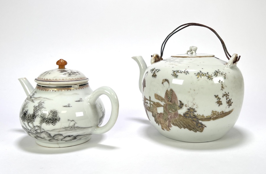 Twee Chinese porseleinen theepotten, 18e en 19e eeuw. Het kleinere exemplaar is uitgevoerd in wit porselein met fijn zwartgrijs landschapsdecor en bloemknop op de deksel. De grotere theepot heeft een metalen hengsel en meerkleurige voorstelling van figuren in een tuin met vergulding. Kom langs tijdens de kijkdagen (29 t/m 31 augustus) en ontdek dit object zelf! |