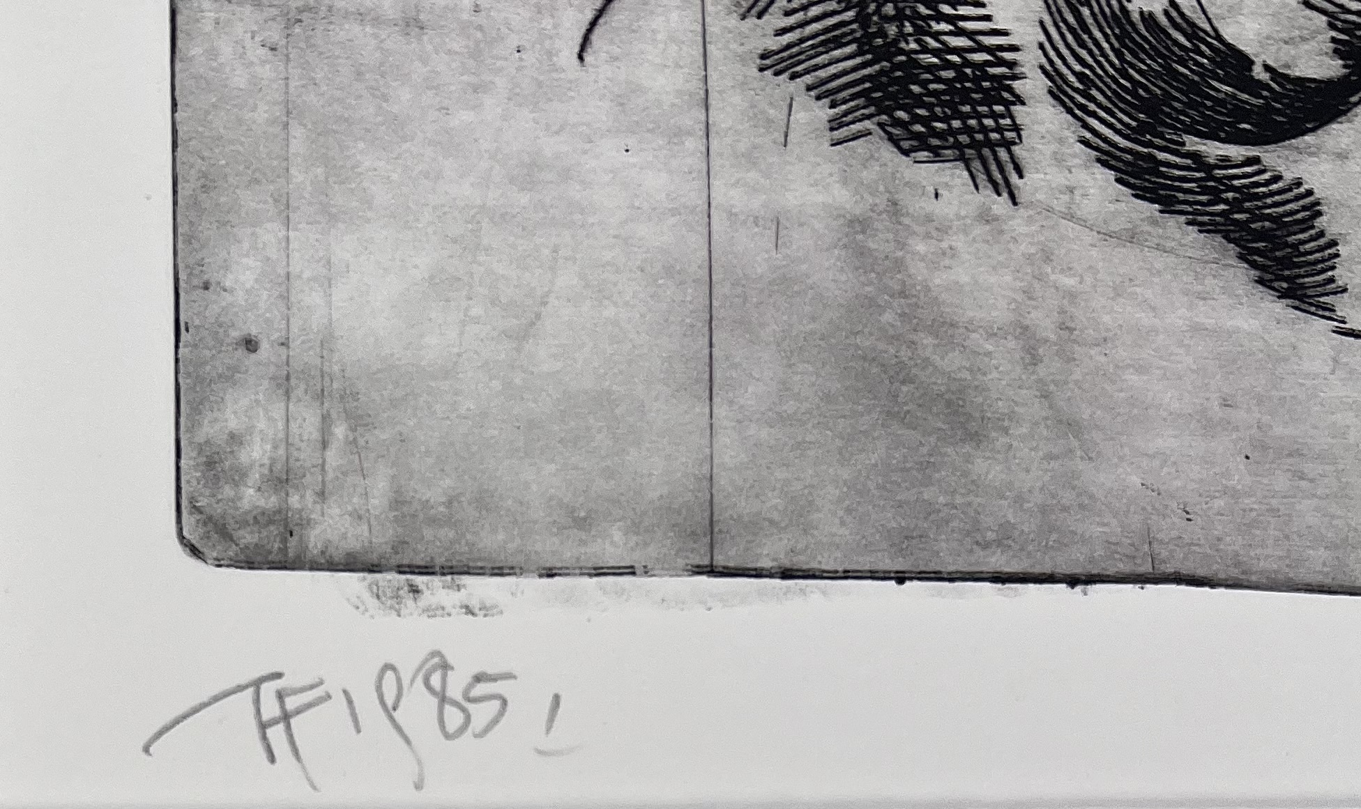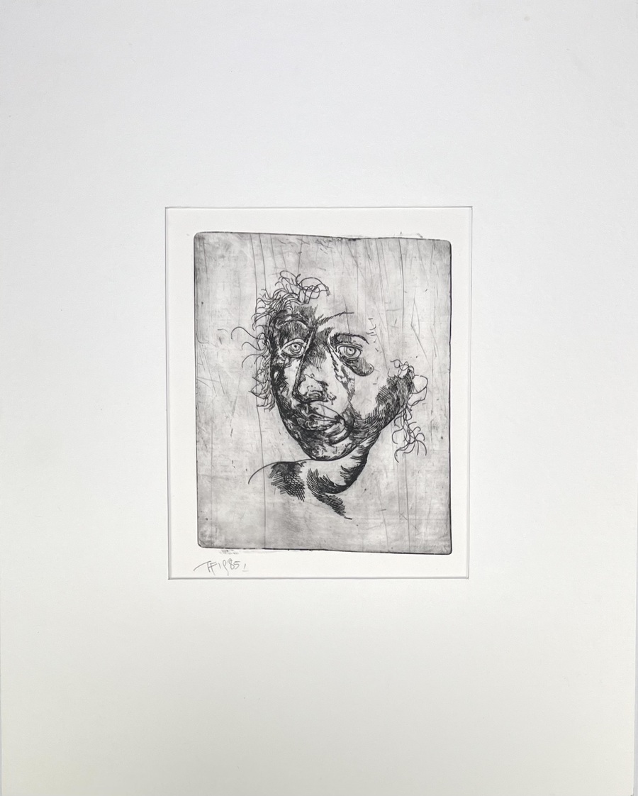 Ets op papier van Theo Forrer (1923–2004), uitgevoerd in expressieve grafische stijl. Het portret toont een hoofd met vervormde trekken, opgebouwd uit krachtige lijnen en arceringen. Linksonder met potlood gesigneerd TF en gedateerd 1985. De zichtbare plaatrand en krassporen rond het beeldvlak wijzen op ambachtelijke druktechniek. Geïnteresseerd? Bezoek onze kijkdagen op 29, 30 of 31 augustus van 11:00 tot 17:00 uur! |