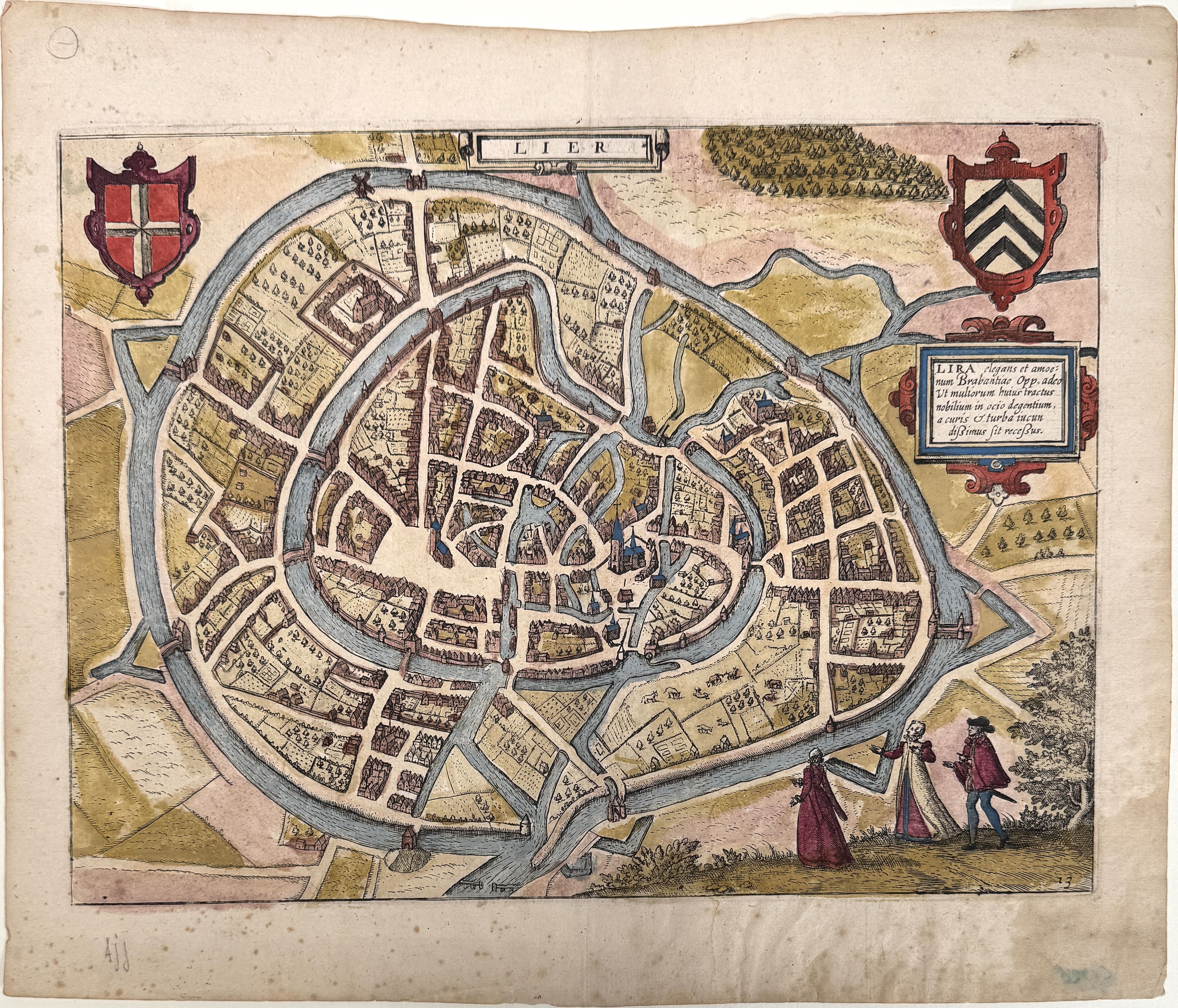 Kopergravure handgekleurd van de stad Lier, uitgegeven in 1612 door Willem Blaeu te Amsterdam als onderdeel van Lodovico Guicciardini's Beschryvinghe van alle Neder-landen. De stadsplattegrond toont Lier binnen haar vestingstructuur, voorzien van handgekleurde elementen, wapenschilden, figuren en cartouches. Uitgevoerd in gravure op handgeschept papier. Ongesigneerd, rechtsonder genummerd in de plaat. Wil je deze kopergravure in het echt bekijken? Kom naar de kijkdagen op 29, 30 en 31 augustus! |