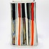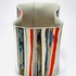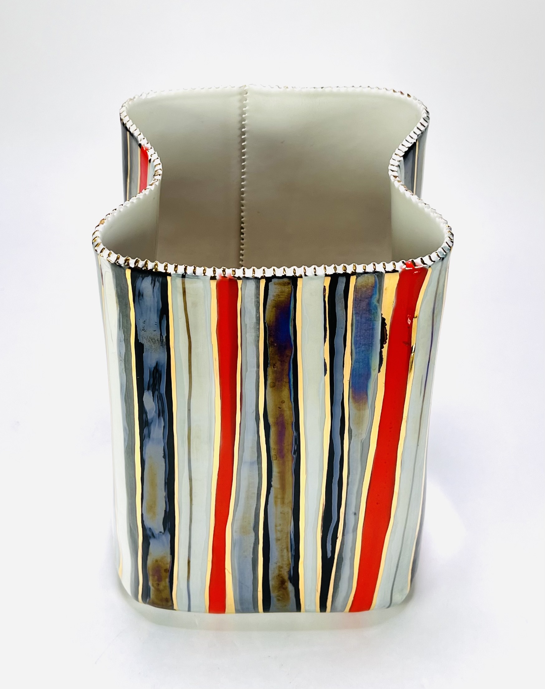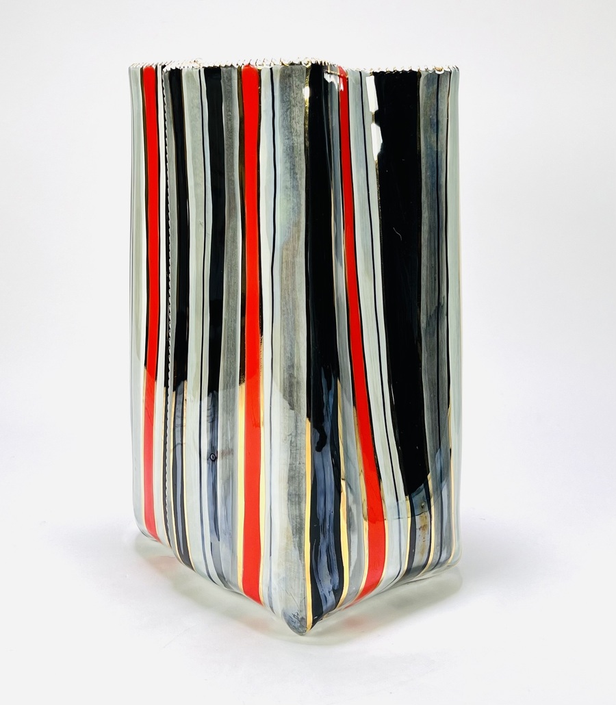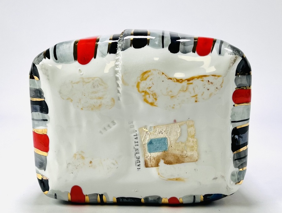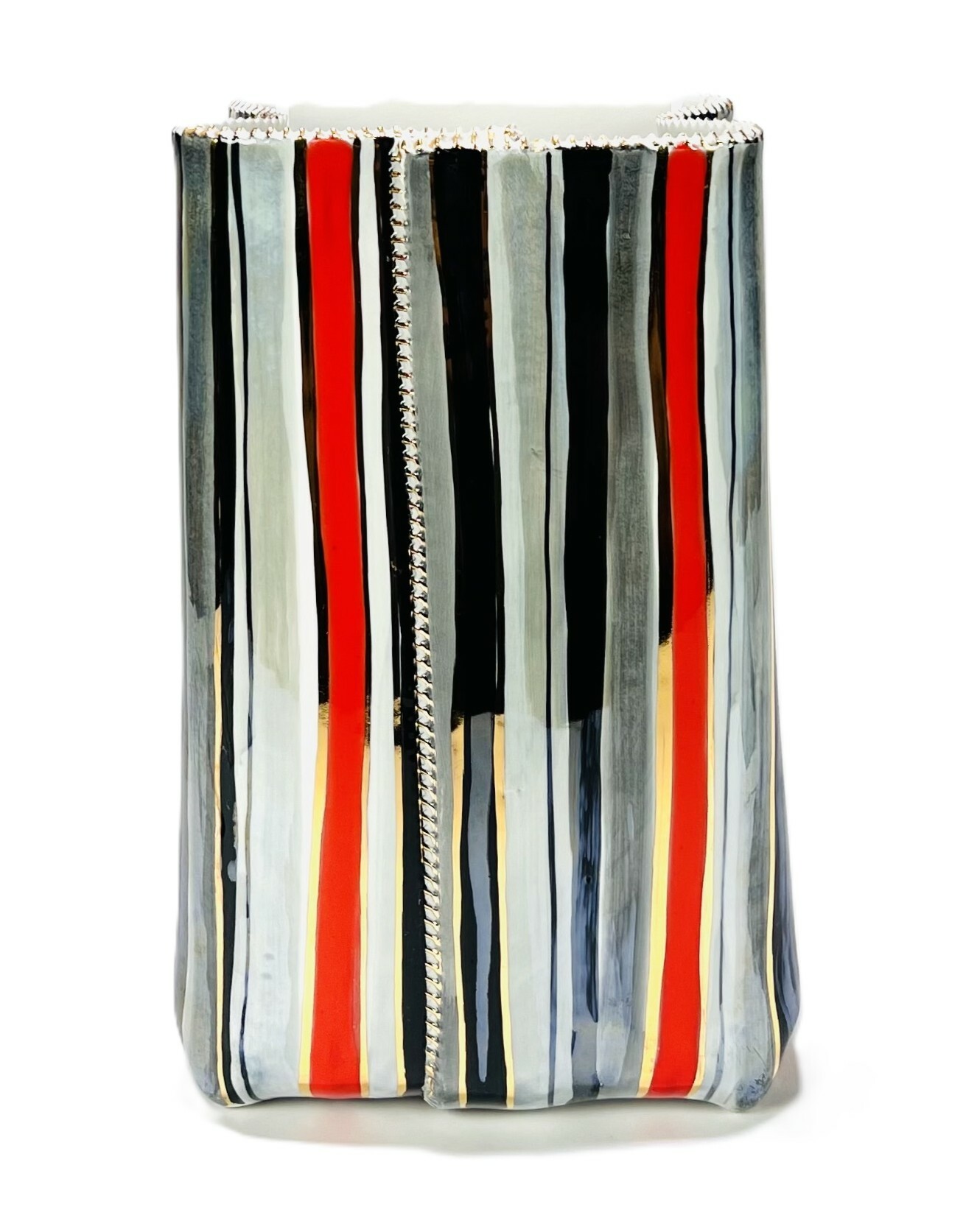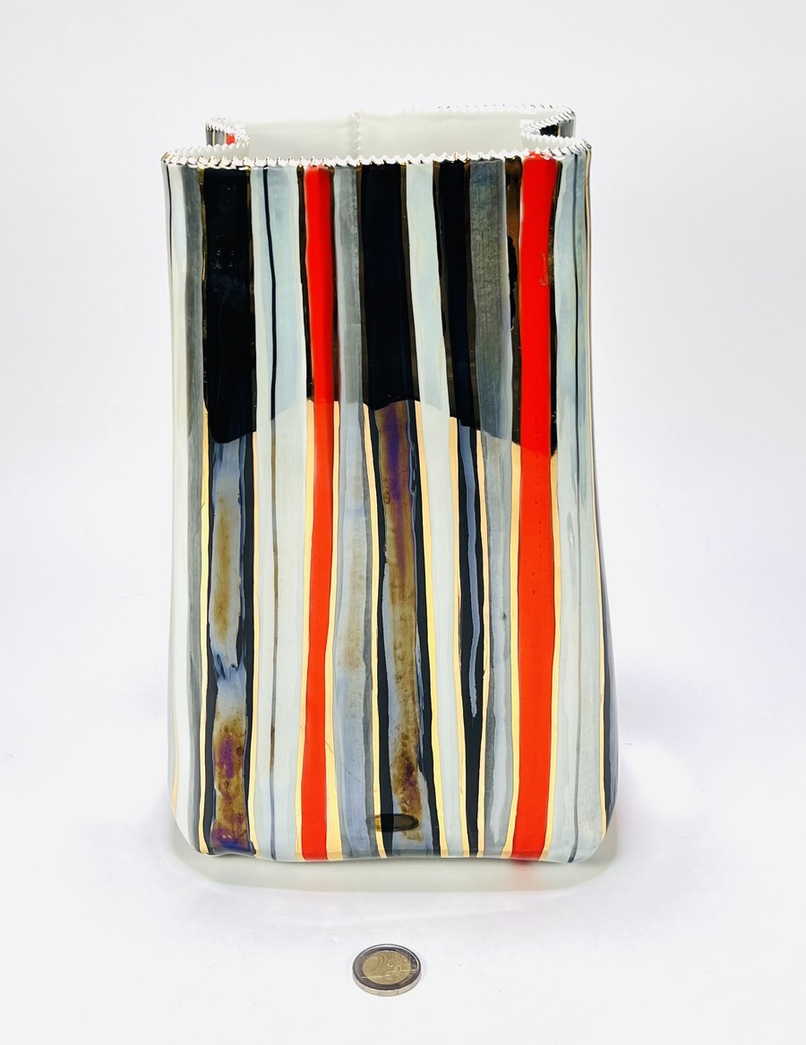 Porseleinen vaas, circa 1970-1990, uitgevoerd in een moderne abstracte stijl. De vaas heeft een vierkante, licht golvende vorm met een gekartelde bovenrand. Handbeschilderd met verticale banen in zwart, grijs, rood en goud. Onderaan gemerkt met “MADE IN ITALY” en genummerd 1113. Kom langs tijdens de kijkdagen (29 t/m 31 augustus) en ontdek deze vaas zelf! |