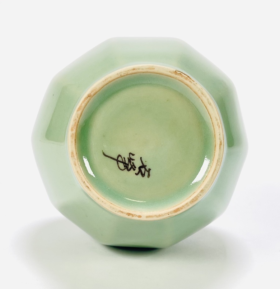 Celadon gekleurde keramische flesvaas, Korea, circa midden 20e eeuw, vervaardigd uit steengoed met transparant glanzende glazuurlaag. De vaas toont bloemmotieven in wit en roodbruin met zwarte details, op een lichtgroene fond. Achtzijdig gevormd lichaam en hals. Onder gesigneerd met Koreaanse kalligrafie. Kom langs tijdens de kijkdagen (29 t/m 31 augustus) en ontdek dit object zelf! |