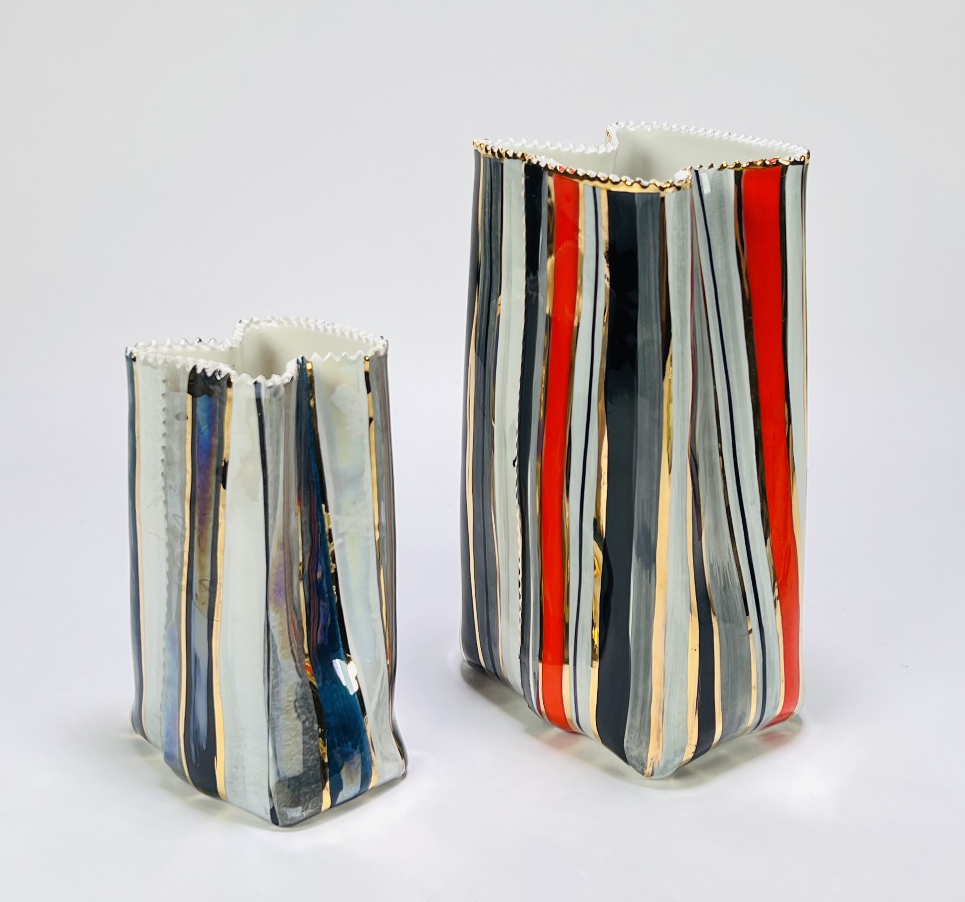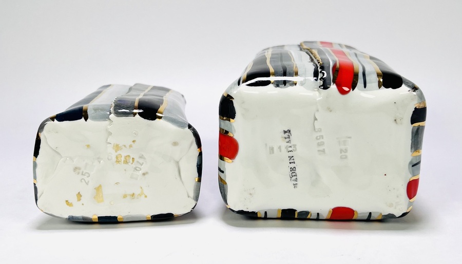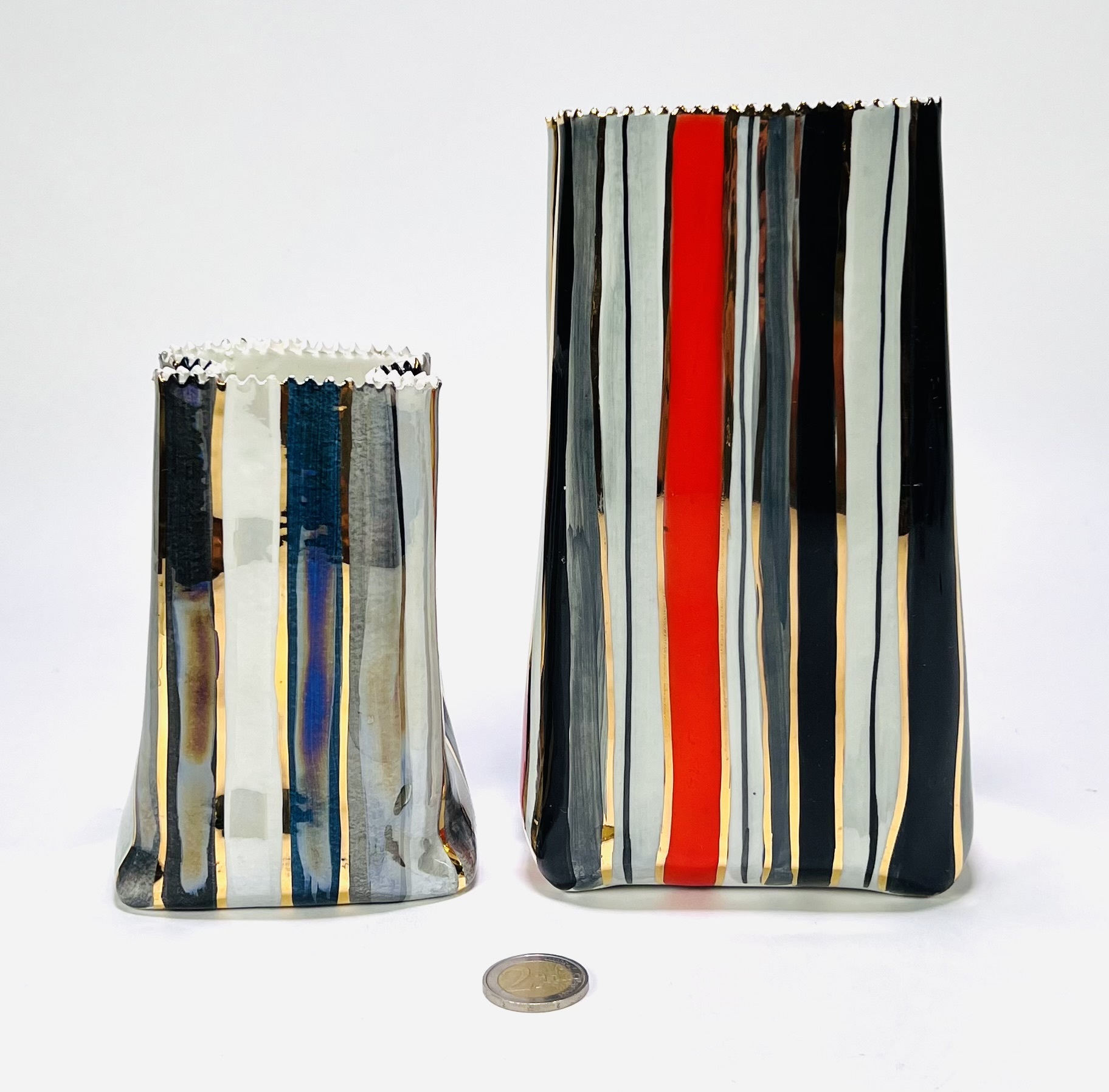 Set van twee porseleinen vazen uit Italië, midden 20e eeuw, uitgevoerd in glazuurschildering met accenten. De vazen hebben een gevouwen, onregelmatige vorm met golvende randen en zijn aan de onderzijde gemerkt met "MADE IN ITALY" en productienummers. De decoratie bestaat uit verticale penseelstrepen in rood, zwart, grijs en goud. Kom langs tijdens de kijkdagen (29 t/m 31 augustus) en ontdek deze vazen zelf! |