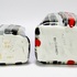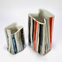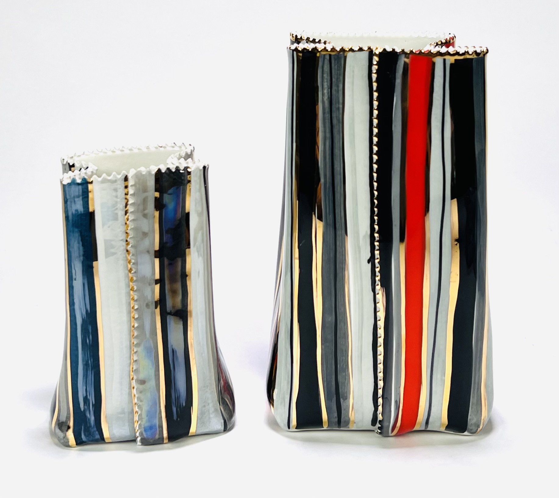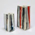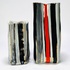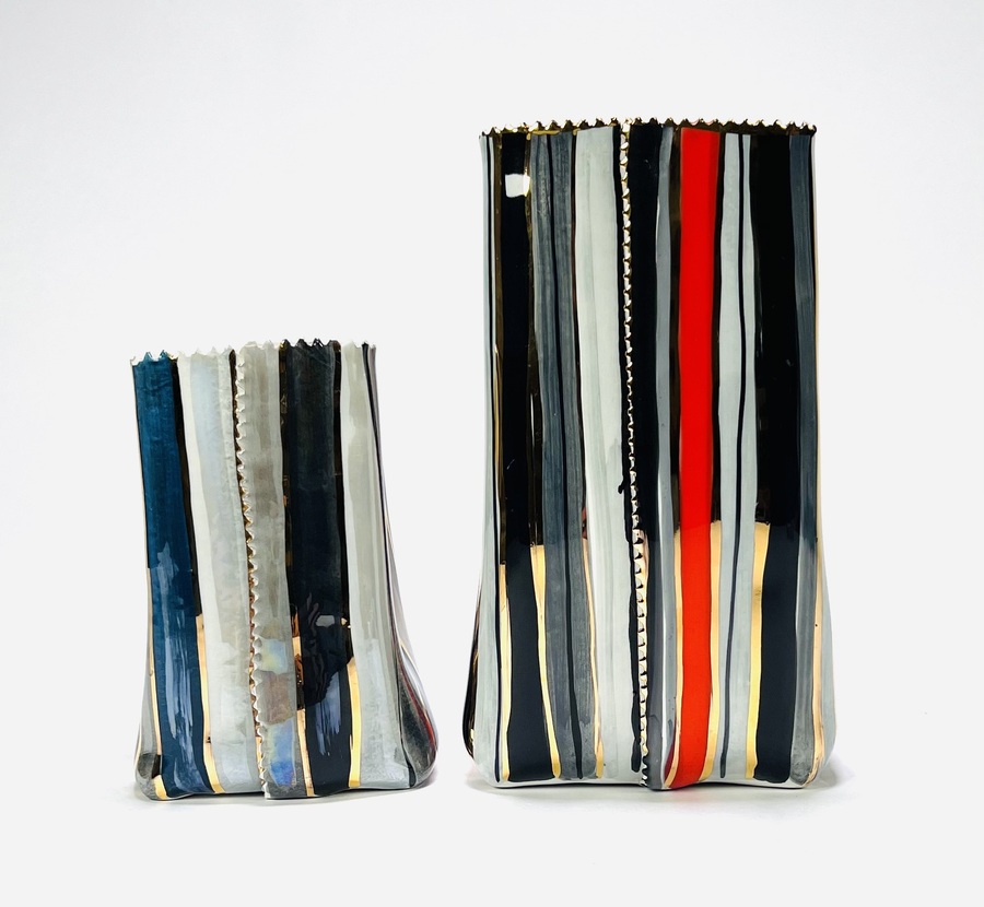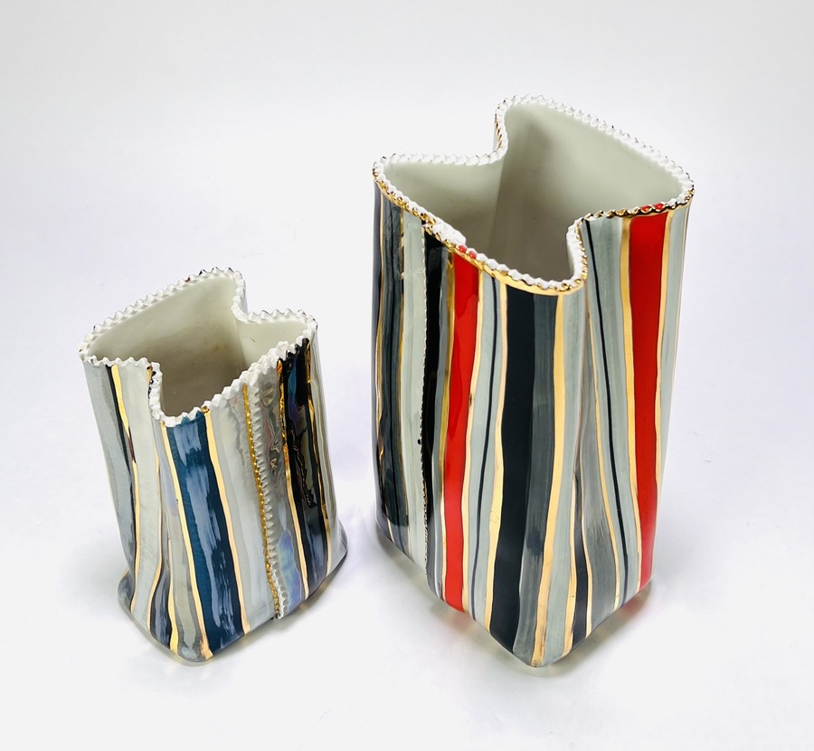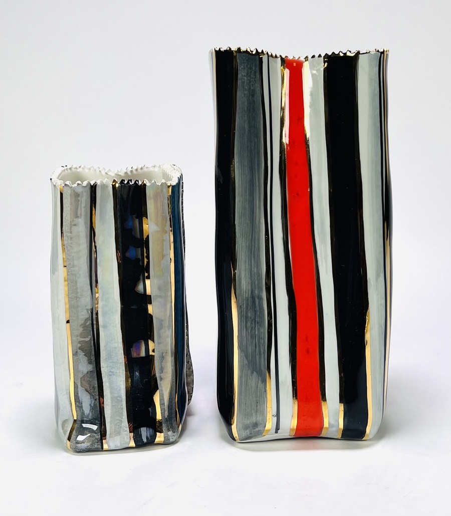 Set van twee porseleinen vazen uit Italië, midden 20e eeuw, uitgevoerd in glazuurschildering met accenten. De vazen hebben een gevouwen, onregelmatige vorm met golvende randen en zijn aan de onderzijde gemerkt met "MADE IN ITALY" en productienummers. De decoratie bestaat uit verticale penseelstrepen in rood, zwart, grijs en goud. Kom langs tijdens de kijkdagen (29 t/m 31 augustus) en ontdek deze vazen zelf! |