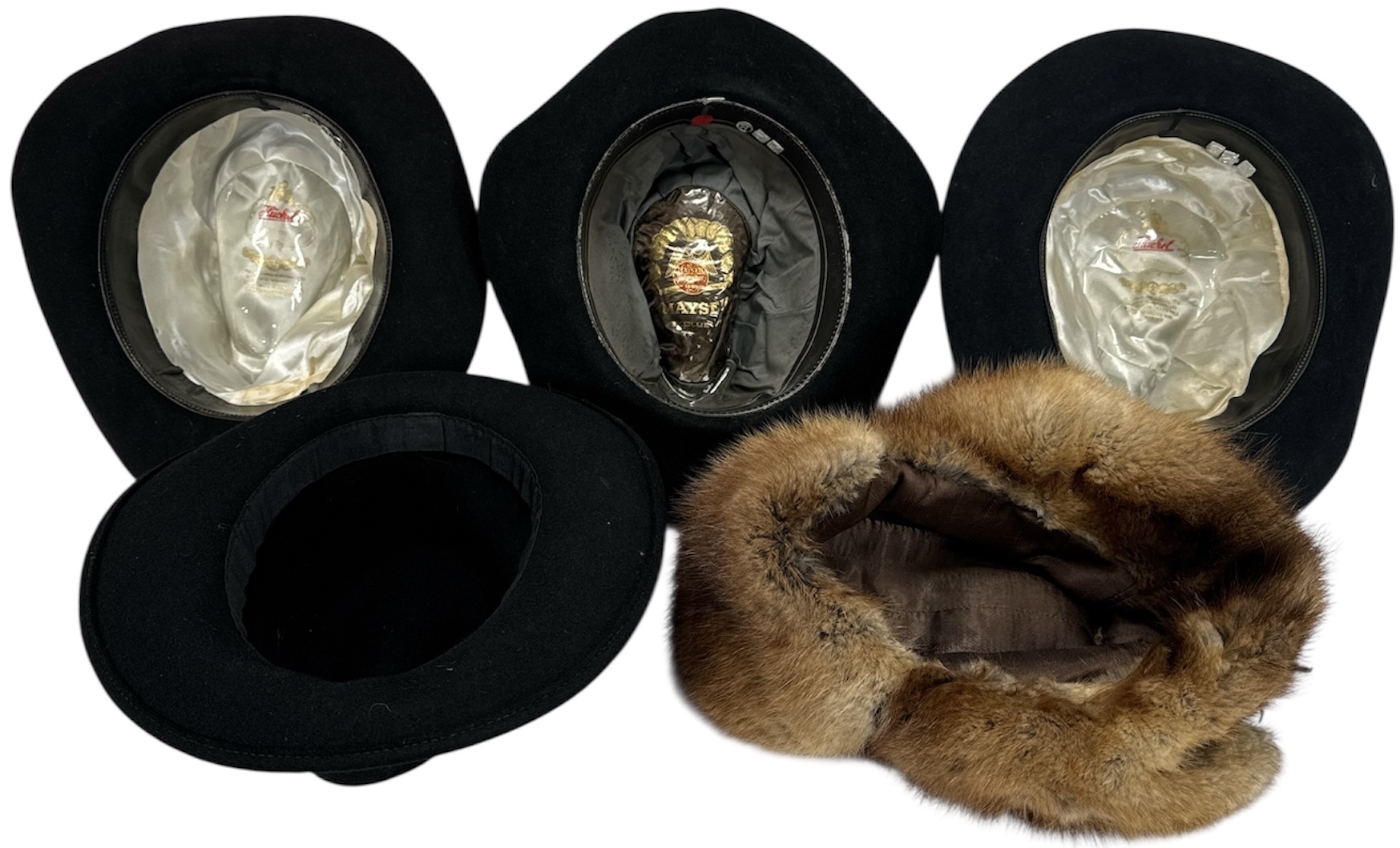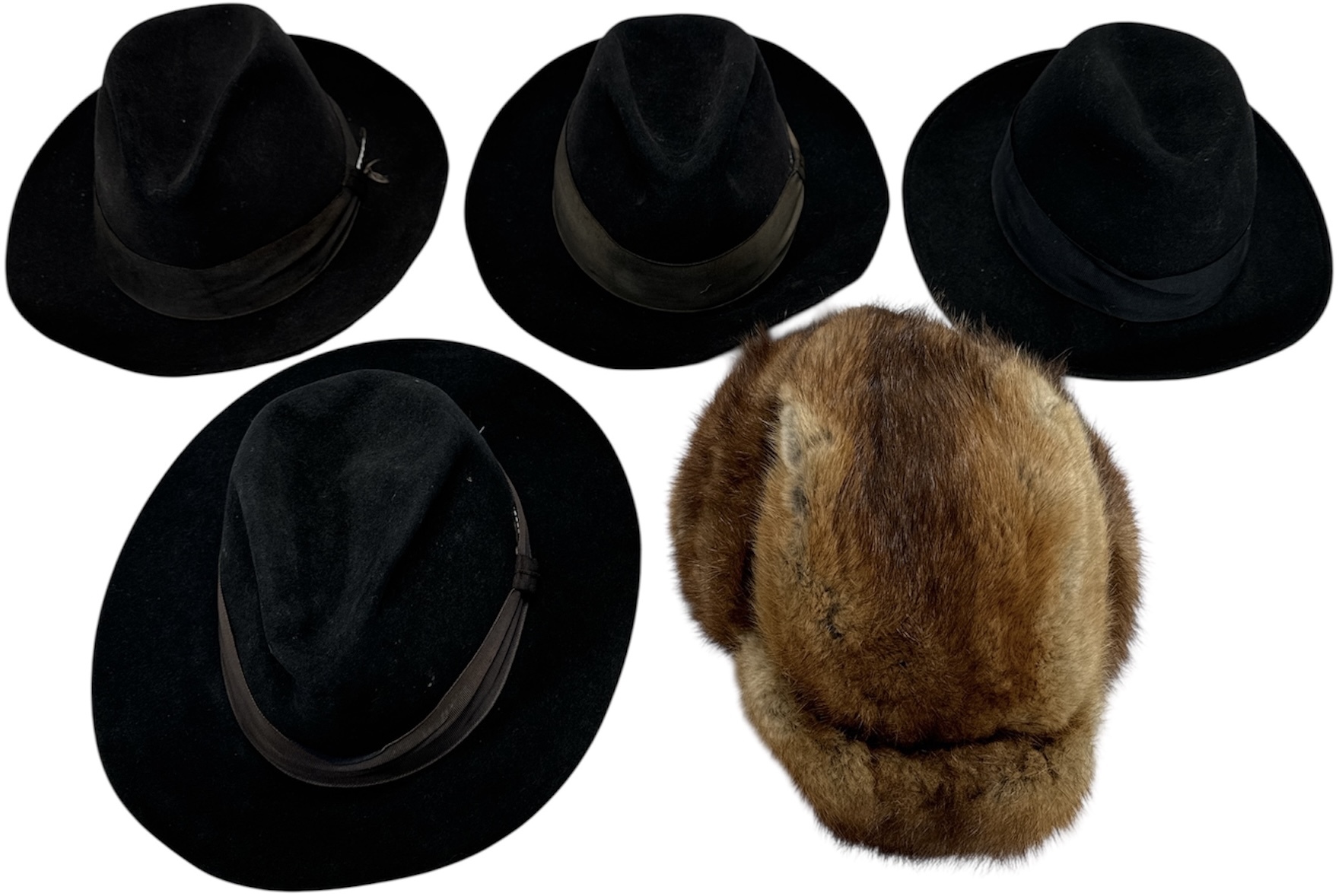 Deze collectie daterend uit midden 20e eeuw (circa 1940-1970), bestaat uit vier zwarte vilten hoeden in fedora-stijl en één bruine bontmuts. De vilten hoeden zijn gevoerd met satijn en voorzien van leren banden. De bontmuts heeft een volle pels en stoffen voering. Het geheel is representatief voor klassieke herenhoeden en winterkleding uit de genoemde periode. Wil je de hoede in het echt bekijken? Kom naar de kijkdagen op 29, 30 en 31 augustus! |