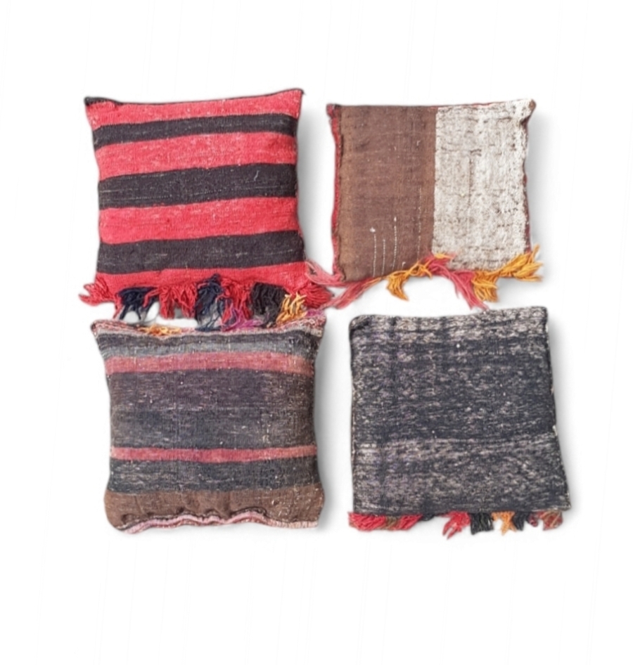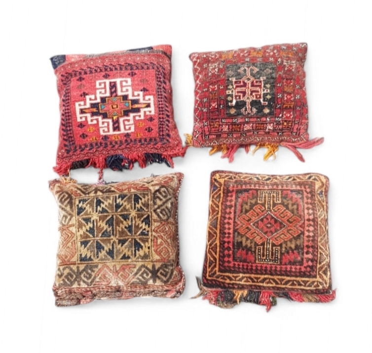 Set van vier oriëntaalse kussens, uitgevoerd in handgeweven wol en katoen, omstreeks midden 20e eeuw. De kussenhoezen zijn vervaardigd van hergebruikte tapijt- en kelimfragmenten met traditionele geometrische en florale motieven. Voorzijde rijk gedecoreerd, achterzijde eenvoudiger, deels gestreept. Meerkleurige franjes onderaan. Deze kussens zelf beoordelen? Je bent welkom op onze kijkdagen op 29, 30 en 31 augustus! |