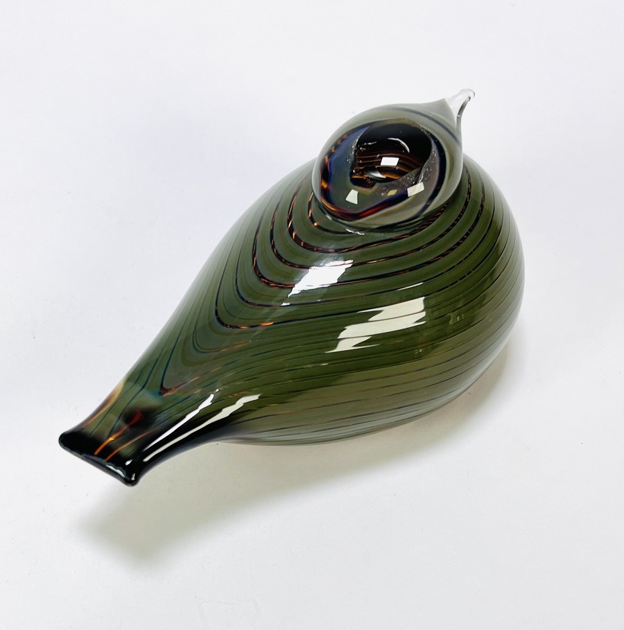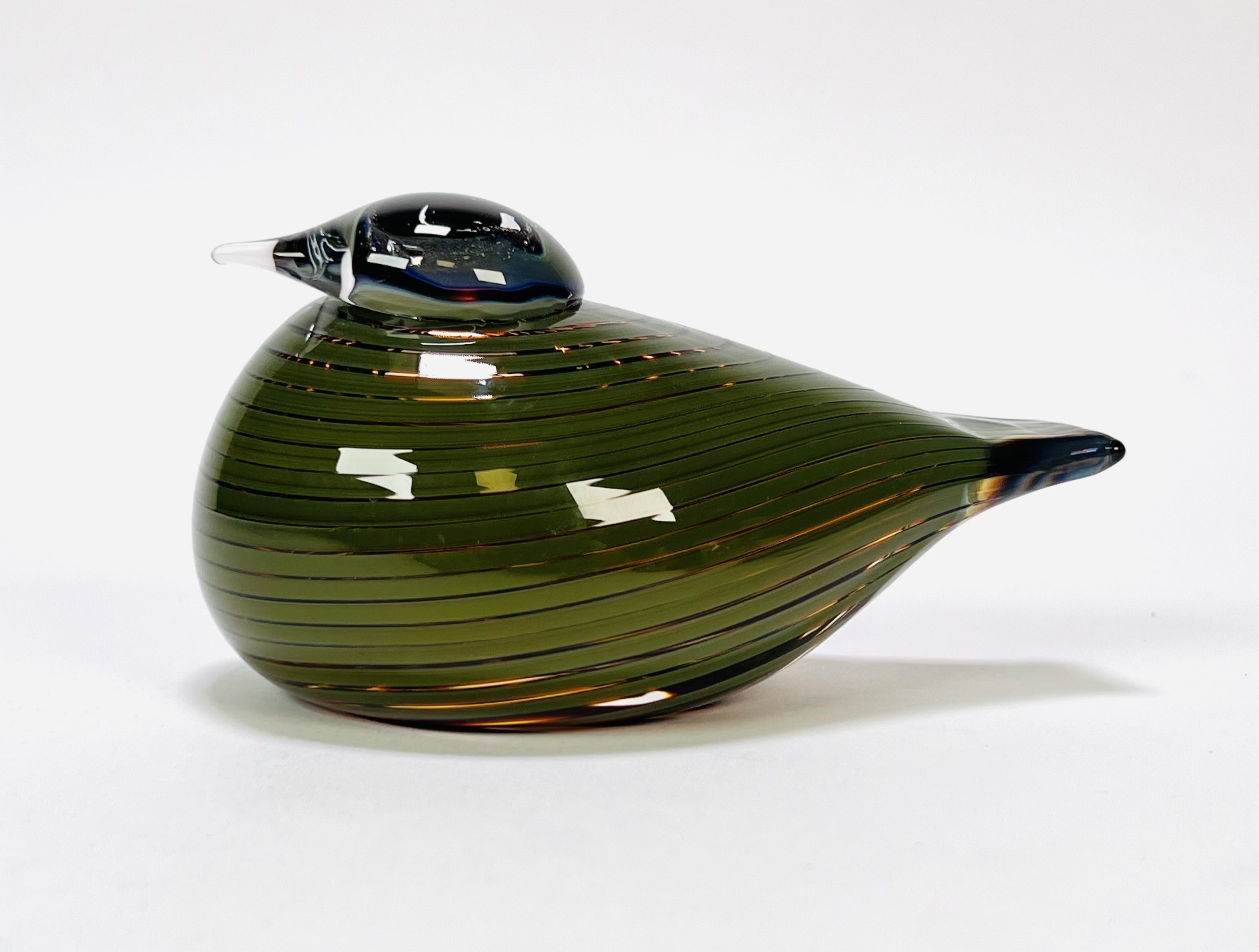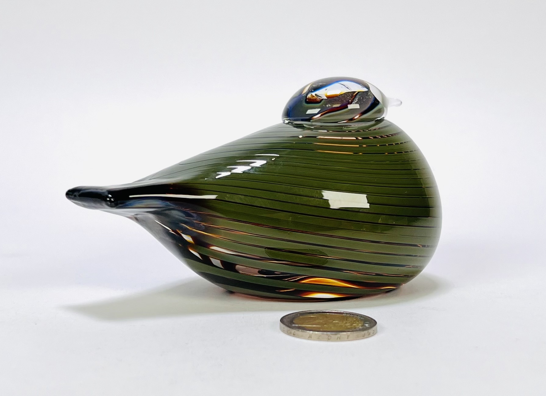 Glazen vogel in modern Scandinavisch design door Oiva Toikka (1931–2019) voor Iittala, Finland, 2004. Handgeblazen glas met groen en blanke horizontale strepen met een helder snaveltje. Strakke, gestileerde vormgeving. Onderzijde gesigneerd en voorzien van Iittala sticker. Uitgevoerd als onderdeel van de Birds by Toikka-collectie, kenmerkend voor het Finse studioglas. De vogel zelf beoordelen? Je bent welkom op onze kijkdagen op 29, 30 en 31 augustus! |