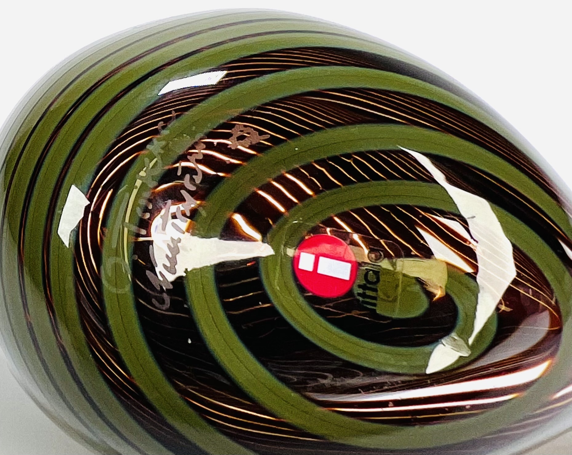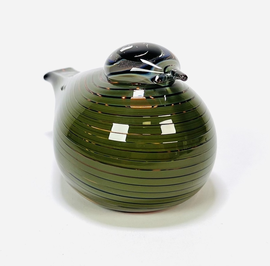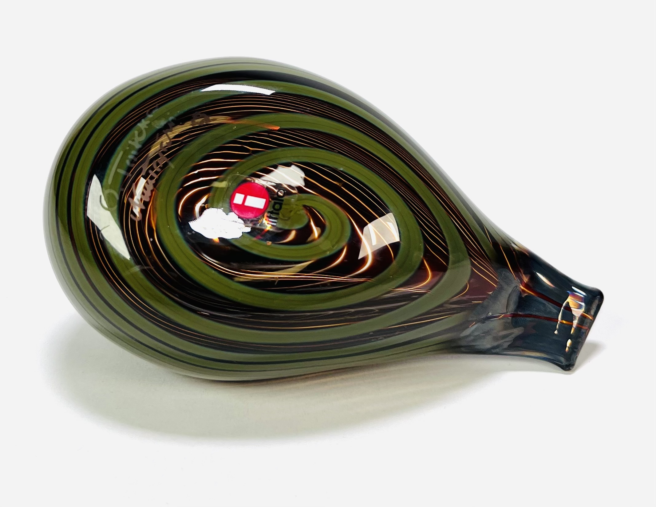 Glazen vogel in modern Scandinavisch design door Oiva Toikka (1931–2019) voor Iittala, Finland, 2004. Handgeblazen glas met groen en blanke horizontale strepen met een helder snaveltje. Strakke, gestileerde vormgeving. Onderzijde gesigneerd en voorzien van Iittala sticker. Uitgevoerd als onderdeel van de Birds by Toikka-collectie, kenmerkend voor het Finse studioglas. De vogel zelf beoordelen? Je bent welkom op onze kijkdagen op 29, 30 en 31 augustus! |