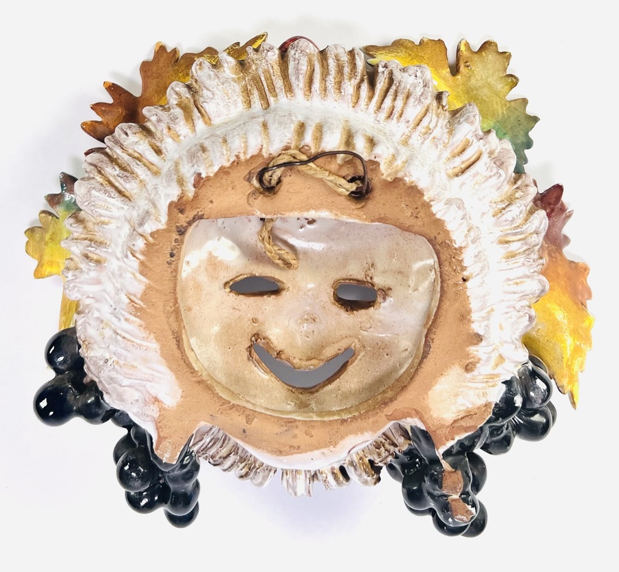 Geglazuurd aardewerken wandmasker met druivenrankdecor en uitgesneden gezicht, circa 1970–1980. Het driedimensionale blad‑ en druivendecor omlijst een glimlachend gezicht met uitgesneden ogen en mond, uitgevoerd in groen, geel, oranje en donkerblauw glazuur. Kom langs tijdens de kijkdagen (29 t/m 31 augustus) en ontdek dit beeld zelf! |