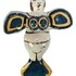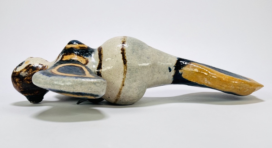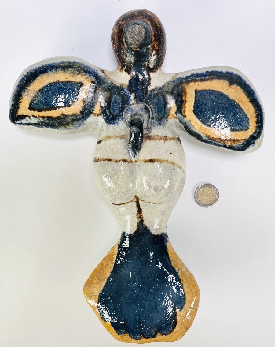 Een handgevormd keramisch wandobject uit de midden tot late 20e eeuw, uitgevoerd in een primitivistische stijl. Het beeld stelt een gestileerde figuur voor met vleugelachtige armen, afgewerkt met een glazuur in gebroken wit, donkerblauw en goudbruine tinten. De kleuren zijn onregelmatig aangebracht, wat zorgt voor een textuurrijk oppervlak. Registreer nu en bied eenvoudig online mee op dit beeld! |
