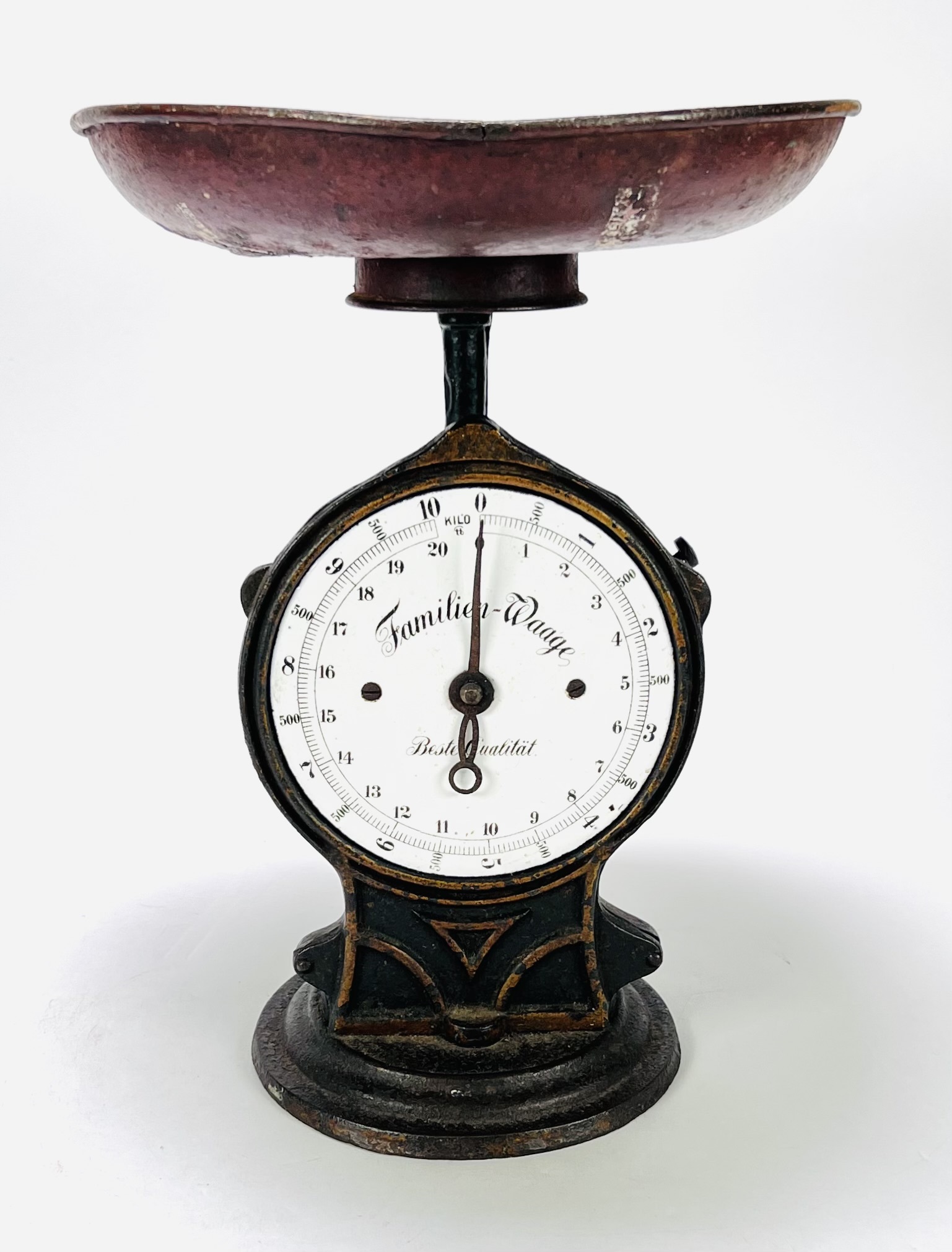 Een gietijzeren keukenweegschaal uit de eind 19e eeuw, uitgevoerd met een geëmailleerde weegschaal en een bedrukte wijzerplaat. Het object heeft een utilitair karakter met decoratieve gietijzeren motieven op de basis. De wijzerplaat vermeldt "Familien-Waage" en "Beste Qualität" en geeft een weegbereik tot 10 kilogram aan. Zelf beoordelen? Je bent welkom op onze kijkdagen op 29, 30 en 31 augustus! |