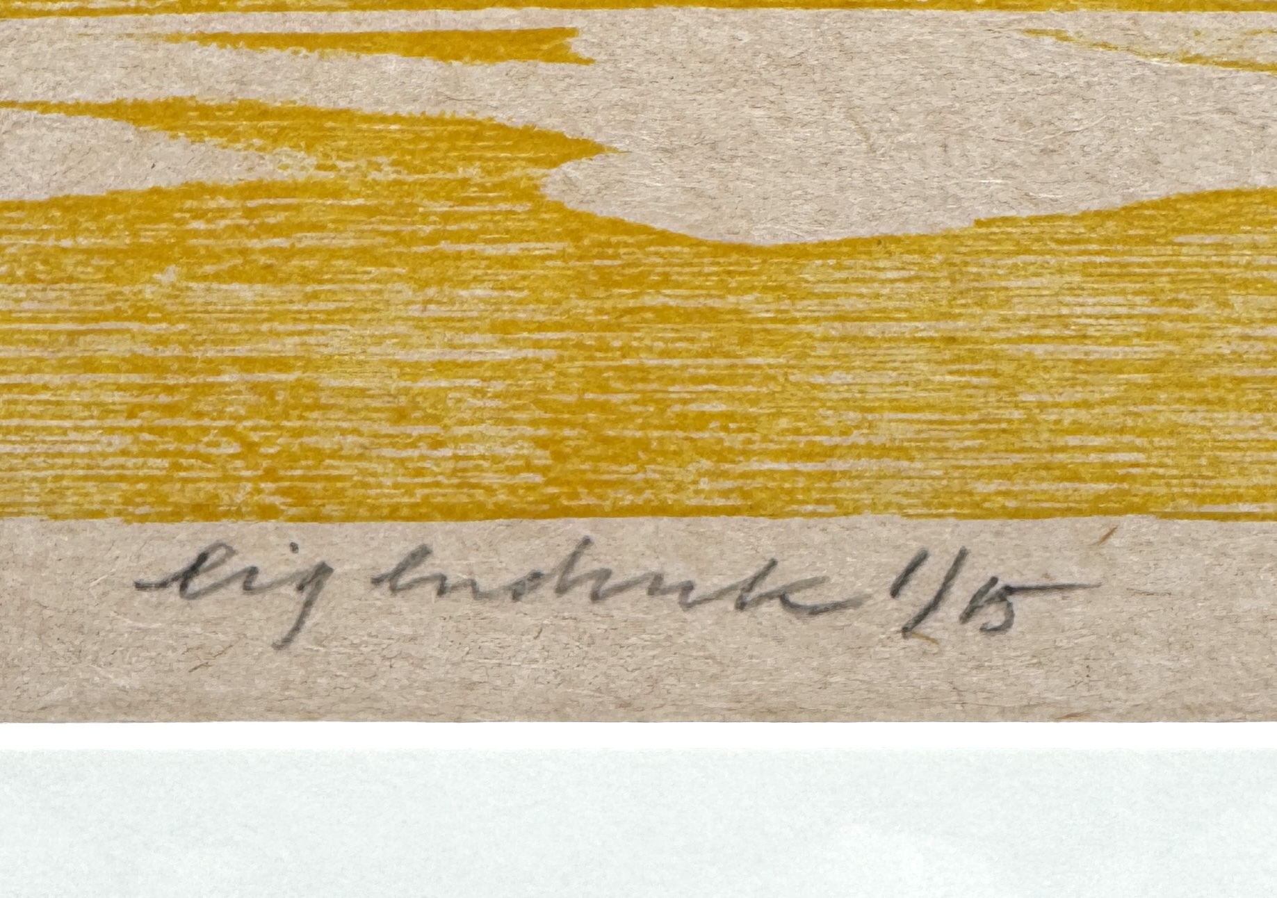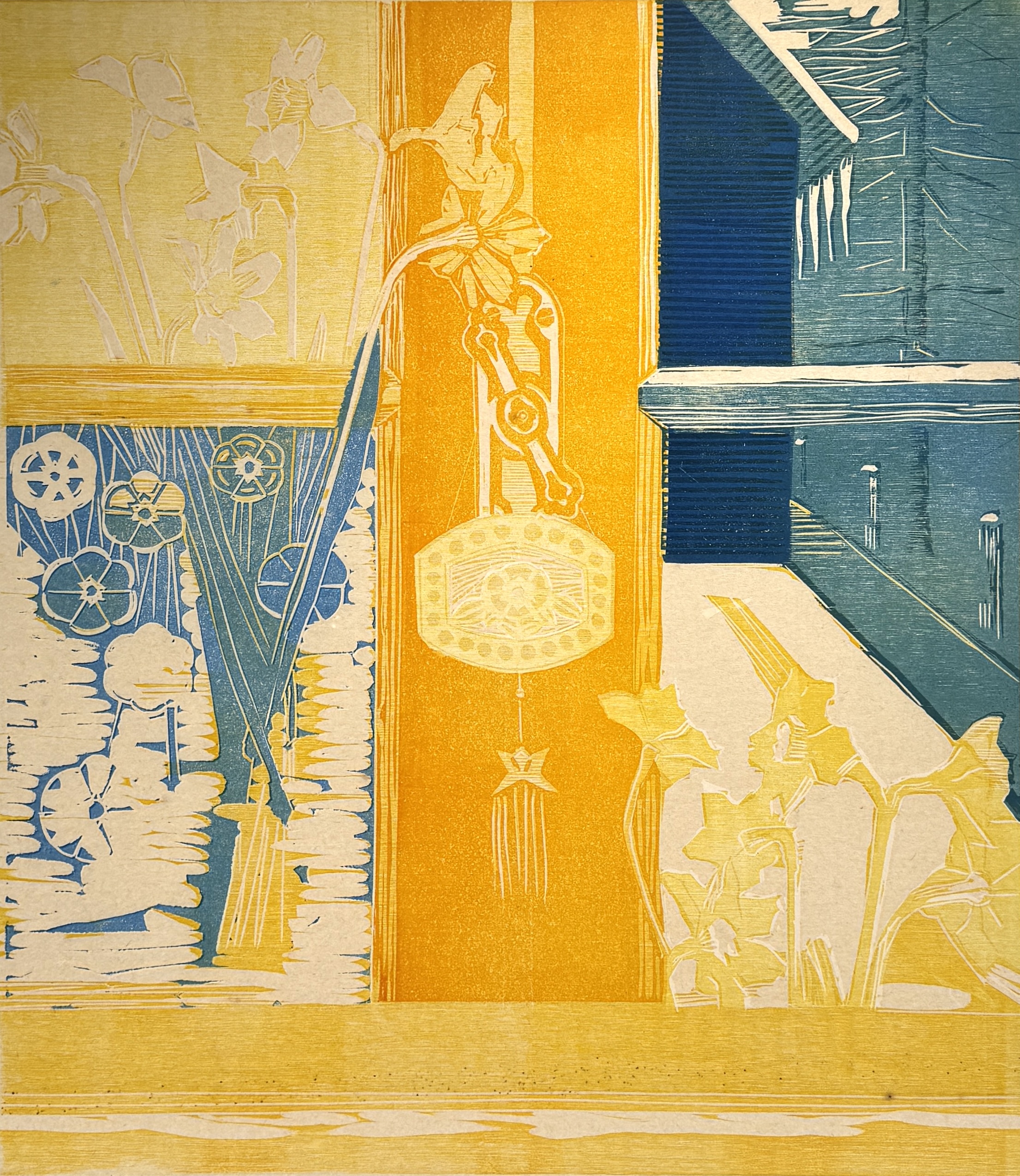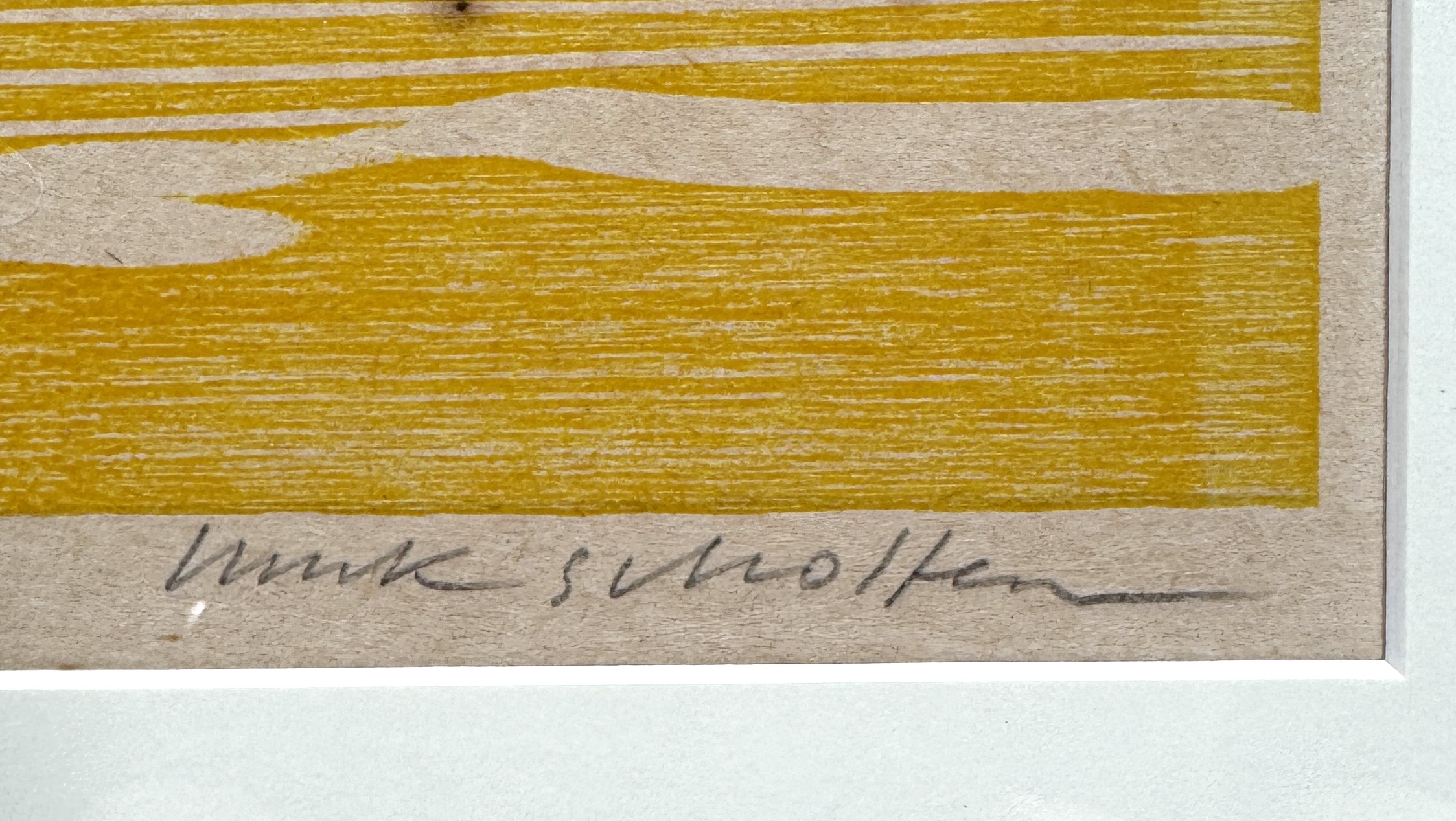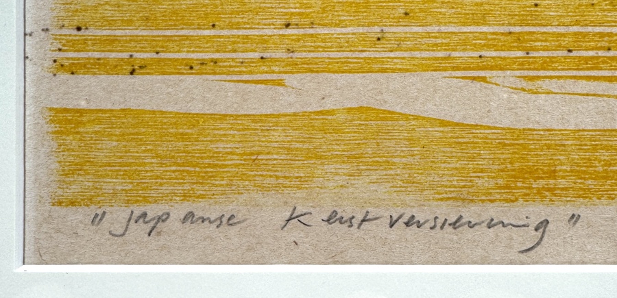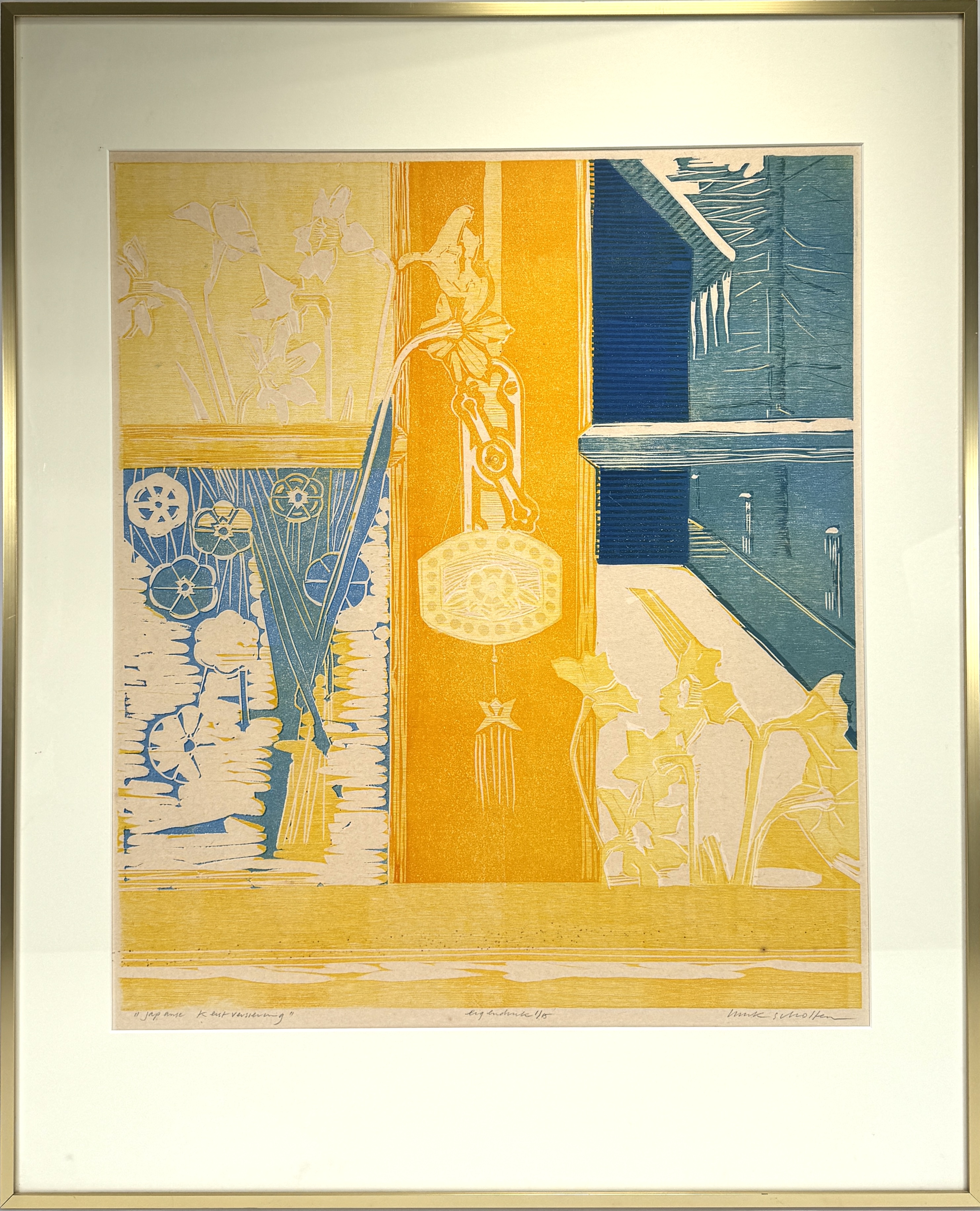 Kleurenhoutsnede door Mink Scholten, getiteld “Japanse Kerstversiering”, uitgevoerd op papier, omstreeks eind 20e eeuw. De grafiek toont een decoratieve compositie van bloemen, architectonische vormen en een centrale lantaarn, beïnvloed door Japanse en Art Nouveau-stijl. Rechtsonder met potlood gesigneerd, linksonder getiteld, midden onder voorzien van oplagenummer 1/15. Het werk is helder gedrukt in blauw, geel en crème. Zelf beoordelen? Je bent welkom op onze kijkdagen op 29, 30 en 31 augustus! |