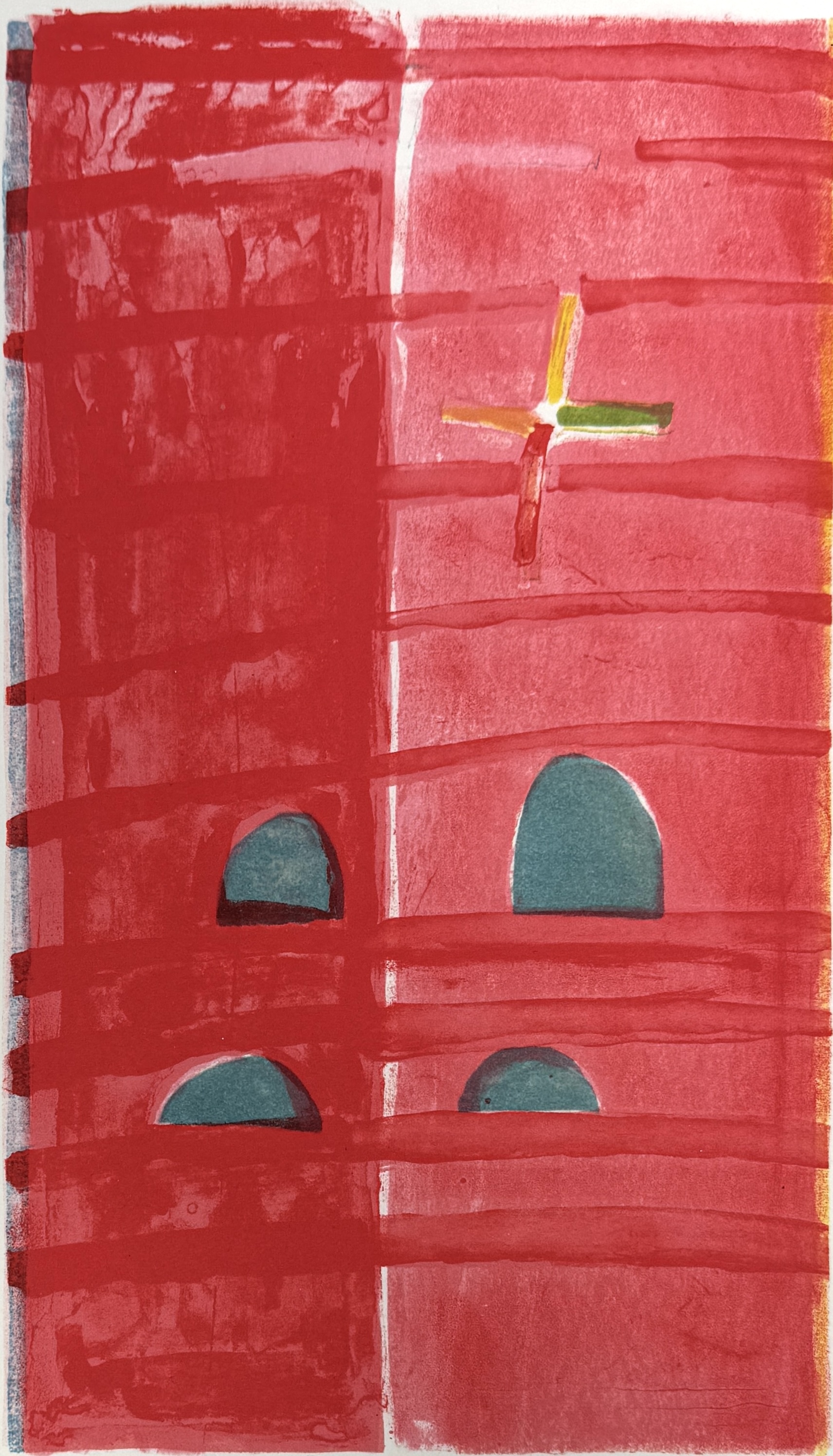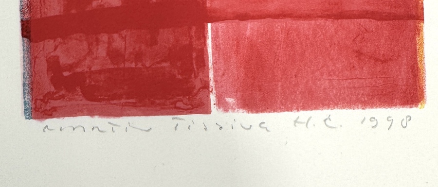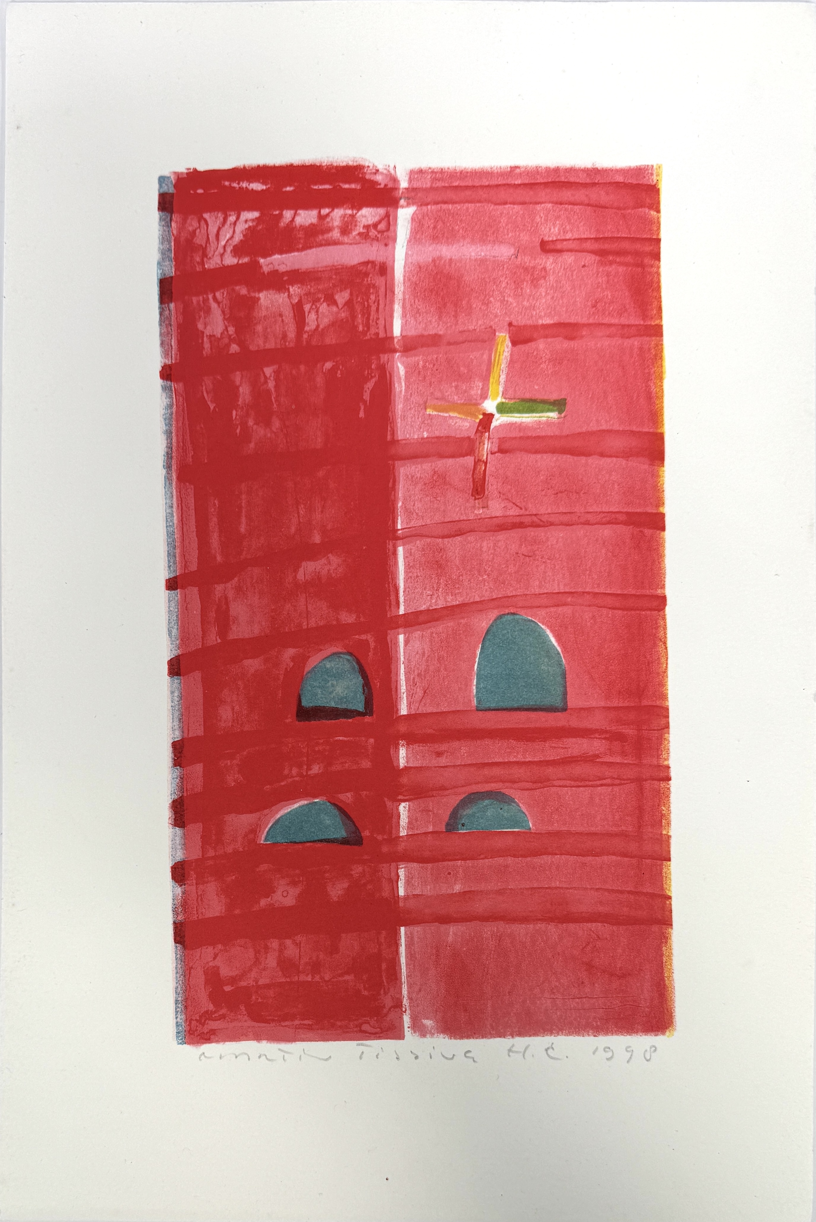 Litho in kleur op papier van Martin Tissing (1936–2021), gedateerd 1998. Abstracte compositie in roodtinten met boogvormige vensters en kruisvormig detail. Het werk toont architectonisch-geïnspireerde vlakken in geometrische ordening. Met potlood gesigneerd linksonder en rechtsonder aangeduid "H.C. 1998".