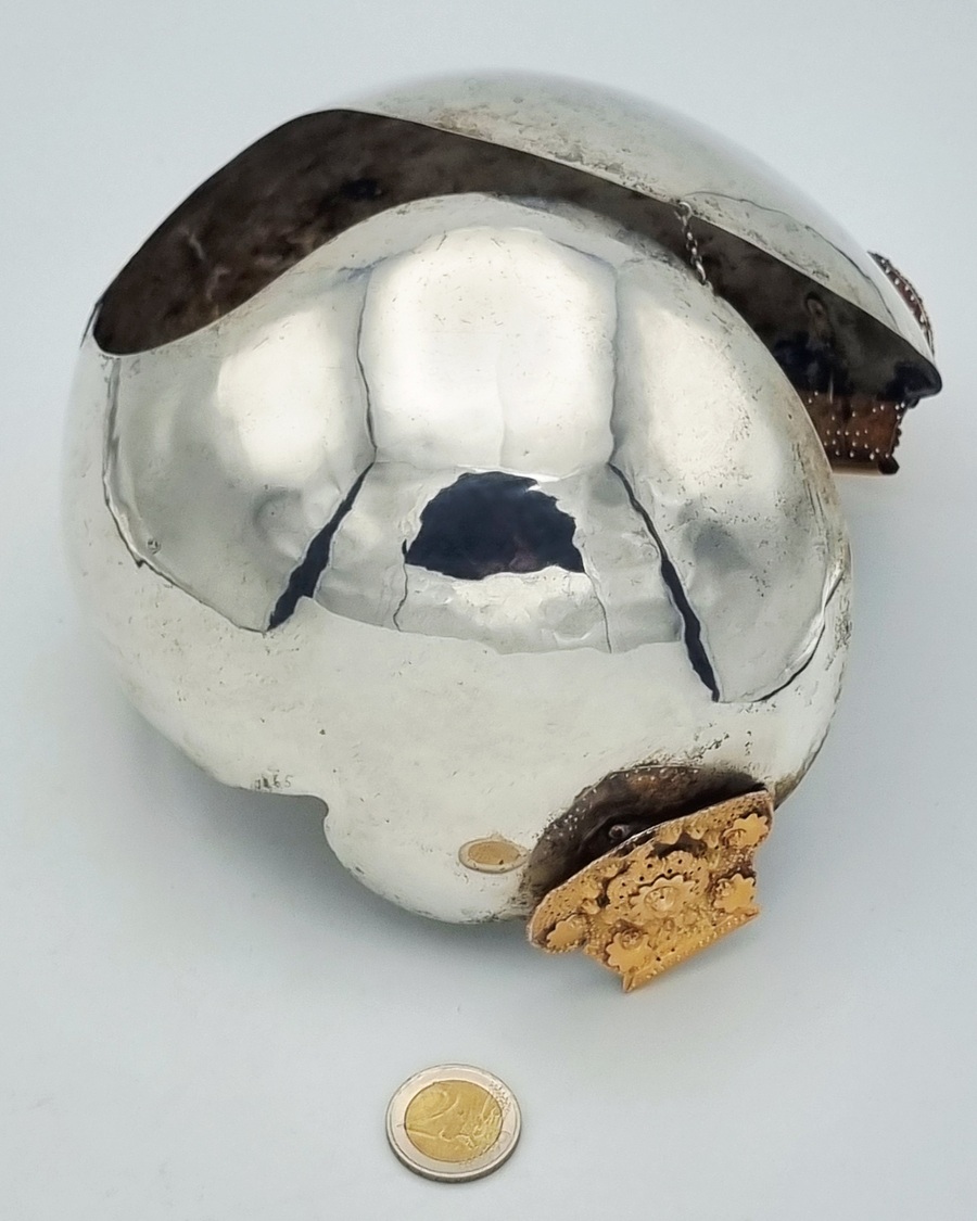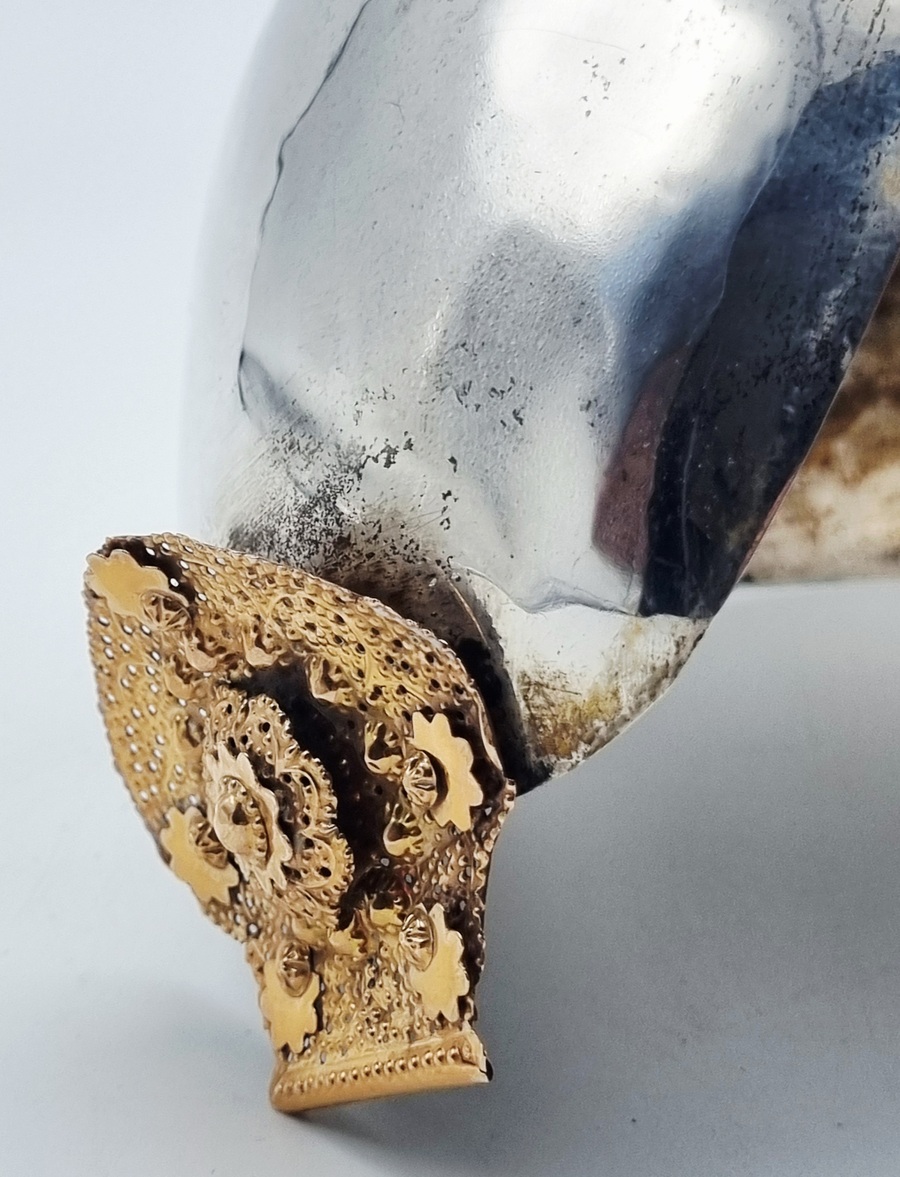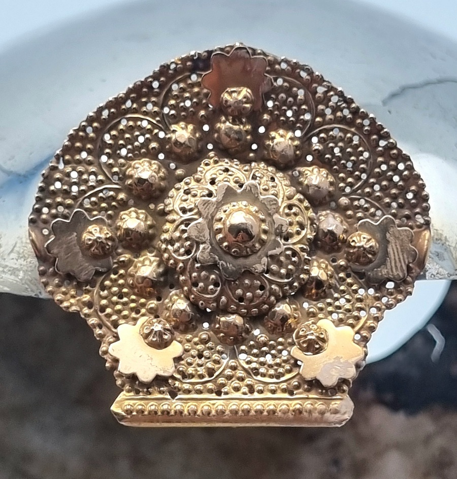 Zilveren oorijzer met 14 karaat gouden rozetbroches, Nederlands streekdracht-sieraad. Kap in tweede zilvergehalte (833), binnenzijde gemerkt lopende leeuw 2, broches gemerkt met eikenblad. Handgesmeed gedreven zilver, broches in filigrain en granulatie. Met korte veiligheidsketting en bijbehorende cilindrische doos. Datering omstreeks 1865. Wil je direct deelnemen? Plaats vanaf 22 augustus alvast een schriftelijk bod via onze website!! |