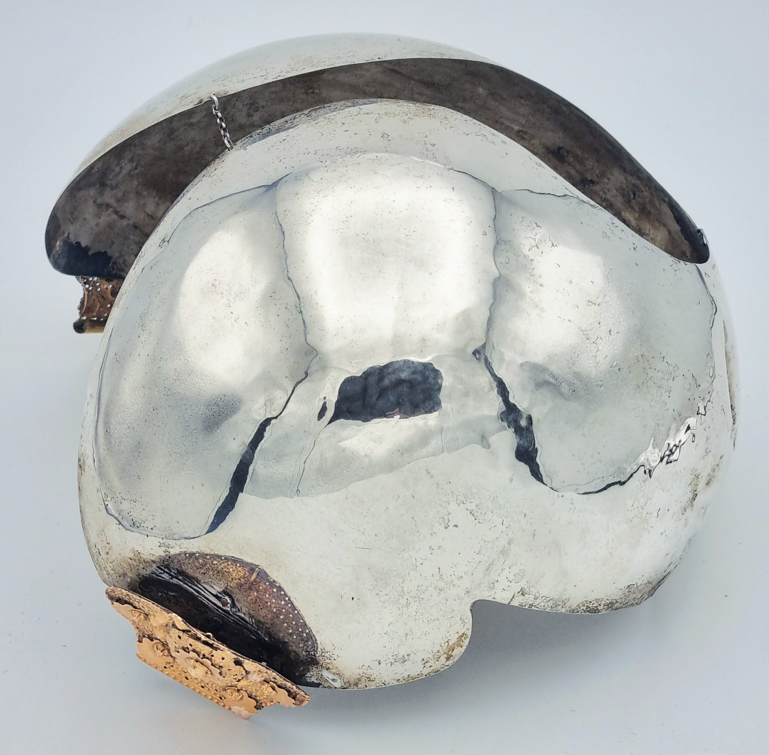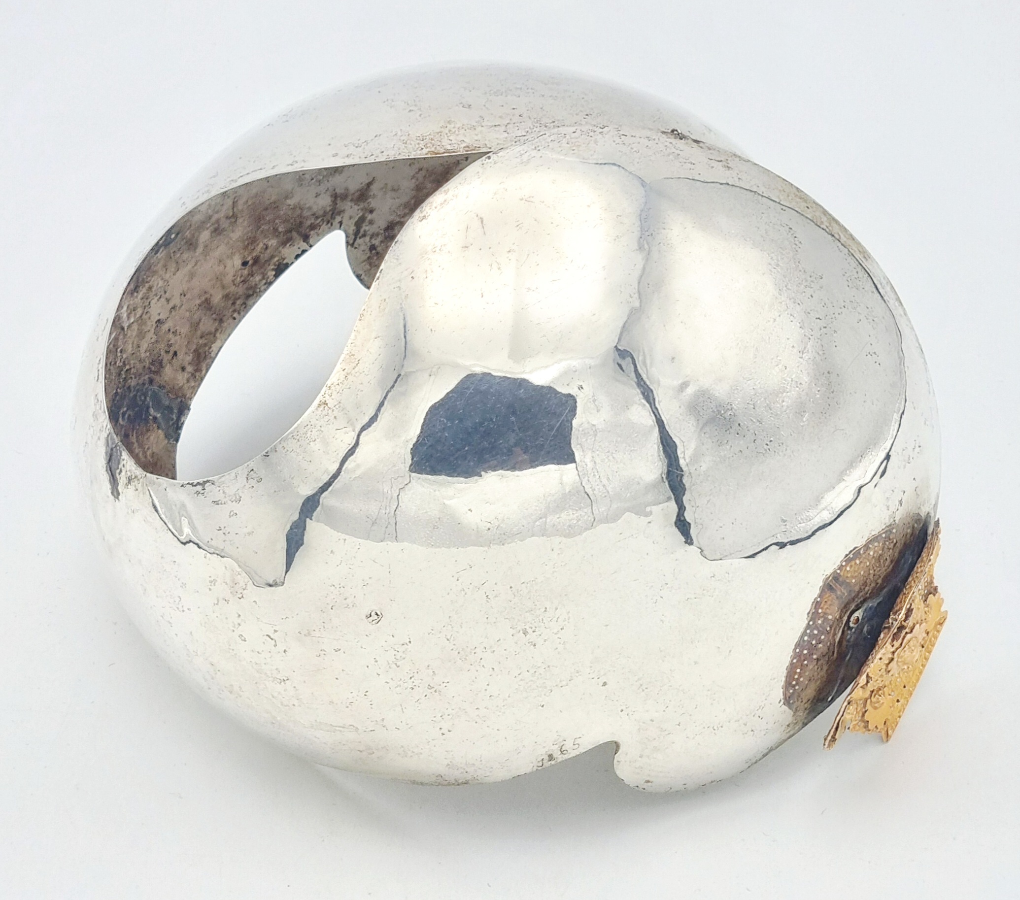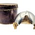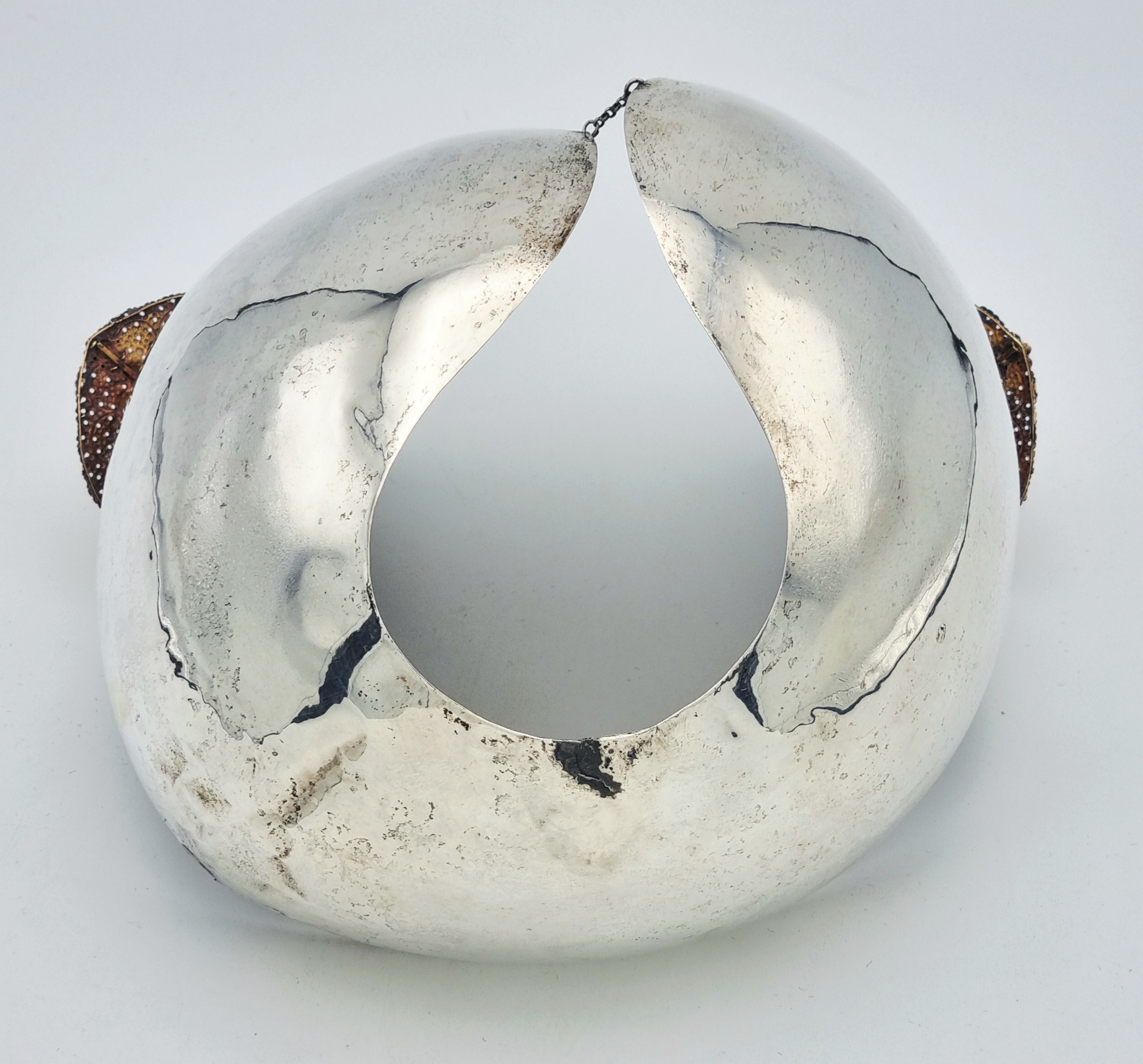 Zilveren oorijzer met 14 karaat gouden rozetbroches, Nederlands streekdracht-sieraad. Kap in tweede zilvergehalte (833), binnenzijde gemerkt lopende leeuw 2, broches gemerkt met eikenblad. Handgesmeed gedreven zilver, broches in filigrain en granulatie. Met korte veiligheidsketting en bijbehorende cilindrische doos. Datering omstreeks 1865. Wil je direct deelnemen? Plaats vanaf 22 augustus alvast een schriftelijk bod via onze website!! |