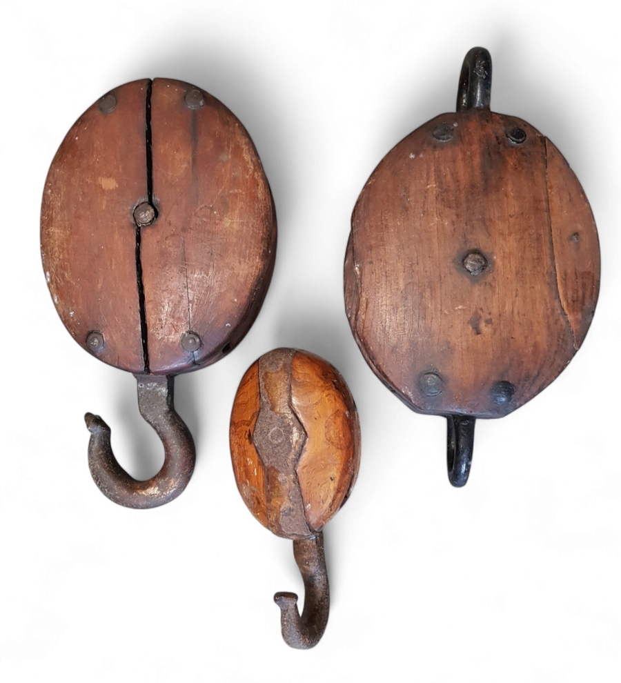 Houten scheepskatrollen, uitgevoerd in hardhout met ijzeren haken en beslag, omstreeks eind 19e eeuw tot begin 20e eeuw. De katrollen tonen een traditionele constructie met houten zijplaten, metalen bouten en ovale vormgeving. De katrollen waren bedoeld voor gebruik aan boord van schepen om touwen en lasten te geleiden en vertonen sporen van intensief gebruik. De scheepskatrollen zijn verschillend van formaat.