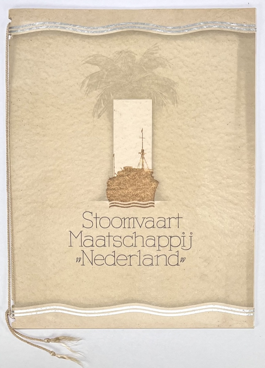Promotionele scheepvaartbrochure, circa jaren 1930-1939, uitgegeven door de Stoomvaart Maatschappij "Nederland". Gedrukt op papier met kartonnen omslag en koordbinding, voorzien van zwart-wit foto’s, illustraties en typografie in vroeg 20e-eeuwse stijl. Het boek toont passagiersschepen, interieurs en exotische bestemmingen, met ingeplakte kaart “Beleefd aangeboden door de N.V. Stoomvaart Maatschappij ‘Nederland’”.