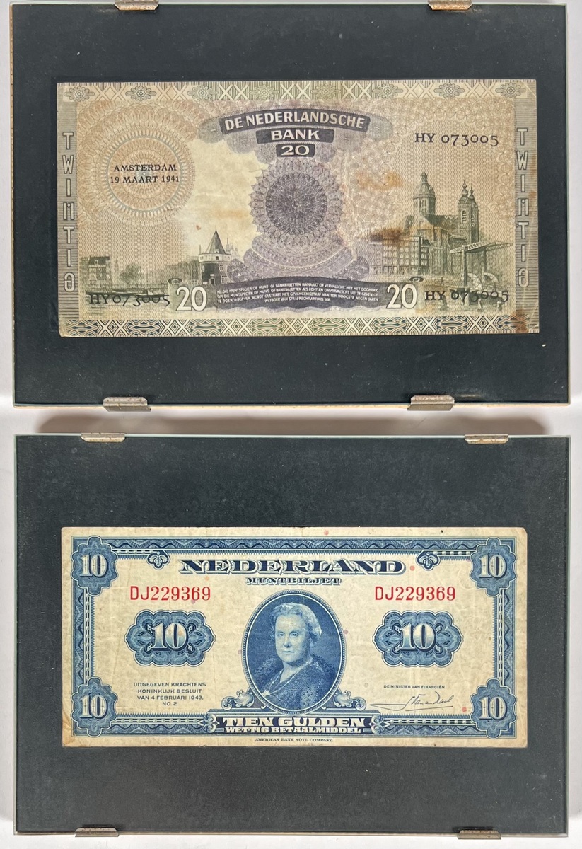 Twee Nederlandse bankbiljetten bestaande uit een 20 gulden biljet van De Nederlandsche Bank, gedateerd 19 maart 1941 en een 10 gulden muntbiljet, uitgegeven krachtens Koninklijk Besluit van 4 februari 1947. Beide biljetten zijn gedrukt op papier met hoge druktechniek en voorzien van serienummers HY073005 en DJ229369. Het 20 gulden biljet toont architectonische motieven, het 10 gulden biljet een portret in klassieke omlijsting.