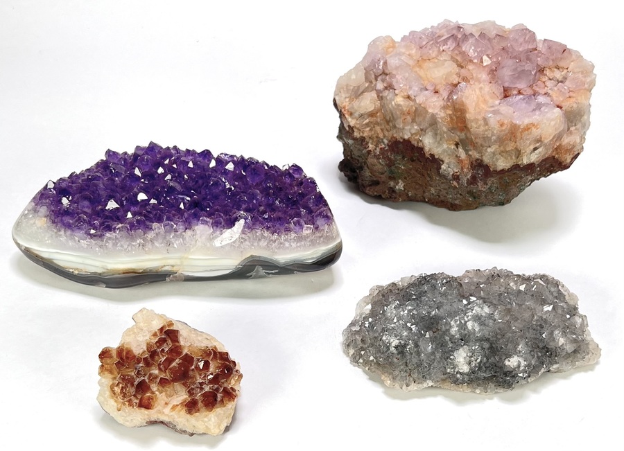 Set van vier mineralen bestaande uit diverse kwartsvarianten zoals amethist, citrien en chalcedoon, deels gepolijst en deels in ruwe vorm. De stukken tonen kristallijnen structuren met opvallende violette, roodbruine en grijze tinten. De techniek omvat breuk en polijsten van het gesteente.
