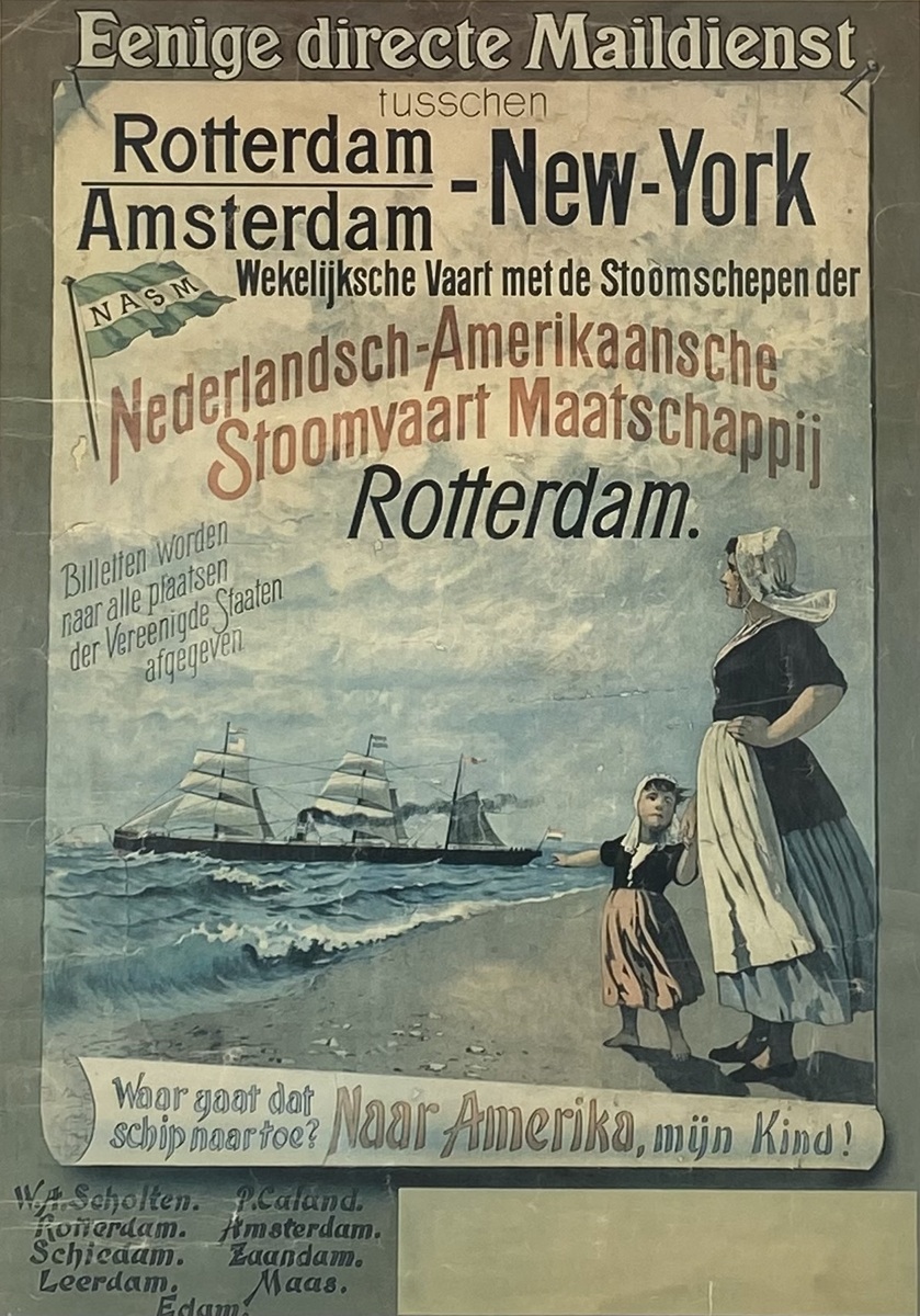 Reproductie reclameposter uit de vroege 20e eeuw voor de Nederlandsch-Amerikaansche Stoomvaart Maatschappij met “Enige directe Maildienst tusschen Rotterdam – New‑York”. De poster toont een vrouw en kind die naar stoomschepen kijken, met de tekst "Naar Amerika, mijn Kind!". Gedetailleerde afbeeldingen en commerciële informatie zijn aanwezig. De lithografische druk benadrukt de historische context van trans-Atlantische reizen.