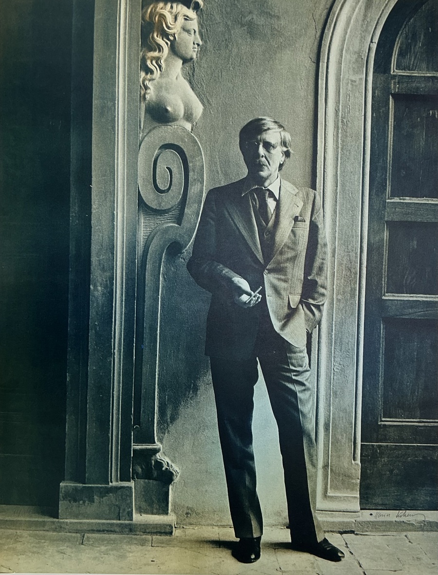 Foto van Karin Székessy (geboren 1939) getiteld Paul Wunderlich standing, 1974, uitgevoerd als analoge zwart-witafdruk met sepiatoning. Het portret toont kunstenaar Paul Wunderlich staand in een klassieke omgeving naast een sculpturale buste. Rechtsonder gesigneerd in potlood. Het werk is representatief voor Székessy’s artistieke portretfotografie uit de jaren 1970. Verso vermelding naam, titel en nummer.