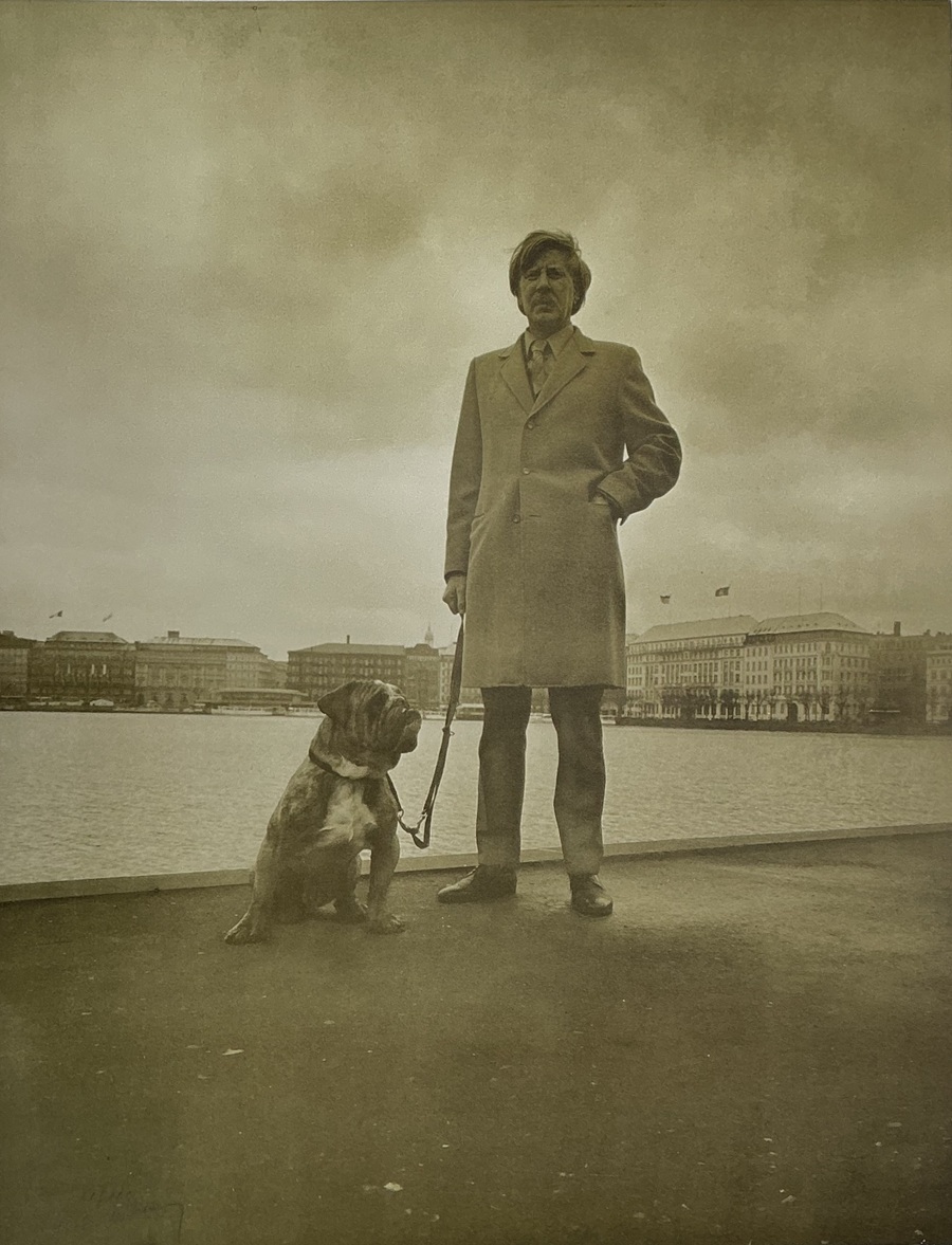 Foto van Karin Székessy (1939) getiteld "Wunderlich Hond", omstreeks 1970. Analoge zwart-witafdruk met warme toon, linksonder met potlood gesigneerd en voorzien van oplagenummer 10/100. De foto toont Paul Wunderlich staand met een hond aan een lijn, met stedelijke bebouwing en water op de achtergrond. Verso vermelding naam, titel en nummer.