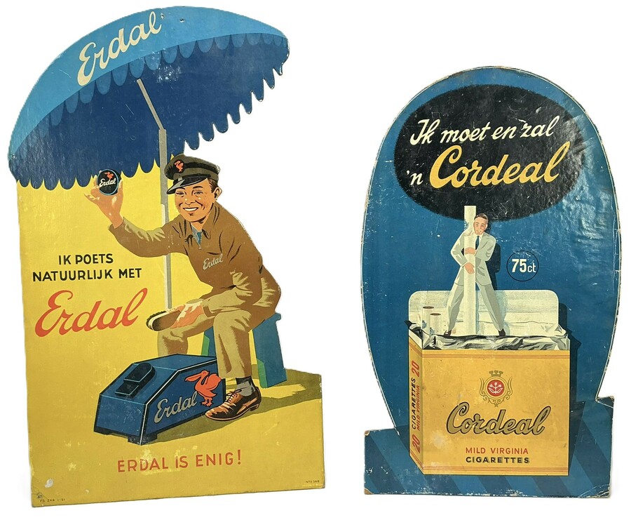 Twee vintage kartonnen toonbankdisplays voor Erdal schoenpoets en Cordeal sigaretten, uitgevoerd in meerkleurige lithografie op karton. De ontwerpen tonen illustratieve reclameafbeeldingen met Nederlandse teksten en een geïntegreerde standaard aan de achterzijde. Het betreft reclamemateriaal uit het midden van de 20e eeuw, kenmerkend voor de commerciële grafische stijl van die periode.