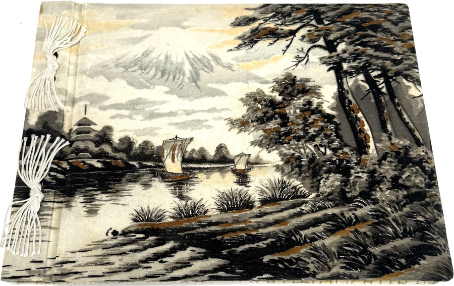 Een vintage fotoalbum uit circa 1930 met een textiel omslag. De omslag is bedrukt met een Japanse landschapsillustratie; de berg Fuji, een tempel en boten. Het ongebruikte album heeft aan de binnenzijde zwarte en witte kartonnen bladen met beschermende tussenvellen en een touwsluiting. Gebonden met witte koorden langs de rugzijde,