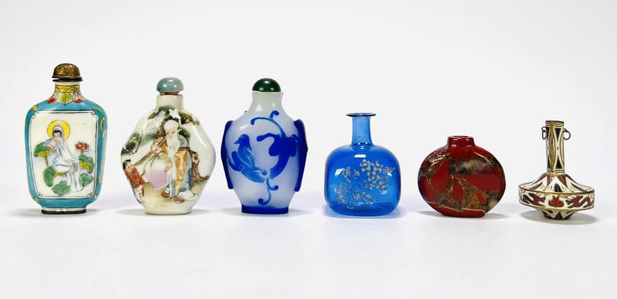 Een collectie van zes kleine odeurflesjes vervaardigd van porselein, glas en metaal, uitgevoerd met handbeschilderde voorstellingen en gravures. De flesjes tonen Chinese invloeden met decoraties van figuren, florale motieven en abstracte patronen. Datering omstreeks midden 20e eeuw.