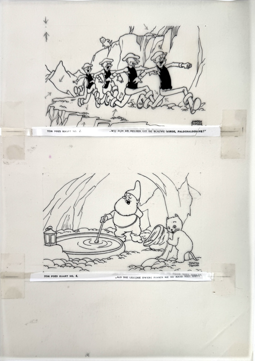 Twee originele fotocellen van Marten Toonder (1912–2005), uitgevoerd in inkt op transparant materiaal, met scènes uit de Tom Poes-serie. Beide cellen tonen karakteristieke stripfiguren en zijn rechtsonder gesigneerd. De fotocellen bevatten onderschriften met kaartnummers en tekst. De tekeningen zijn voorbeelden van de bekende Nederlandse stripkunst uit midden 20e eeuw en tonen Toonders herkenbare stijl.