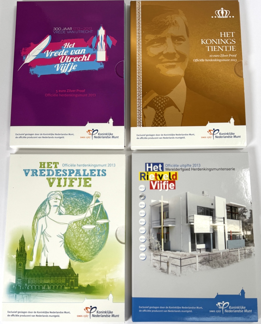 Vier Nederlandse zilveren herdenkingsmunten, alle daterend uit 2013. De munten zijn geslagen in proof kwaliteit en zijn ontworpen door onder anderen Merel van de Loo, Wim Quist en Stani Michiels. De munten herdenken diverse thema's, waaronder de inhuldiging van Koning Willem-Alexander, 300 jaar Vrede van Utrecht en 100 jaar Vredespaleis. Alle munten in officiële mappen van de Koninklijke Nederlandse Munt.