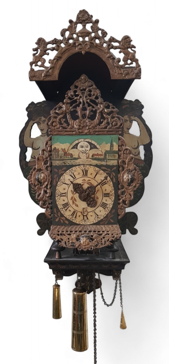Houten stoelklok met rijk uitgesneden ornamentiek, beschilderde maanstand en Romeinse wijzerplaat, gedateerd omstreeks eind 19e eeuw. De klok toont barokke leeuwen- en figuratieve motieven en een straattafereel met maanduiding. Functionele wandklok uit historische periode.